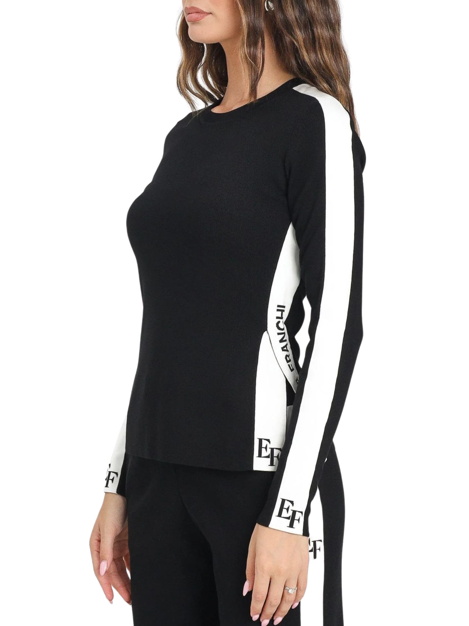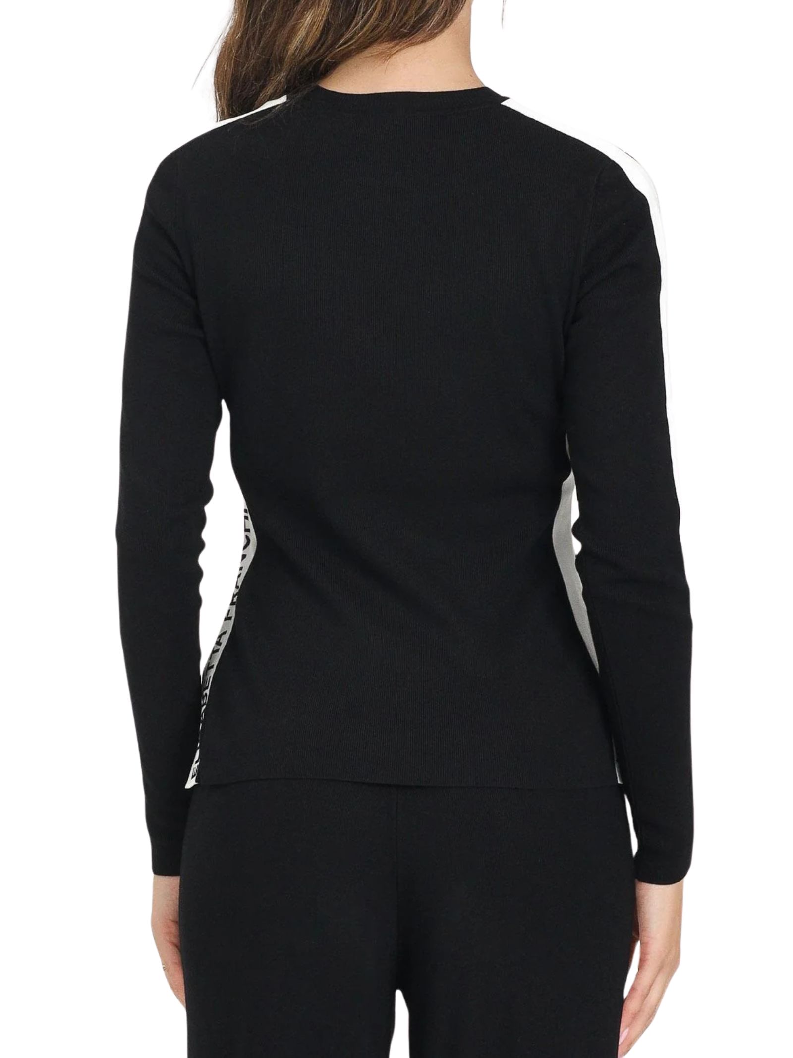 Modello a manica lunga con bande in viscosa lucida a contrasto. Vestibilità aderente. Spacco laterale. 82% Viscosa 18% Poliammide