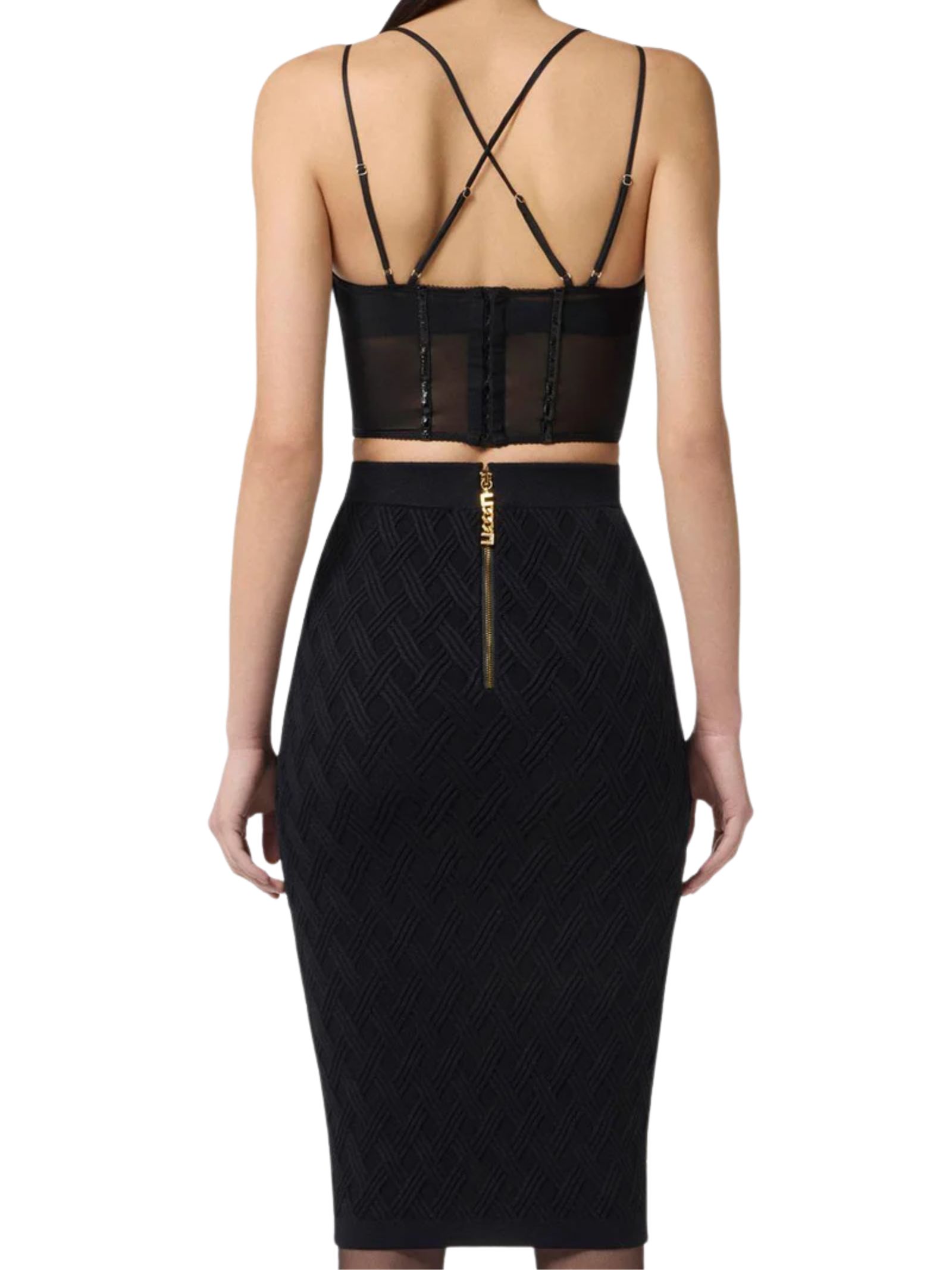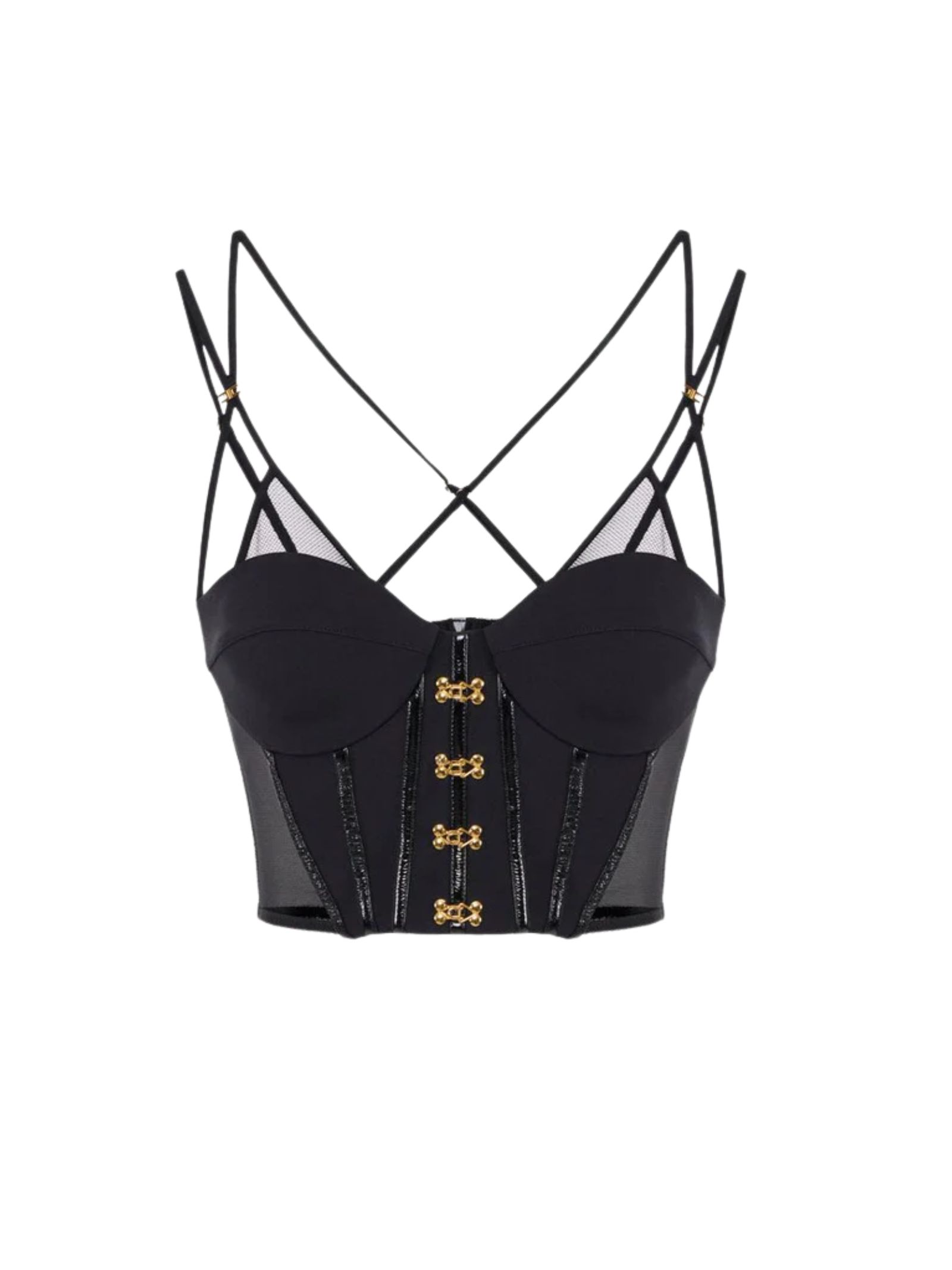 Top Elisabetta Franchi in neoprene dalla vestibilità aderente con spalline incrociate in raso. Presenta luminosi dettagli in vinile e inserti in tulle che creano raffinate trasparenze. I ganci in metallo dorato aggiungono note di luce. Spalline regolabili. Chiusura con ganci. Composizione 72%Poliammide 28%Elastane