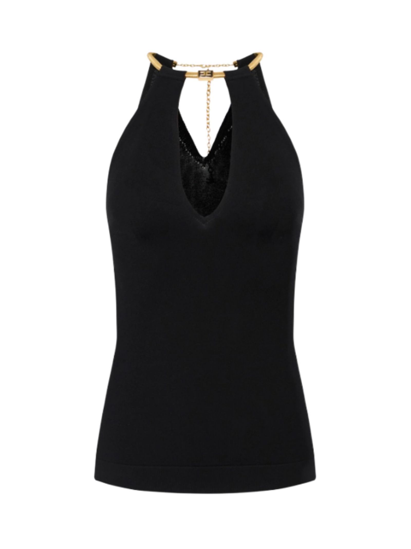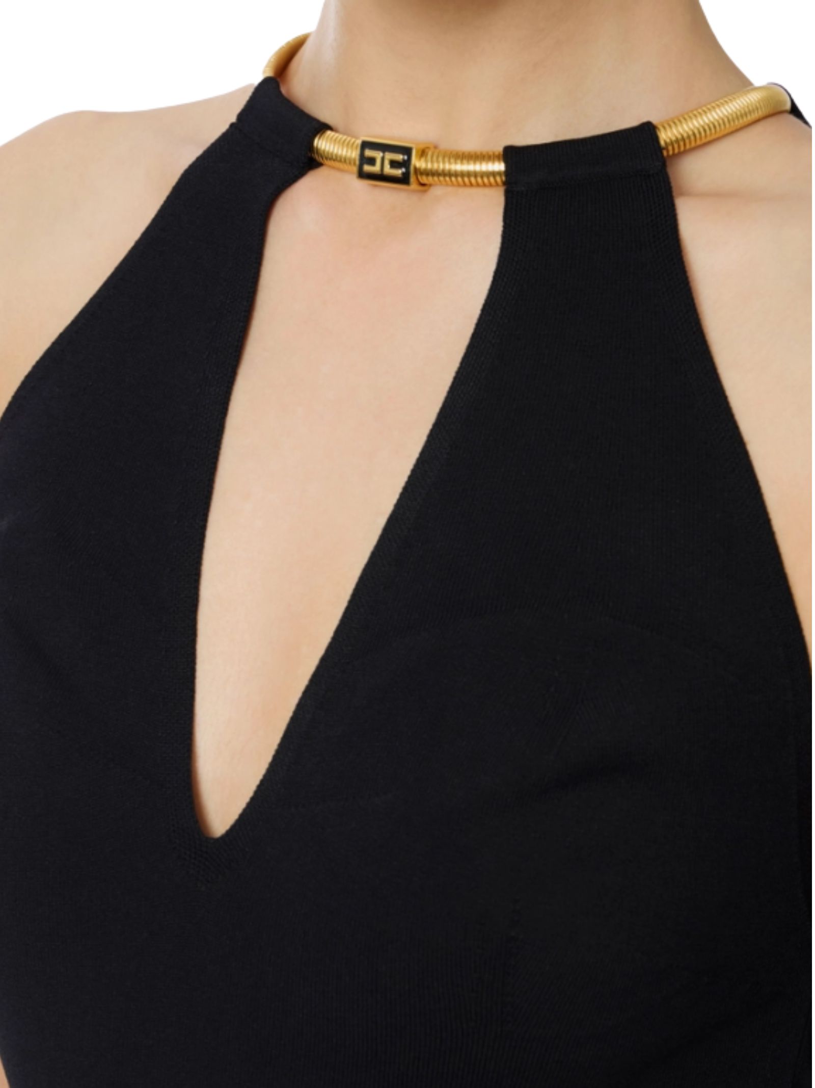 Top in maglia Elisabetta Franchi dalla vestibilità aderente. Ha scollo profondo all'americana sul davanti e sul retro. Si distingue per la collana in trama snake con logo, amovibile e flessibile per sperimentare molteplici opzioni di styling. Composizione 83%Viscosa 17% Poliestere