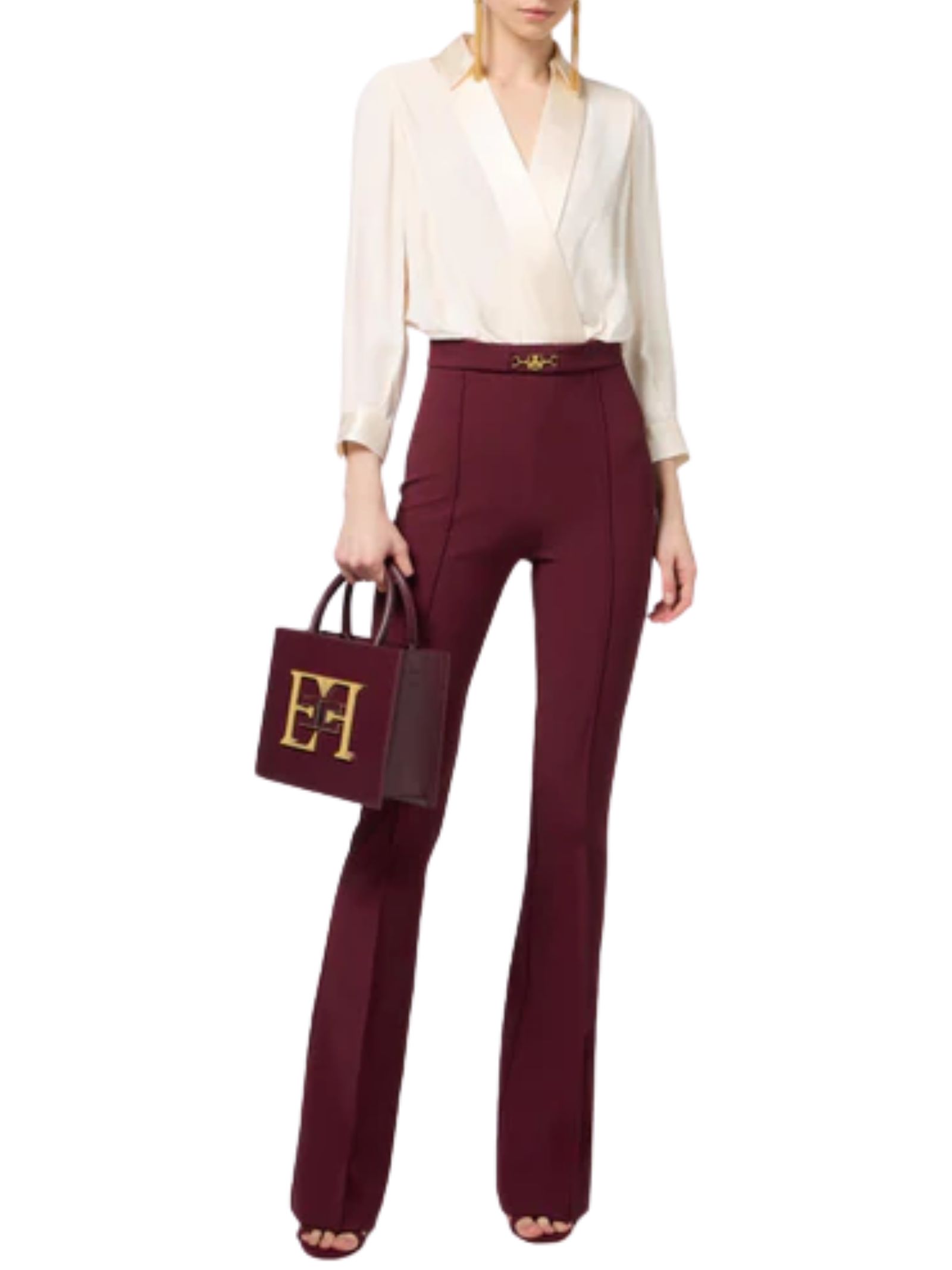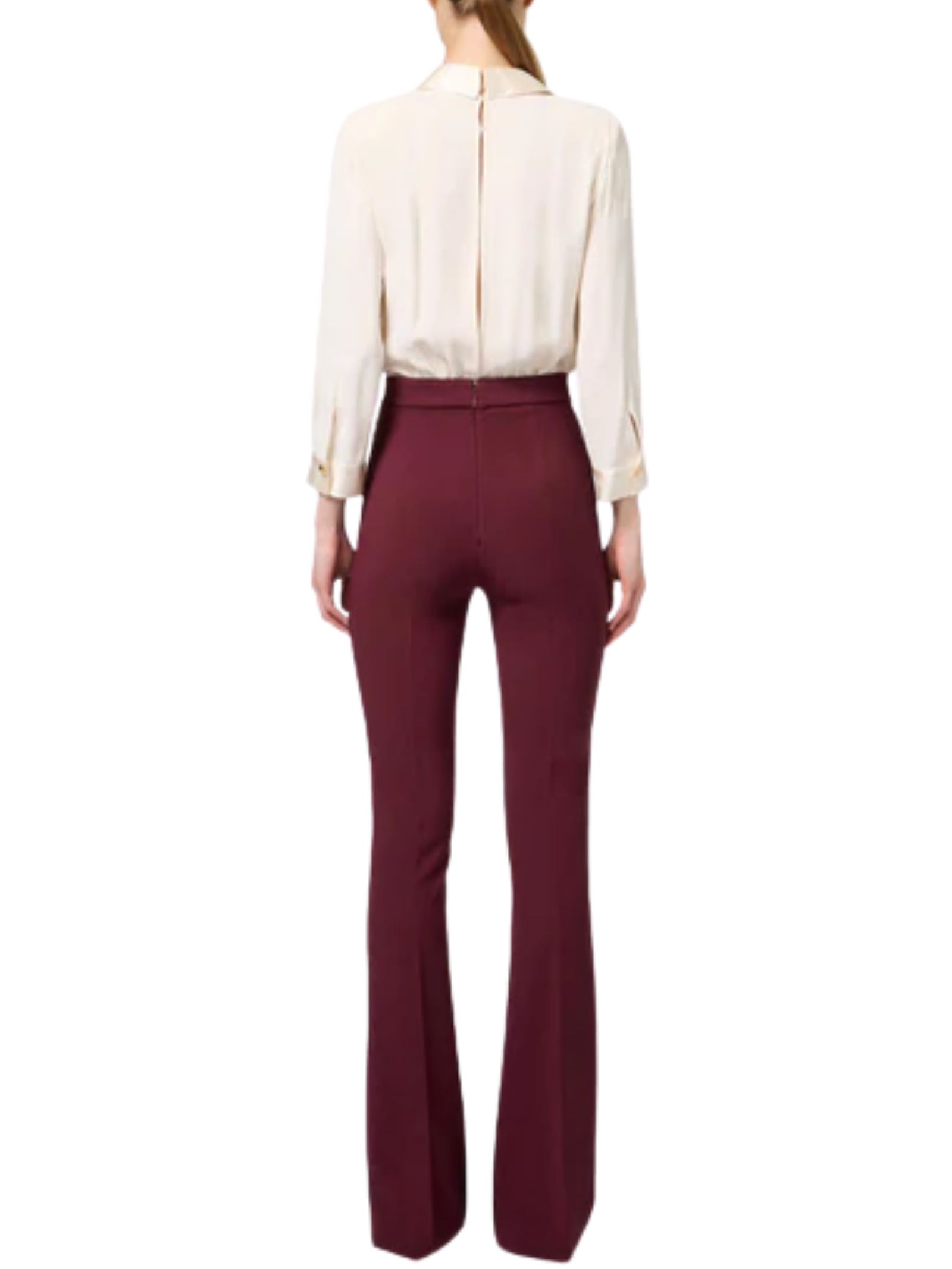 Tuta in viscosa composta da camicia incrociata in doppia georgette con maniche a 3/4 e pantalone dritto leggermente svasato al fondo in crêpe stretch, impreziosita da morsetto logo in metallo dorato applicato sul fascione. Composizione: 100% Viscosa.