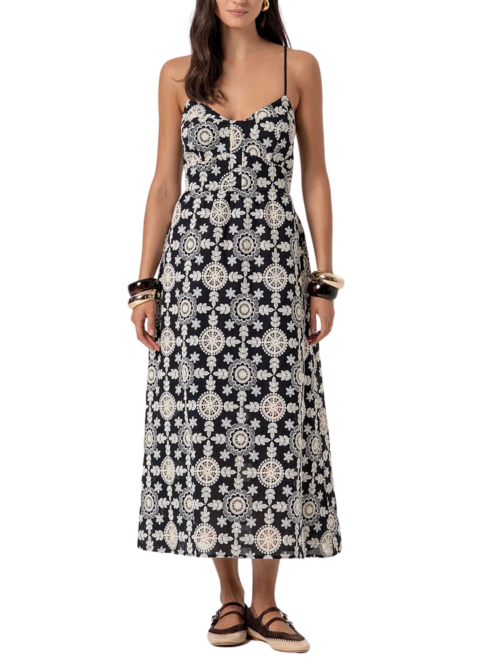 Abito midi in puro cotone con romantica fantasia floreale, perfetto per la stagione estiva. Il design presenta uno scollo a corpetto che valorizza il décolleté, arricchito da sottili bretelline e una linea senza maniche per un look fresco e femminile. La gonna ampia dona movimento e leggerezza, rendendolo ideale per viaggi e occasioni informali ma curate. Composizione: 100% cotone.