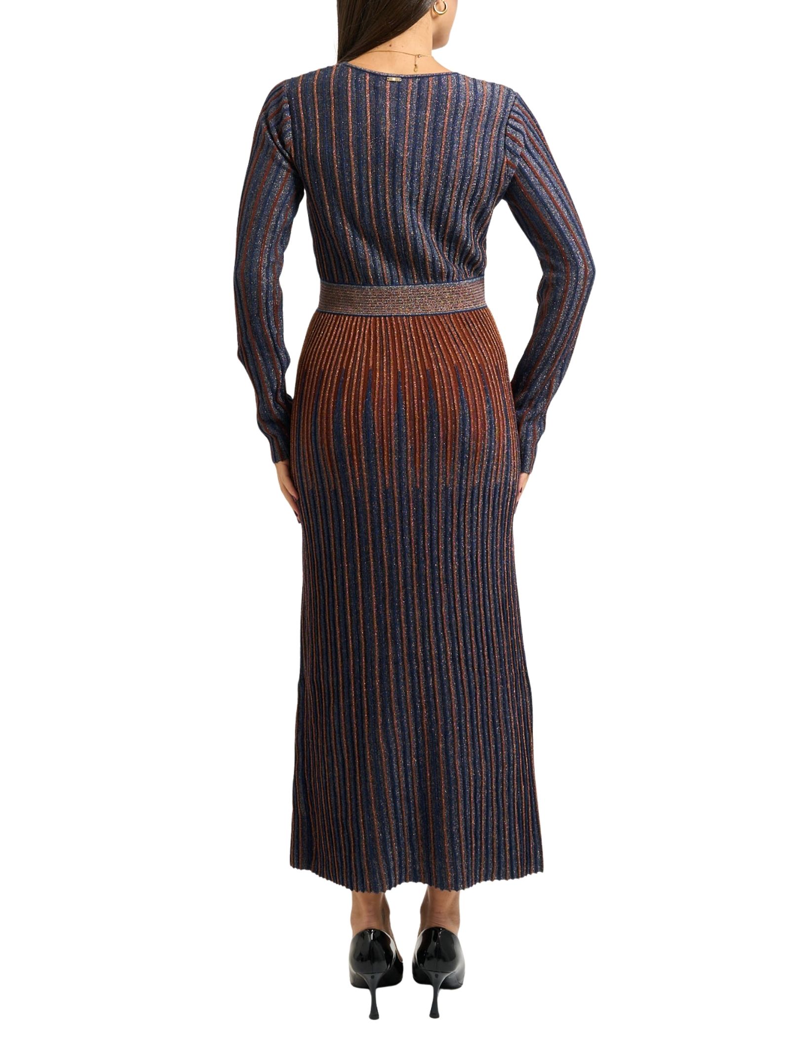 Abito midi per donna firmato Fracomina in misto lana e lurex. Scollo a incrocio, maniche lunghe, fascia in vita. Regular fit. La modella è alta 1.65m e porta una S. Composizione: 6% lana, 10% lurex, 84% altri materiali