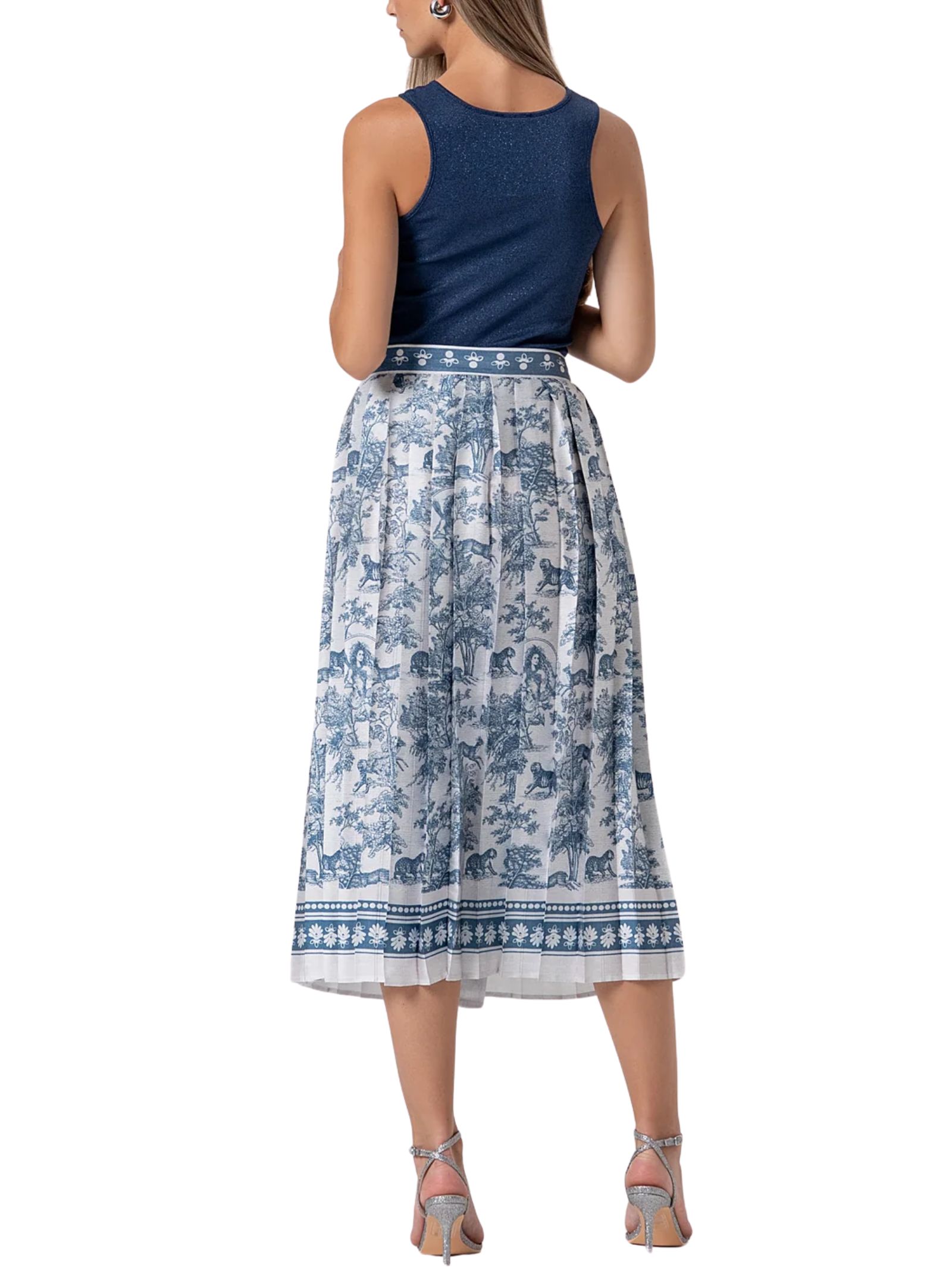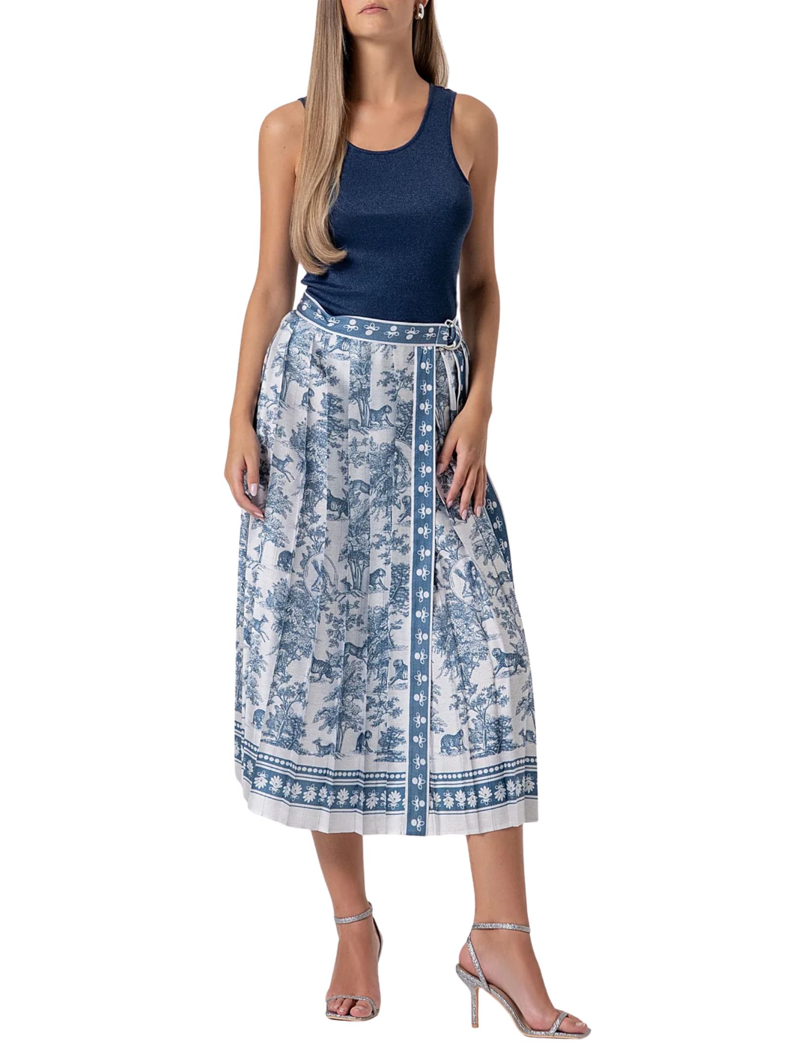 Gonna midi a portafoglio in fantasia, caratterizzata da una silhouette flare che dona movimento e leggerezza. Il design presenta una vita regolare con allacciatura sul fianco, che permette una vestibilità regolabile e confortevole. Il tessuto plissettato aggiunge un tocco dinamico ed elegante, perfetto per look urbani dallo stile contemporaneo. Composizione: POLYESTER 57% RAYON 43%.
