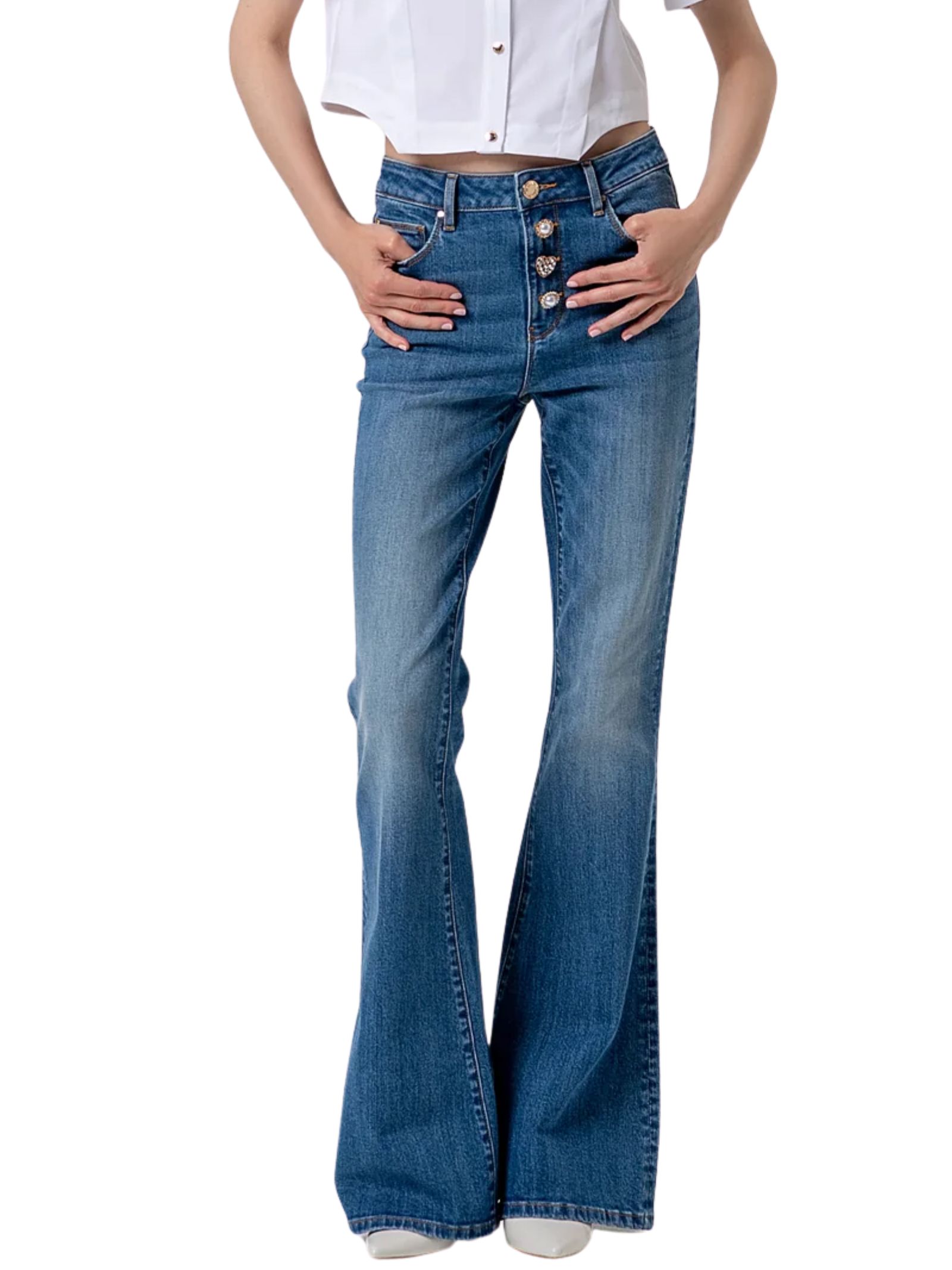 Jeans bootcut in denim con lavaggio vintage,tessuto resistente ed elastico, piacevole da indossare e confortevole per tutta la giornata, per look casual e outfit estivi, vita alta e bottoni gioiello a vista, 5 tasche classiche e fondo ampio. Composizione: 98% cotone, 2% spandex.