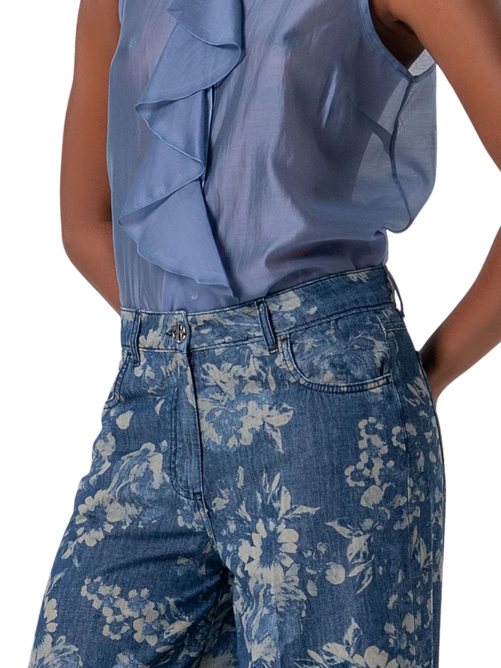 Jeans flare wide leg in denim con fantasia floreale, tessuto resistente ed elastico, piacevole da indossare e confortevole per tutta la giornata, ideale per look casual e outfit estivi; vita regolare, cinque tasche, chiusura con zip e bottone e fondo ampio che valorizza la silhouette. Composizione: 100% cotone.