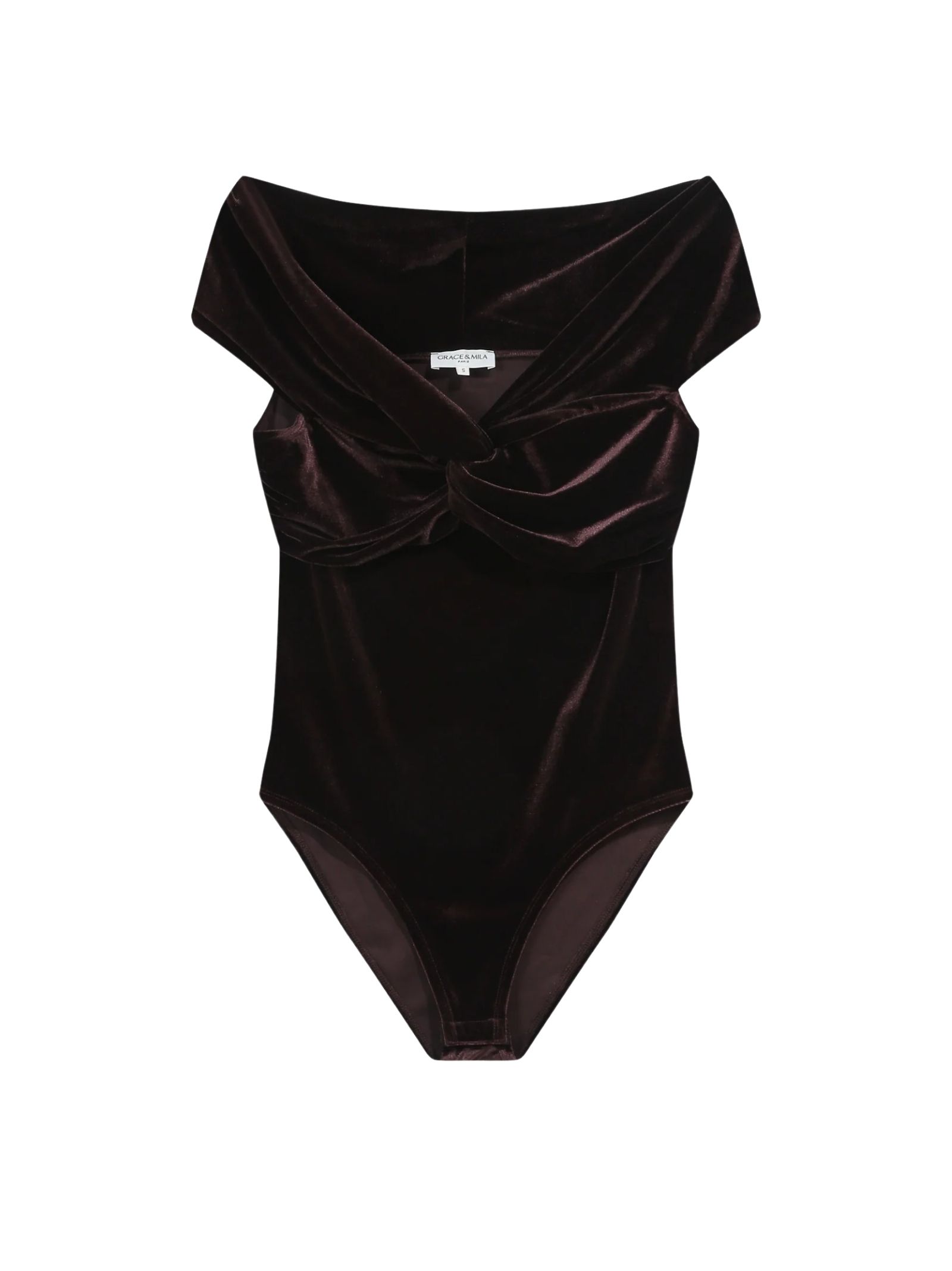 Body aderente Grace & Mila in velluto, senza maniche con scollatura intrecciata e spalle scoperte, caratterizzato da effetto drappeggiato e taglio aderente che valorizza le curve per una silhouette elastan.
