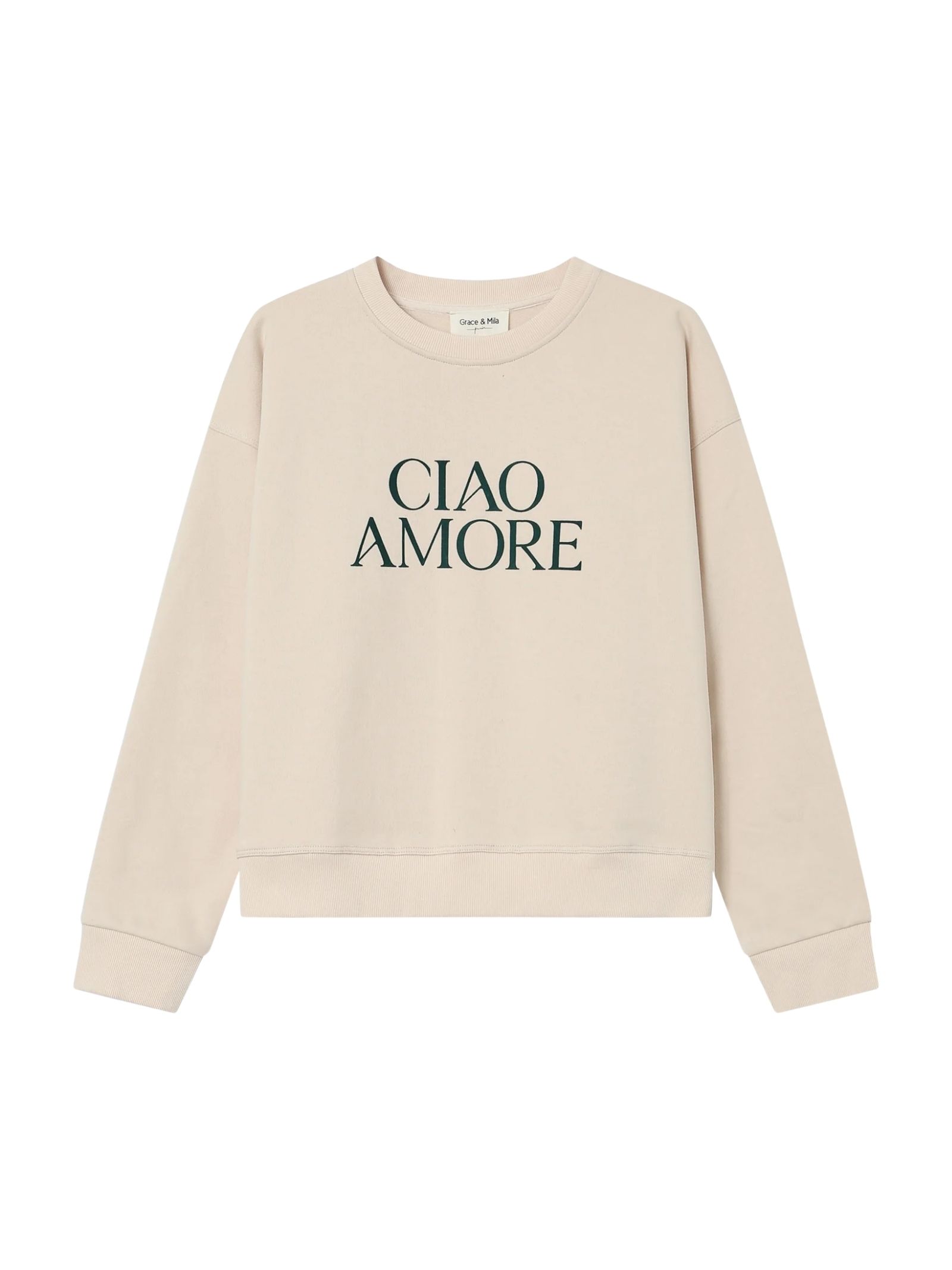 Felpa Grace & Mila con scritta "Ciao Amore" in velluto sul davanti, vestibilità comoda, maniche lunghe e spalle scese per un look casual, con polsini, colletto e orlo a costine per una silhouette strutturata, realizzata in 100% cotone.