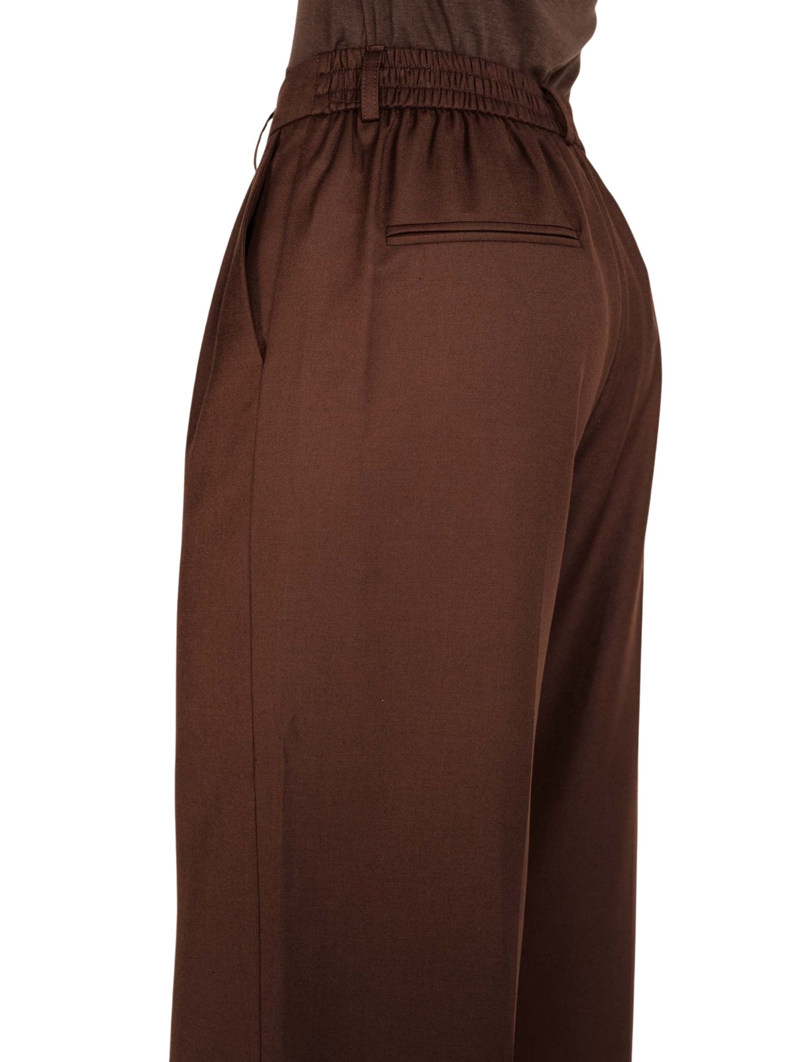 Pantaloni a vita alta Grace & Mila dal taglio dritto e ampio per una silhouette elegante e minimalista, con elastico in vita, pieghe frontali e finta patta, tasche allitaliana e finte tasche a filetto sul retro, realizzati in 62% poliestere, 25% viscosa e 13% lana.