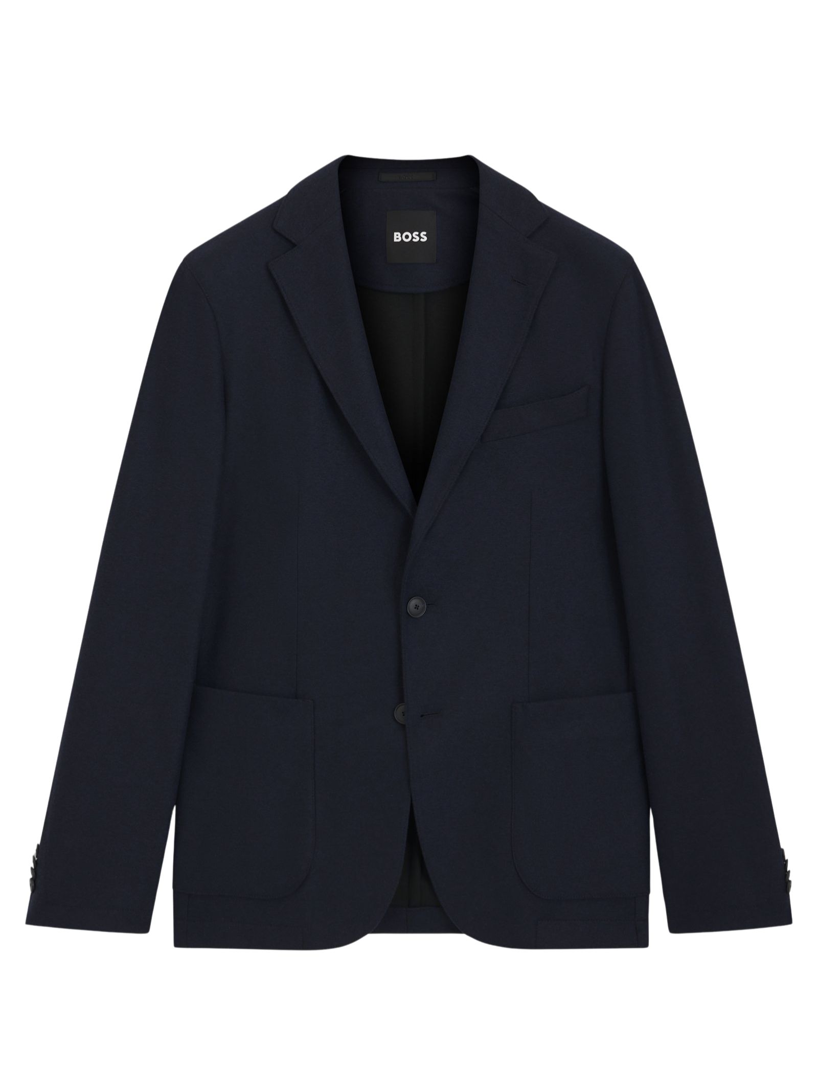 Giacca blu BOSS Uomo in misto lana, lavabile in lavatrice, realizzata in calda flanella spazzolata con tessuto elasticizzato per garantire il massimo comfort; presenta un moderno taglio slim fit ed è composta da 25% viscosa, 32% poliestere, 25% poliammide, 14% lana e 4% elastan, con fodera in 60% poliammide e 40% poliestere e fodera manica in 95% poliestere e 5% elastan.
