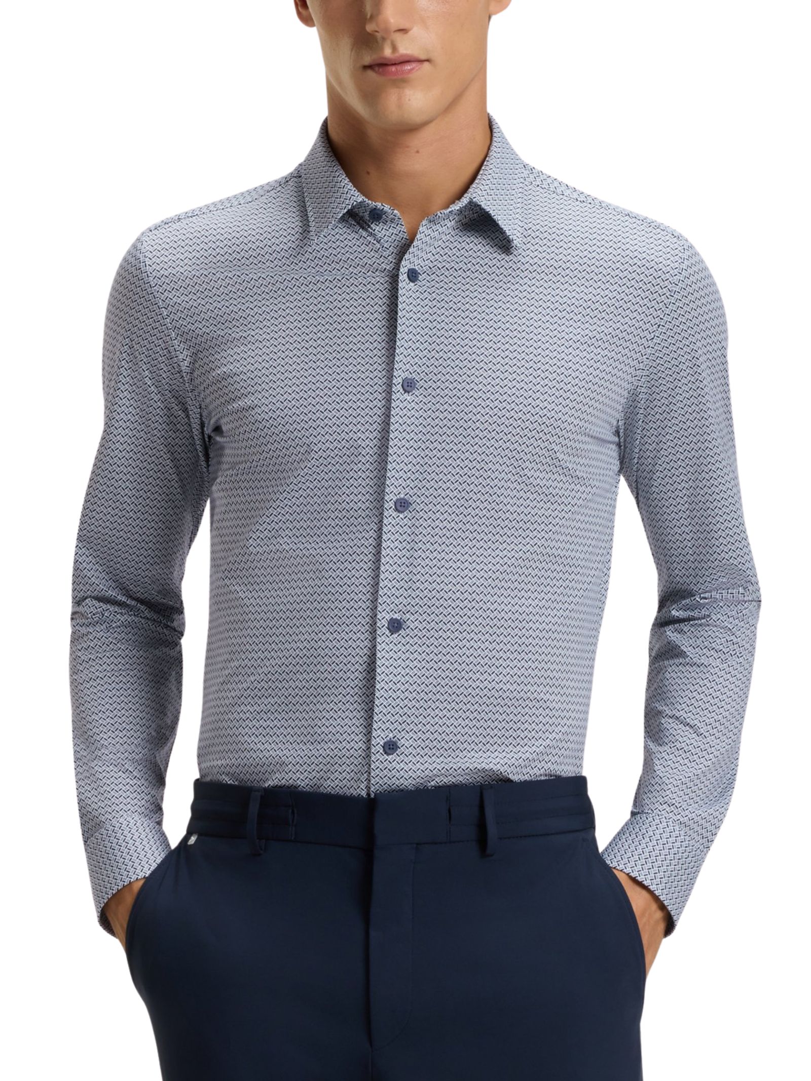 Camicia BOSS Menswear slim fit in tessuto italiano con comfort elasticizzato e gestione dell'umidità, caratterizzata da stampa contemporanea, colletto Kent, polsini rotondi e lunghezza standard; composta da 87% poliammide e 13% elastan.