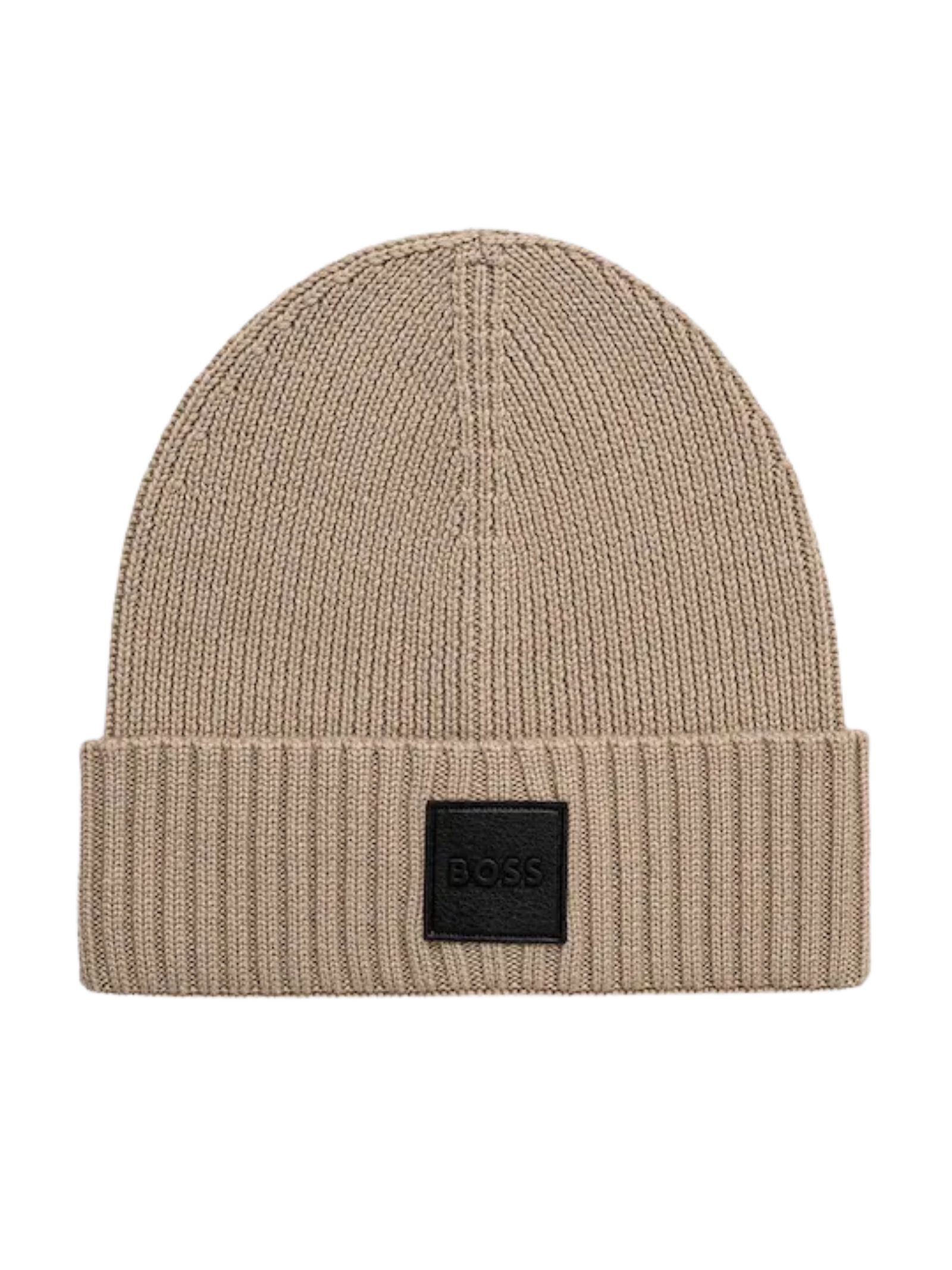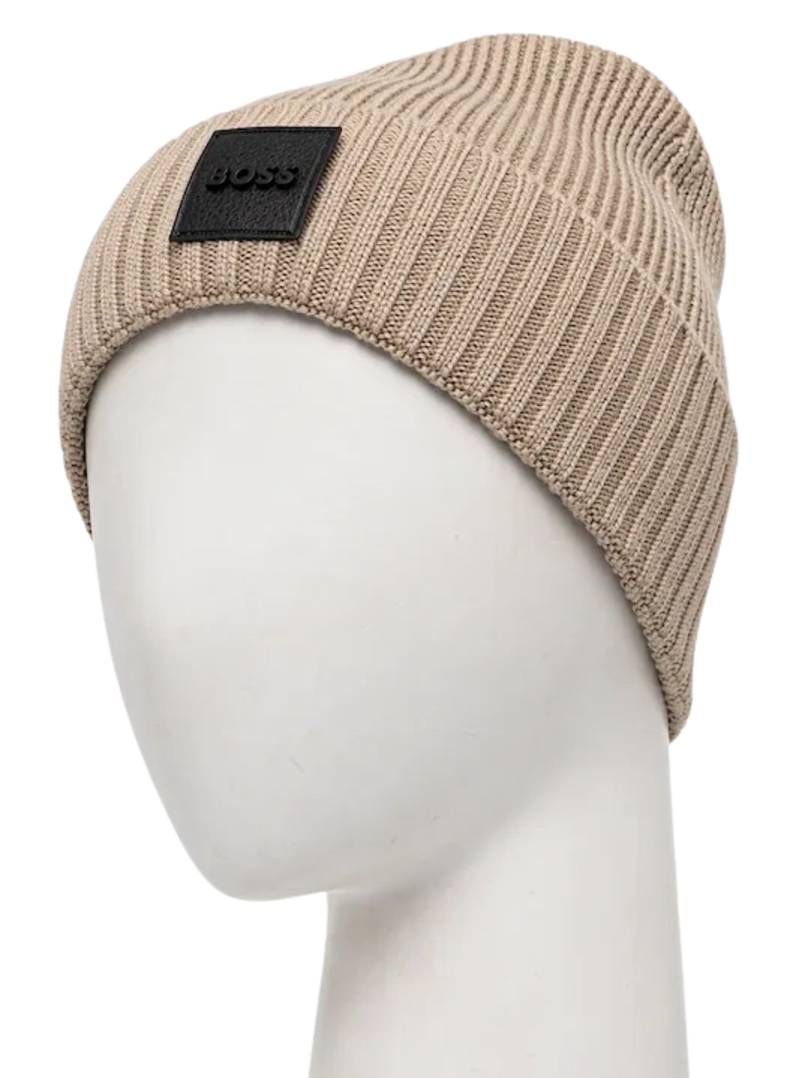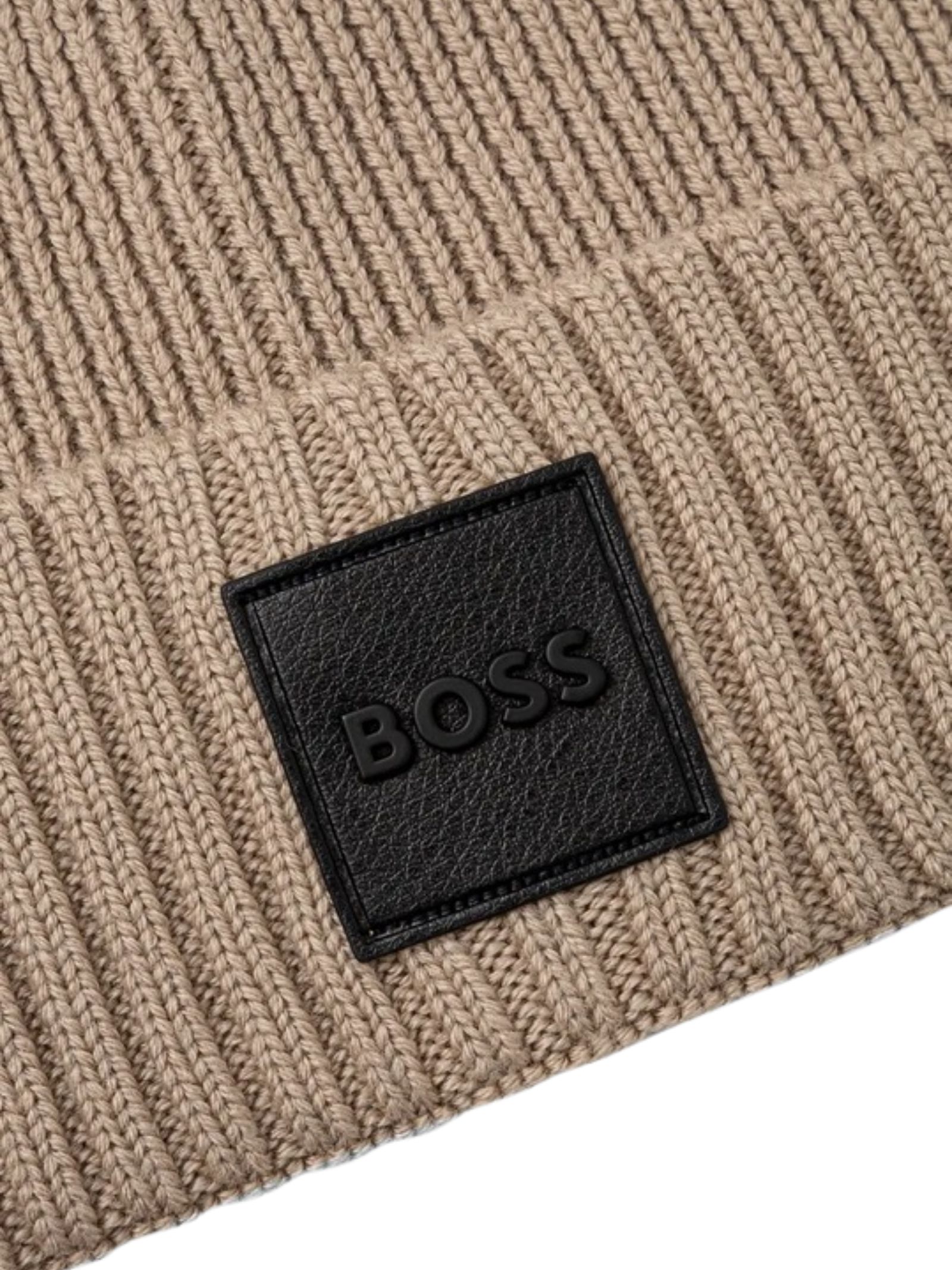 Cappello BOSS beige realizzato in maglia a tinta unita. Stile a berretto con tessuto elasticizzato a costine che garantisce una vestibilità aderente. Il design con polsini offre una protezione aggiuntiva contro il freddo. Realizzato in tessuto elasticizzato a maglia fine.