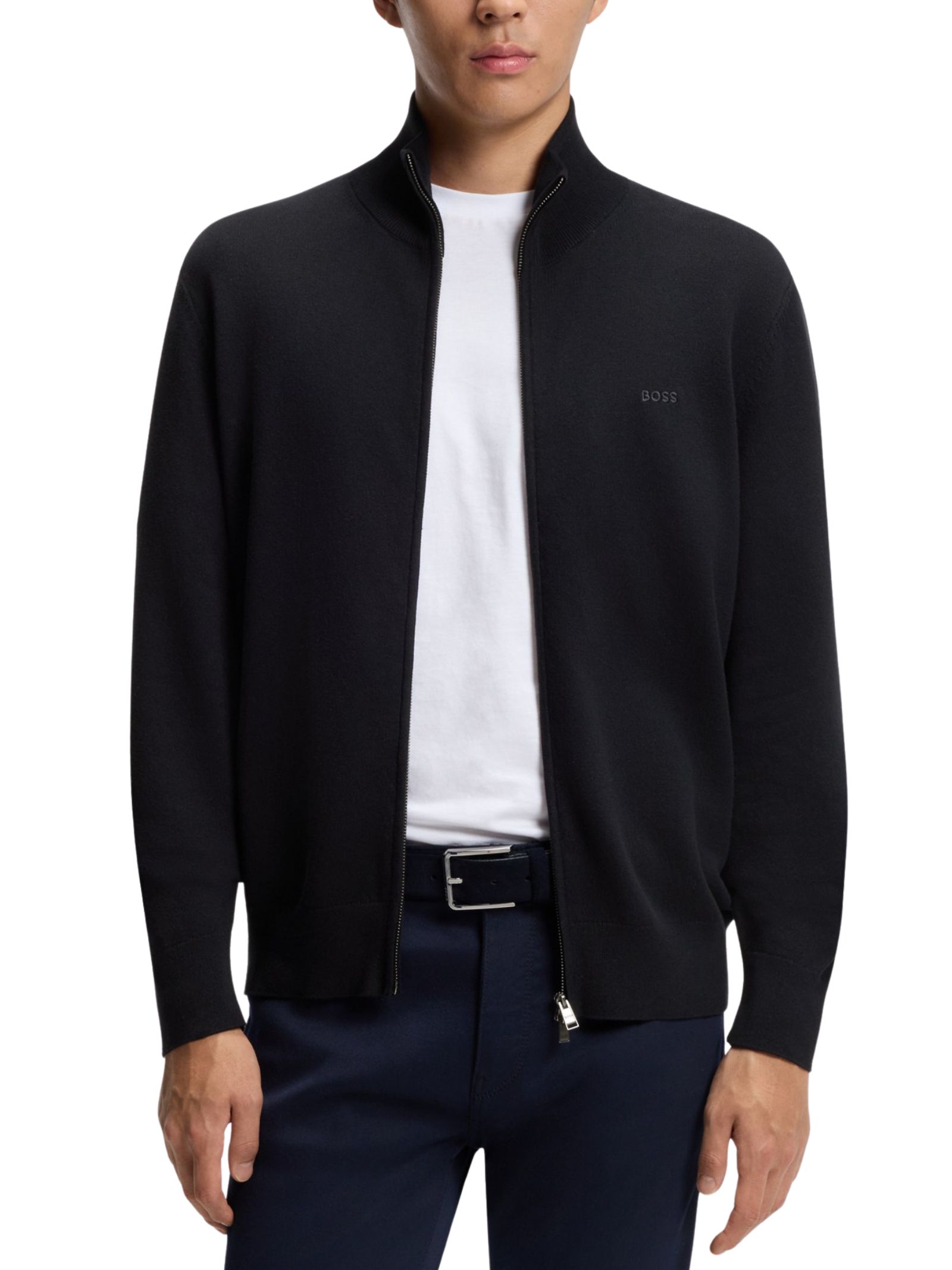 Cardigan con zip integrale realizzato in morbidissimo cotone per un comfort ottimale. Il design a collo con zip, maniche lunghe e lunghezza standard è completato dal logo tono su tono, per un tocco discreto di stile. La vestibilità regular fit garantisce una linea equilibrata e confortevole. Il capo è composto per almeno l'80% da materie prime di alta qualità, con cotone proveniente da agricoltura rigenerativa, che favorisce la biodiversità, tutela le risorse idriche e migliora la salute del suolo. Composizione: 100% cotone.