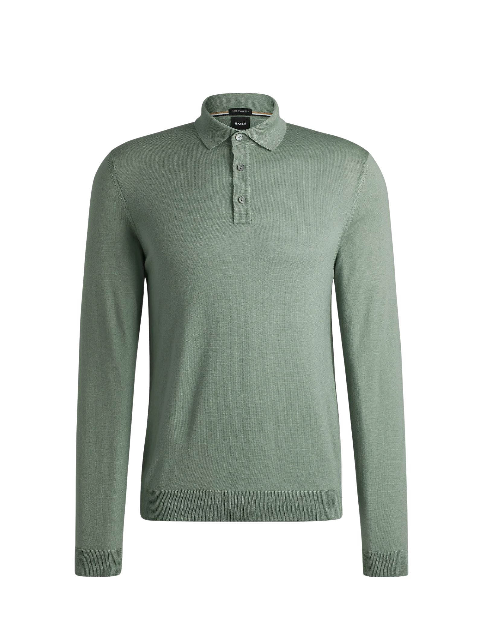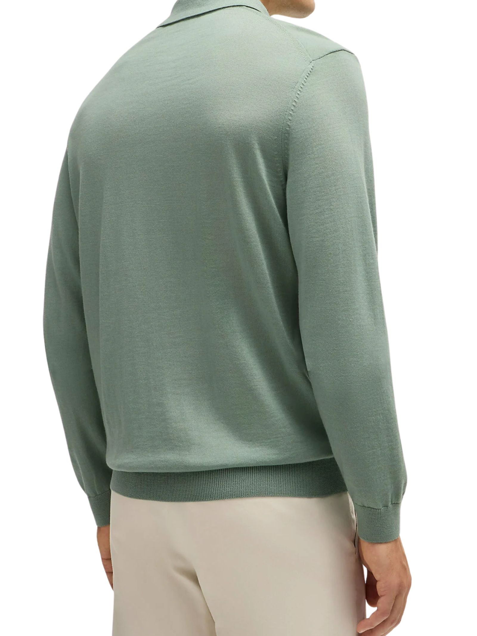 Polo Boss "Lancione" uomo, colore verde chiaro , in pura lana vergine 100%, maniche lunghe, colletto classico con chiusura a bottoni ,bordi a costine, regular fit.