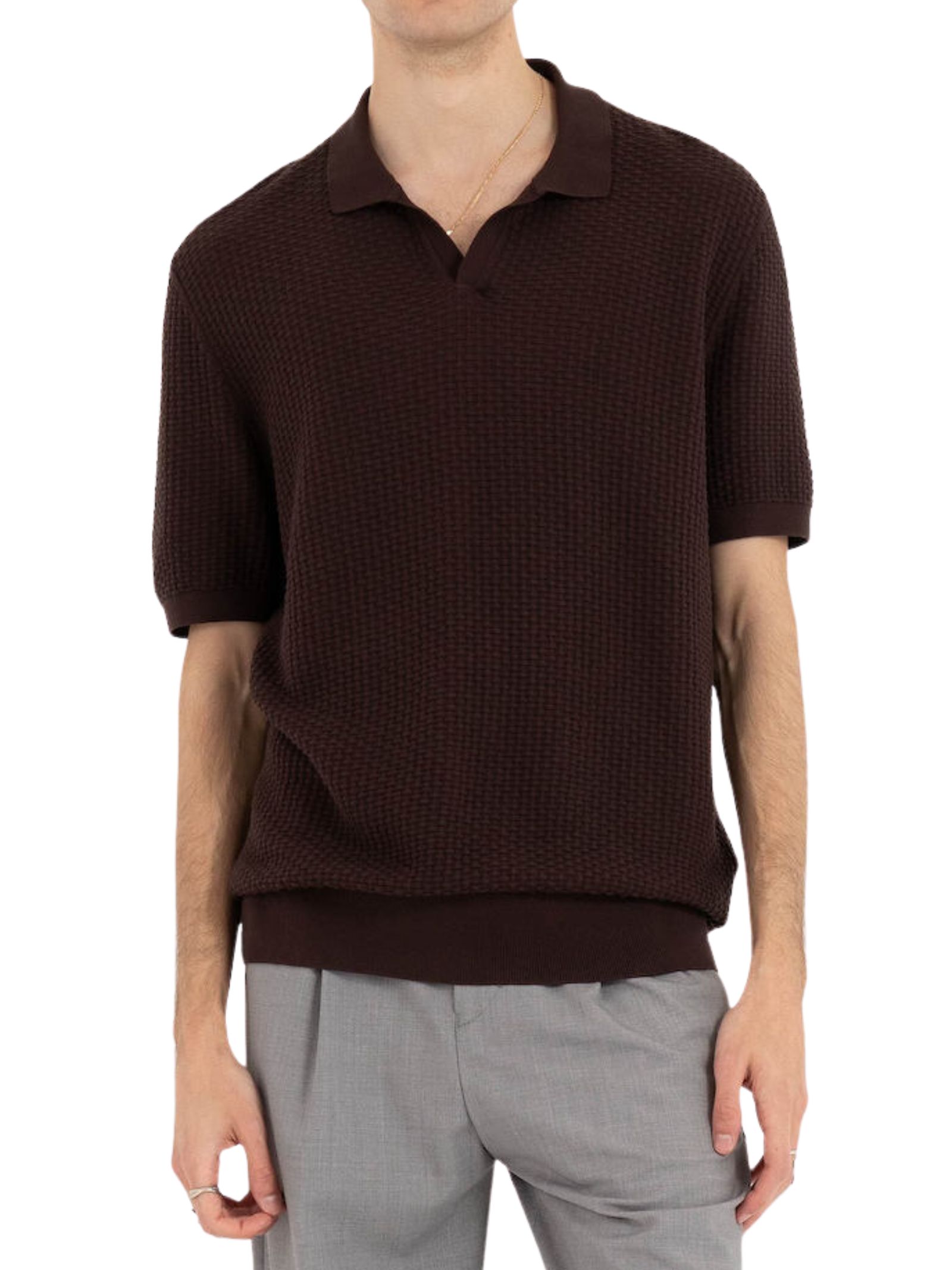 Maglia a maniche corte con scollo realizzata in 100% cotone dal motivo strutturato, garantendo comfort e traspirabilità per tutto il giorno; vestibilità regular e lunghezza standard.