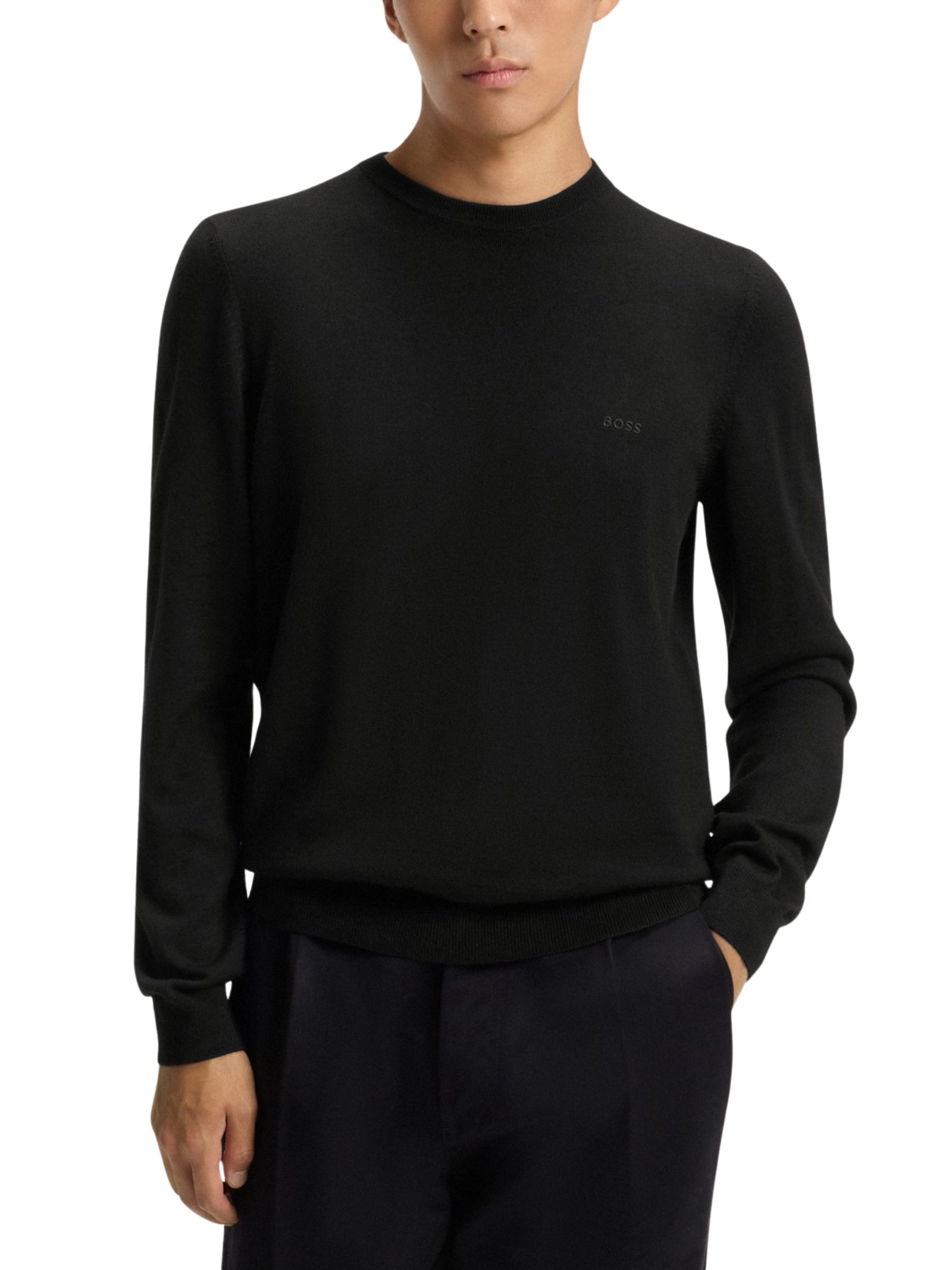 Maglioncino nero BOSS Menswear realizzato in 100% lana vergine e rifinito con logo ricamato. Presenta vestibilità regolare, girocollo, maniche lunghe, polsini a coste e lunghezza standard.