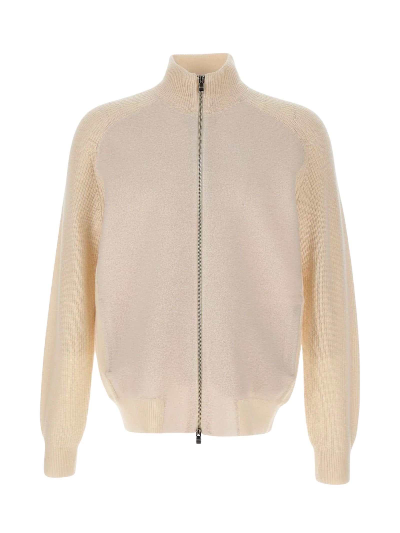 Maglia da uomo BOSS in tessuto bimaterico di lana color panna, dotata di colletto in piedi, chiusura full zip, tasche laterali a filo e bordi a costine per una vestibilità comoda e moderna. Le spalle scese e il taglio relaxed fit conferiscono uneleganza rilassata e contemporanea.