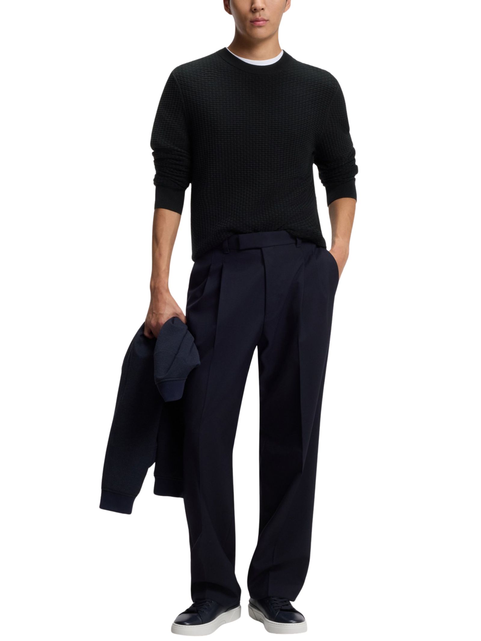 Maglione dallo stile classico ed elegante, realizzato con cura artigianale in morbido cotone di alta qualità; dalla lavorazione strutturata, design girocollo con maniche lunghe, polsini a costine e lunghezza standard garantisce comfort e versatilità, mentre la vestibilità regular fit assicura una linea equilibrata. Il capo è composto per almeno l'80% da materie prime di qualità superiore, con cotone proveniente da agricoltura rigenerativa, una scelta sostenibile che favorisce la biodiversità, tutela le risorse idriche e migliora la salute del suolo. Composizione: 100% cotone.