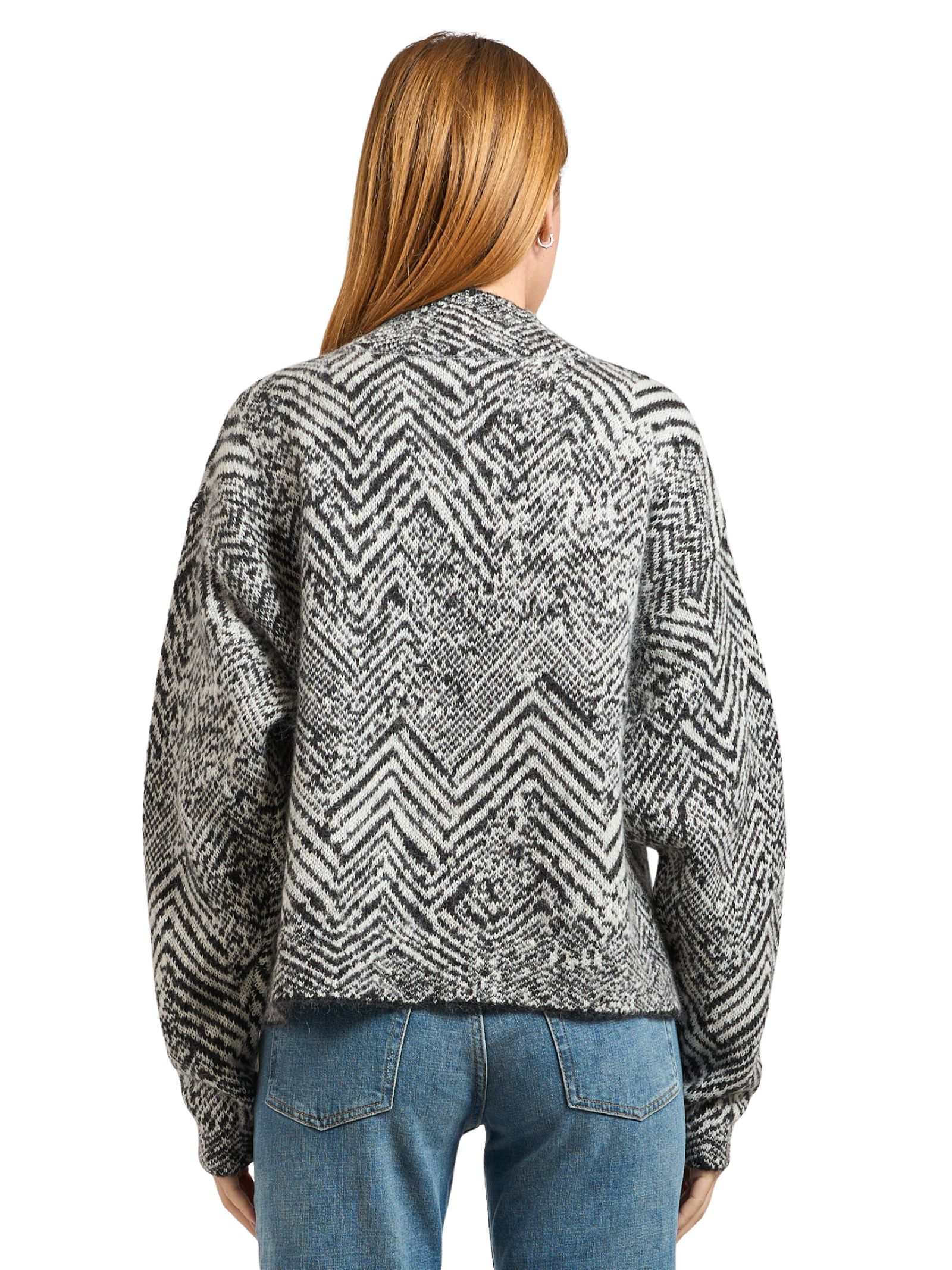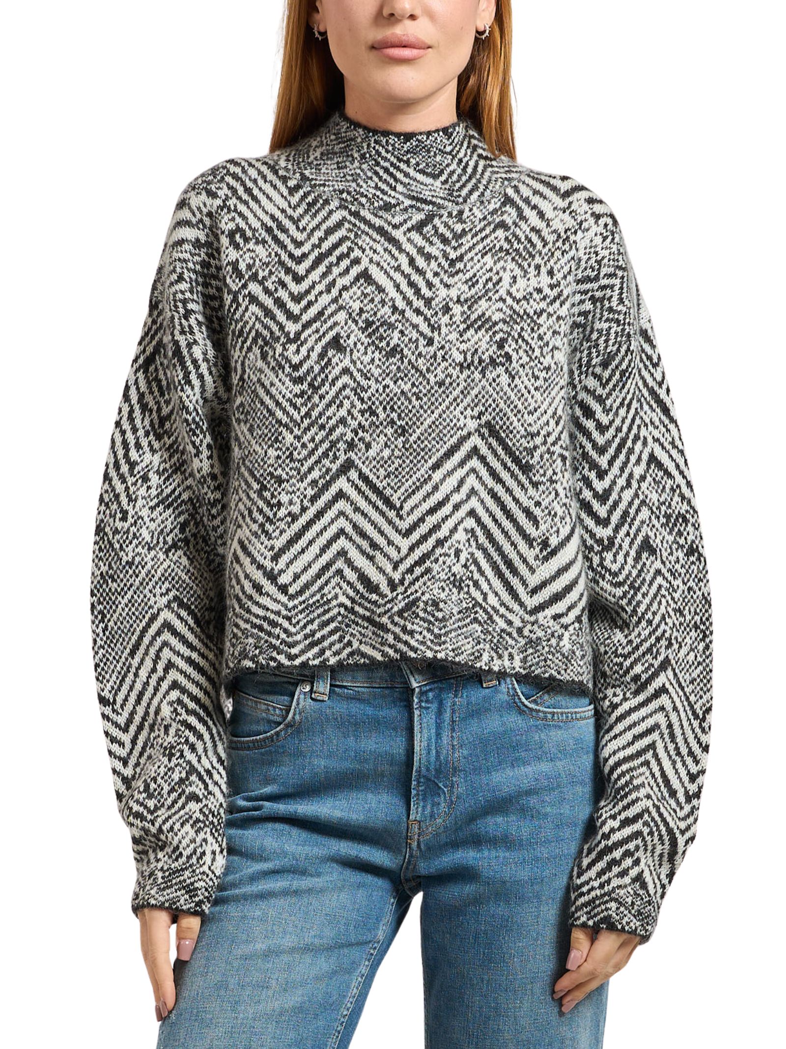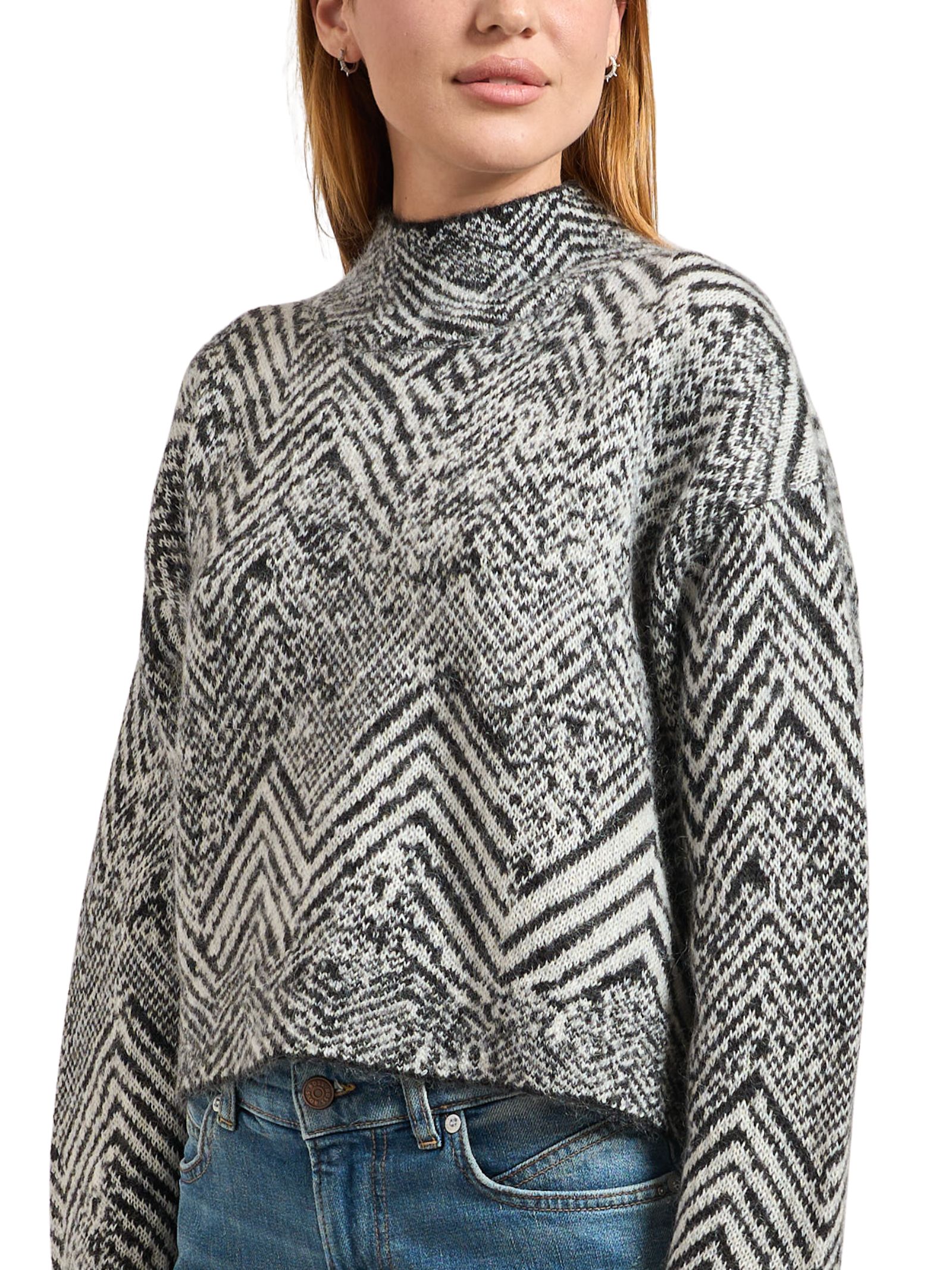 Maglione bianco e nero da donna BOSS a fantasia con vestibilità regular fit, realizzato in misto lana (55% Mohair, 15% Lana, 30% Poliestere), presenta un mezzo collo e un taglio più corto sul davanti.