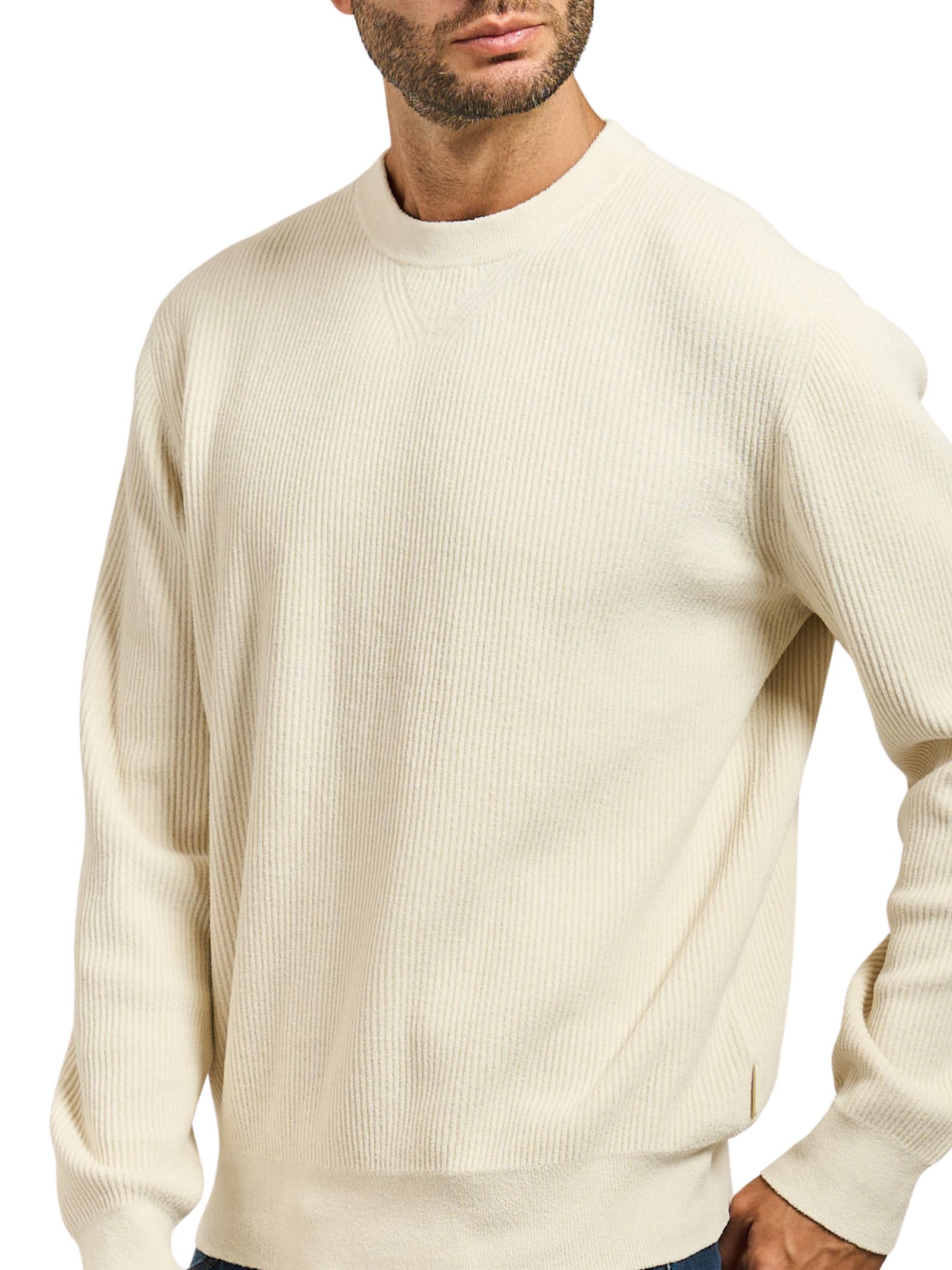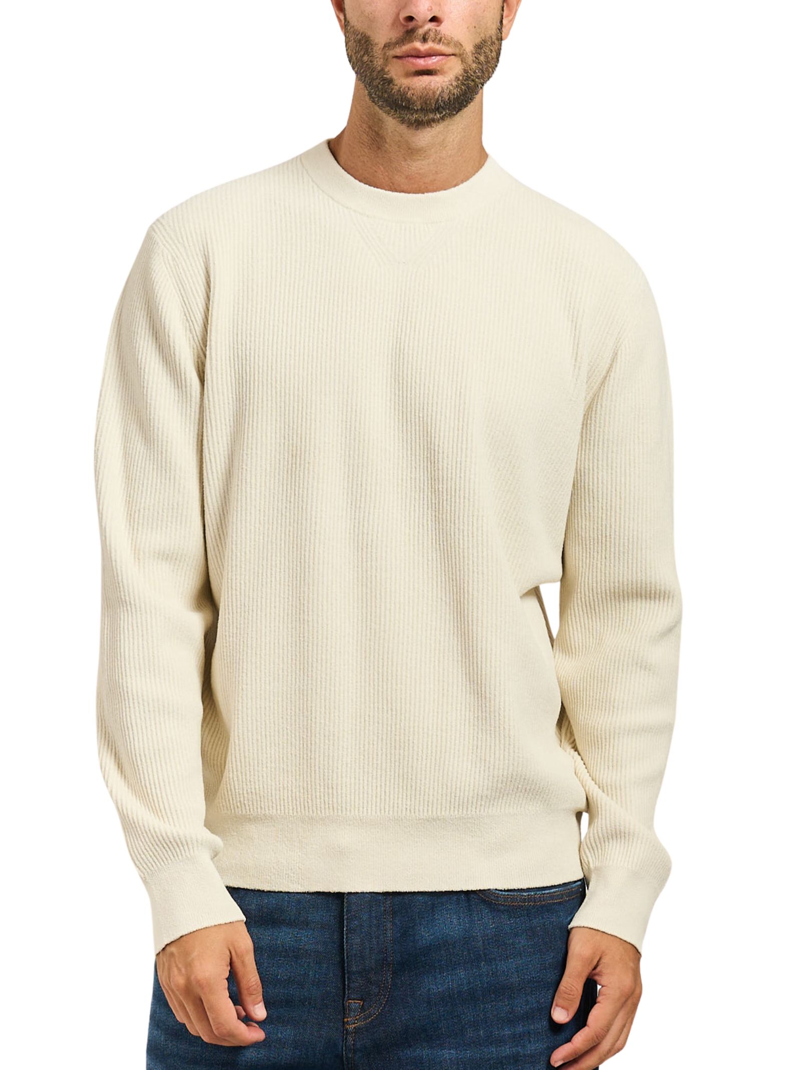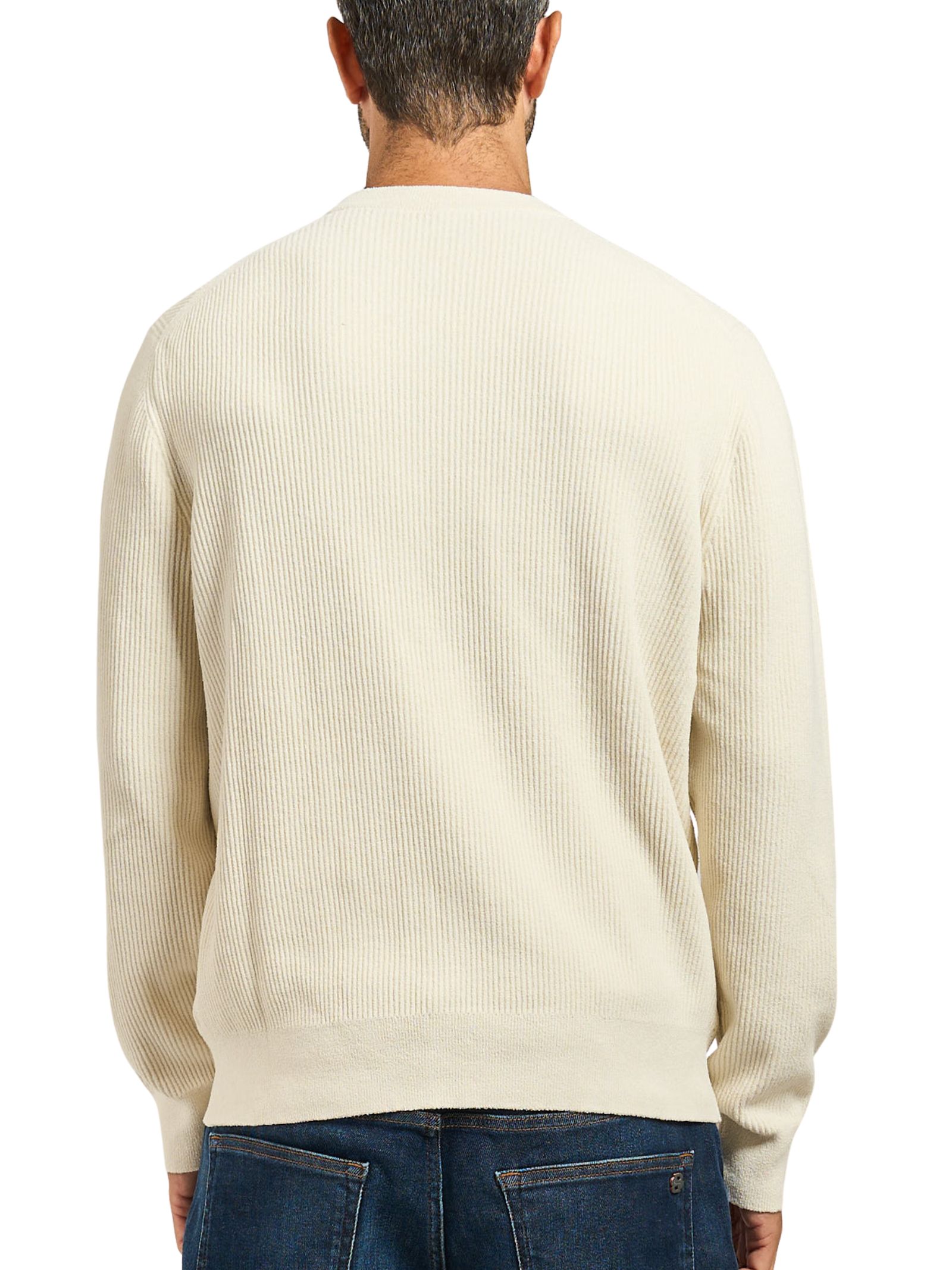 Maglione bianco BOSS con moderna lavorazione effetto velluto a coste e comoda vestibilità regular fit. Materiale: 55% viscosa, 42% poliammide (di cui 35% riciclato), 3% elastan.