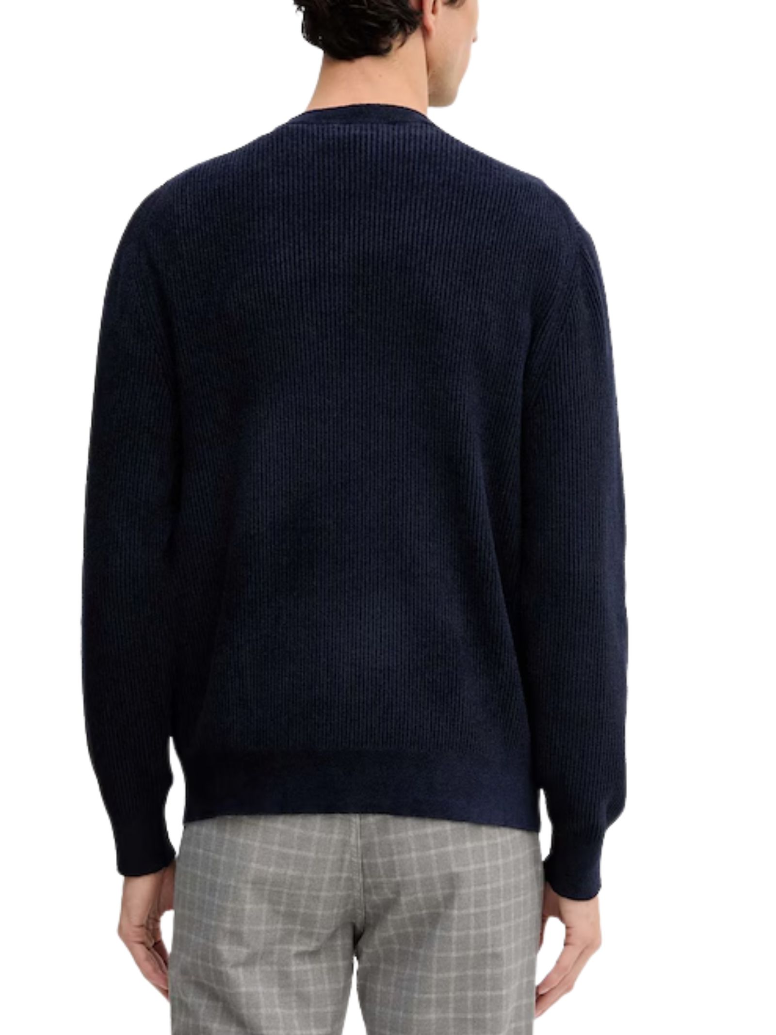 Maglione blu BOSS con moderna lavorazione effetto velluto a coste e comoda vestibilità regular fit. Materiale: 55% viscosa, 42% poliammide (di cui 35% riciclato), 3% elastan.