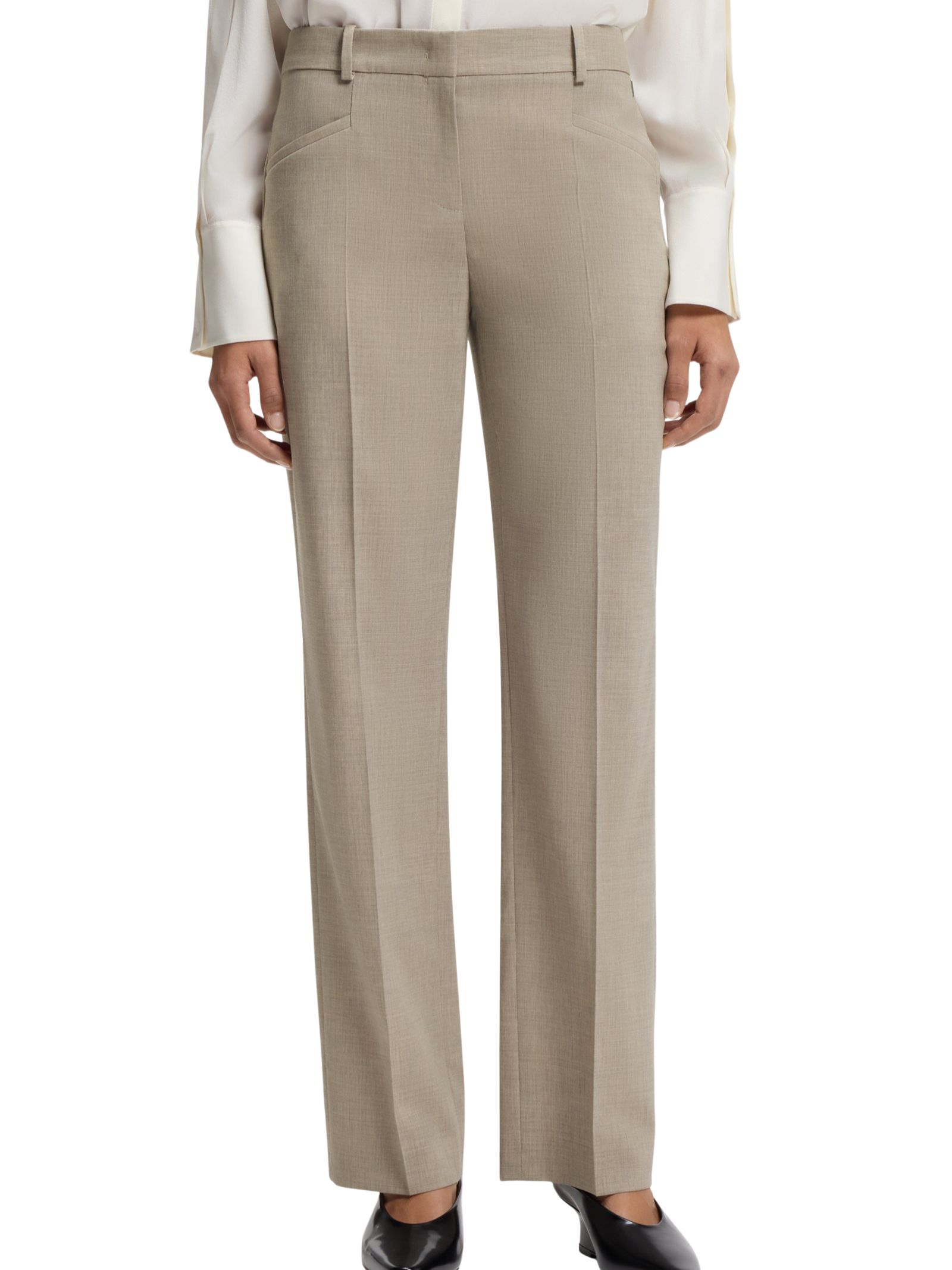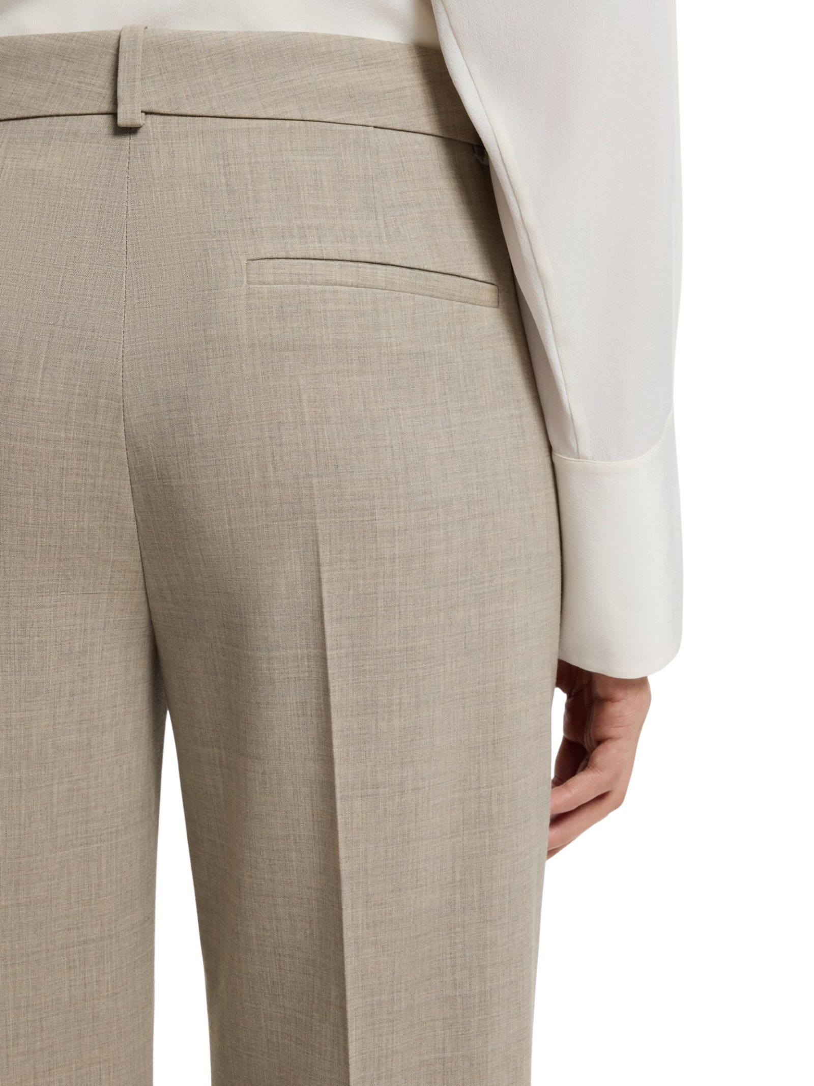 Pantaloni dal taglio comodo e versatile, ideali per completare look eleganti con un tocco moderno. Realizzati in lana vergine elasticizzata con delicato effetto mélange, offrono comfort e una vestibilità fluida con gamba dritta; chiusura con gancio e zip, tasche posteriori a filetto e dettagli leggermente increspati. Il capo contiene oltre l'80% di materie prime provenienti da fonti responsabili, con lana mulesing-free e prodotta nel rispetto degli standard di benessere animale. Composizione: 100% lana vergine, fodera della tasca: 55% poliestere, 45% viscosa.