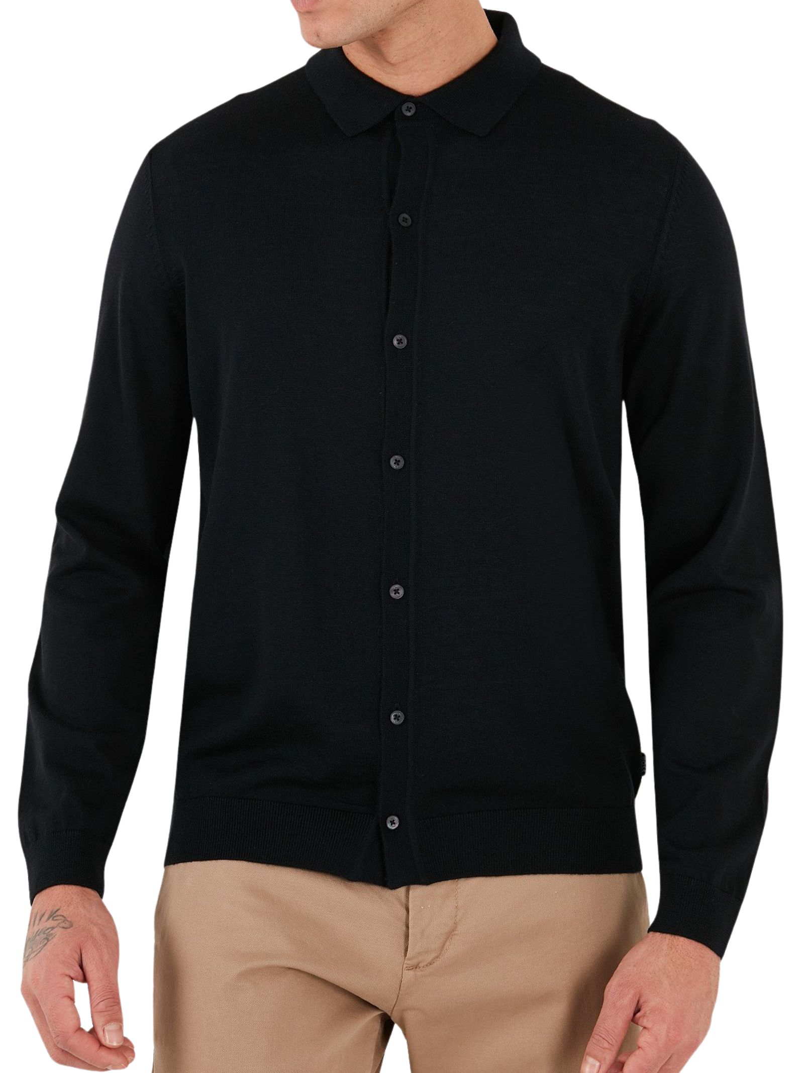 Polo nera in maglia con colletto classico, maniche lunghe dotate di polsi elasticizzati, chiusura con bottoni ed etichetta logo laterale in tessuto. Presenta profili a costine. Composizione: 100% virgin wool.