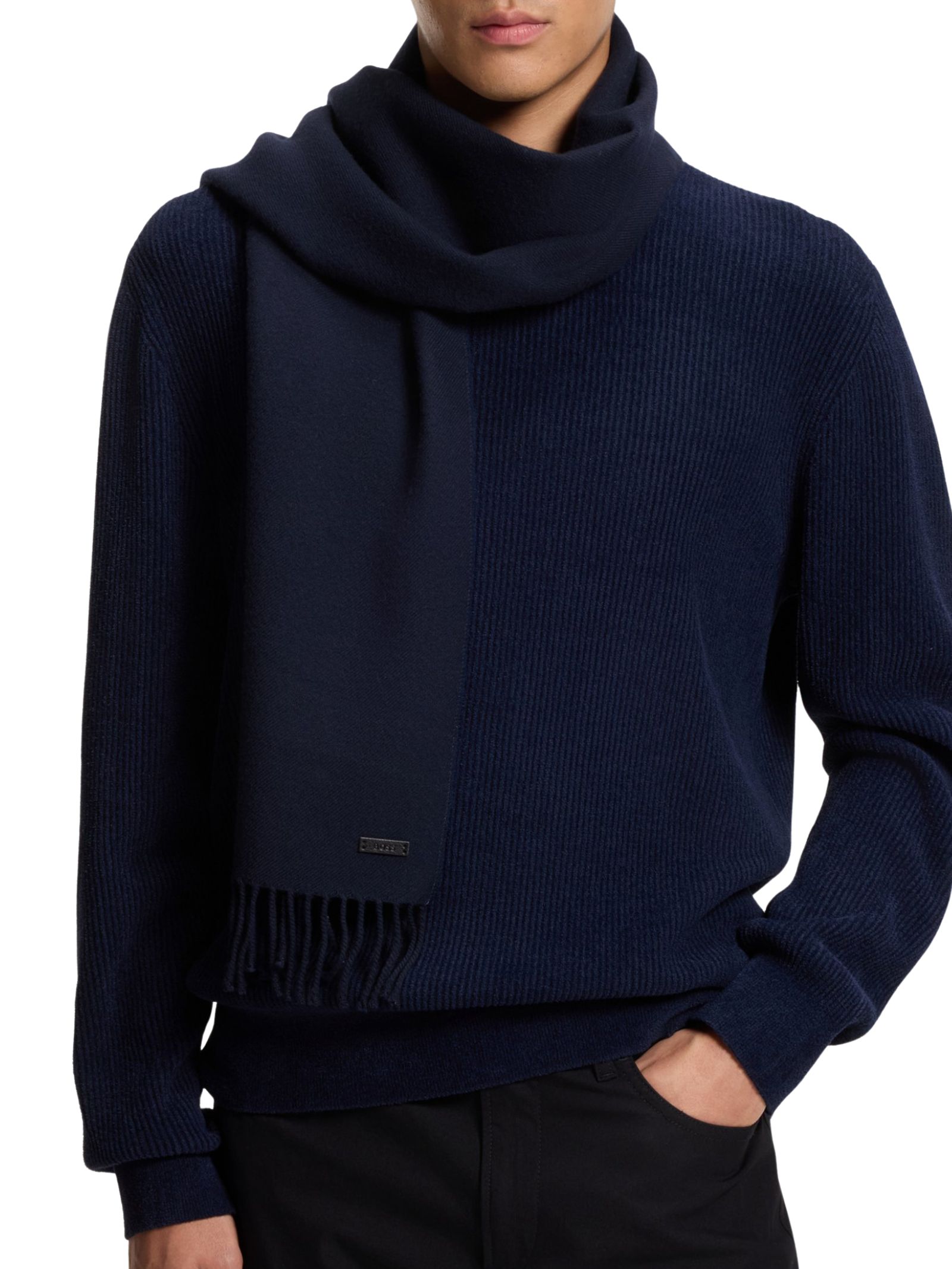 Sciarpa blu BOSS Menswear in morbido twill di lana con estremità sfrangiate, patch con logo in tessuto sintetico effetto similpelle e design caldo ideale per le giornate fredde. Realizzata con almeno l80% di materie prime migliori e lana proveniente da fonti responsabili. Misure: 164 x 32 cm. Composizione: 100% lana.
