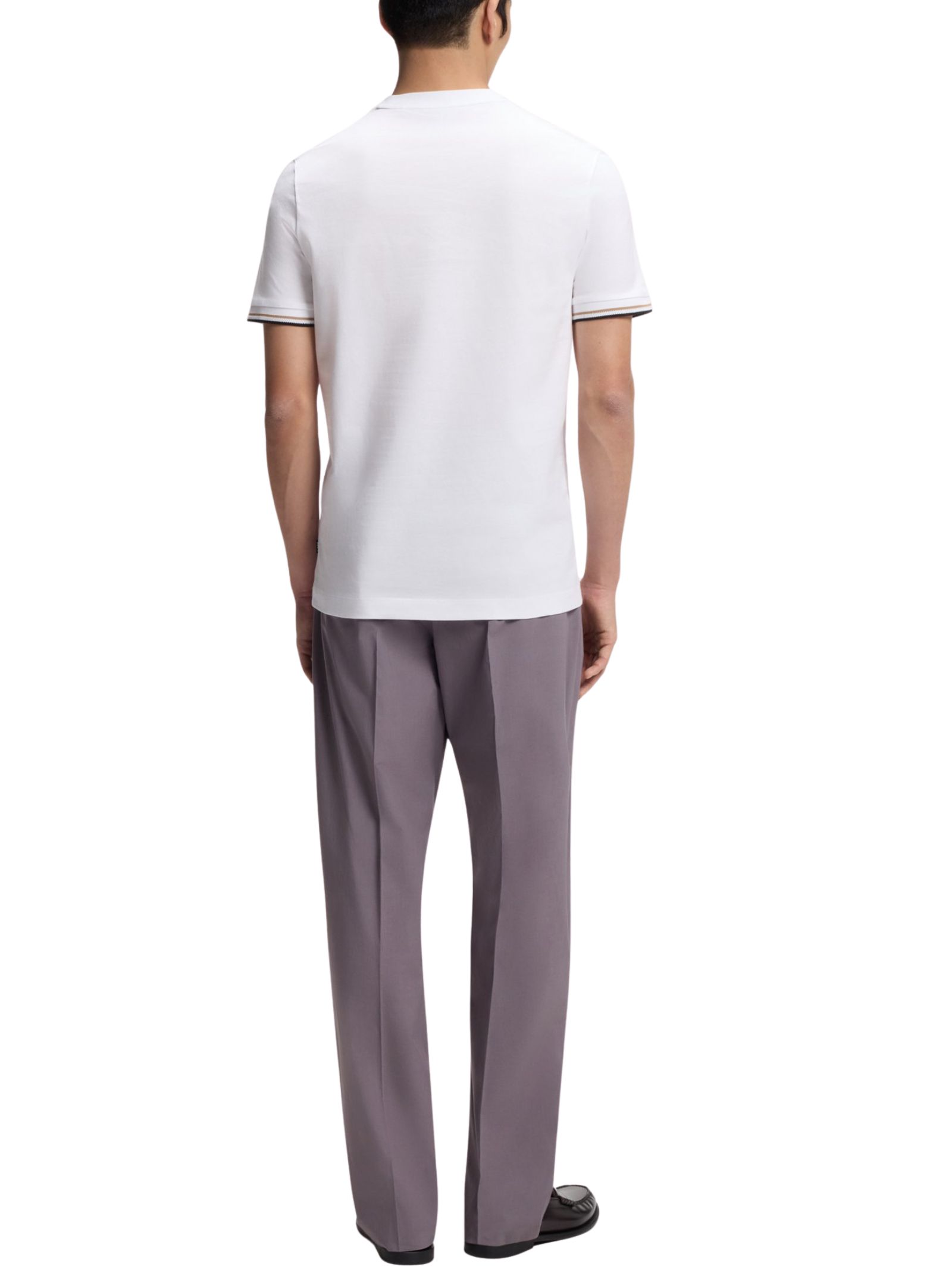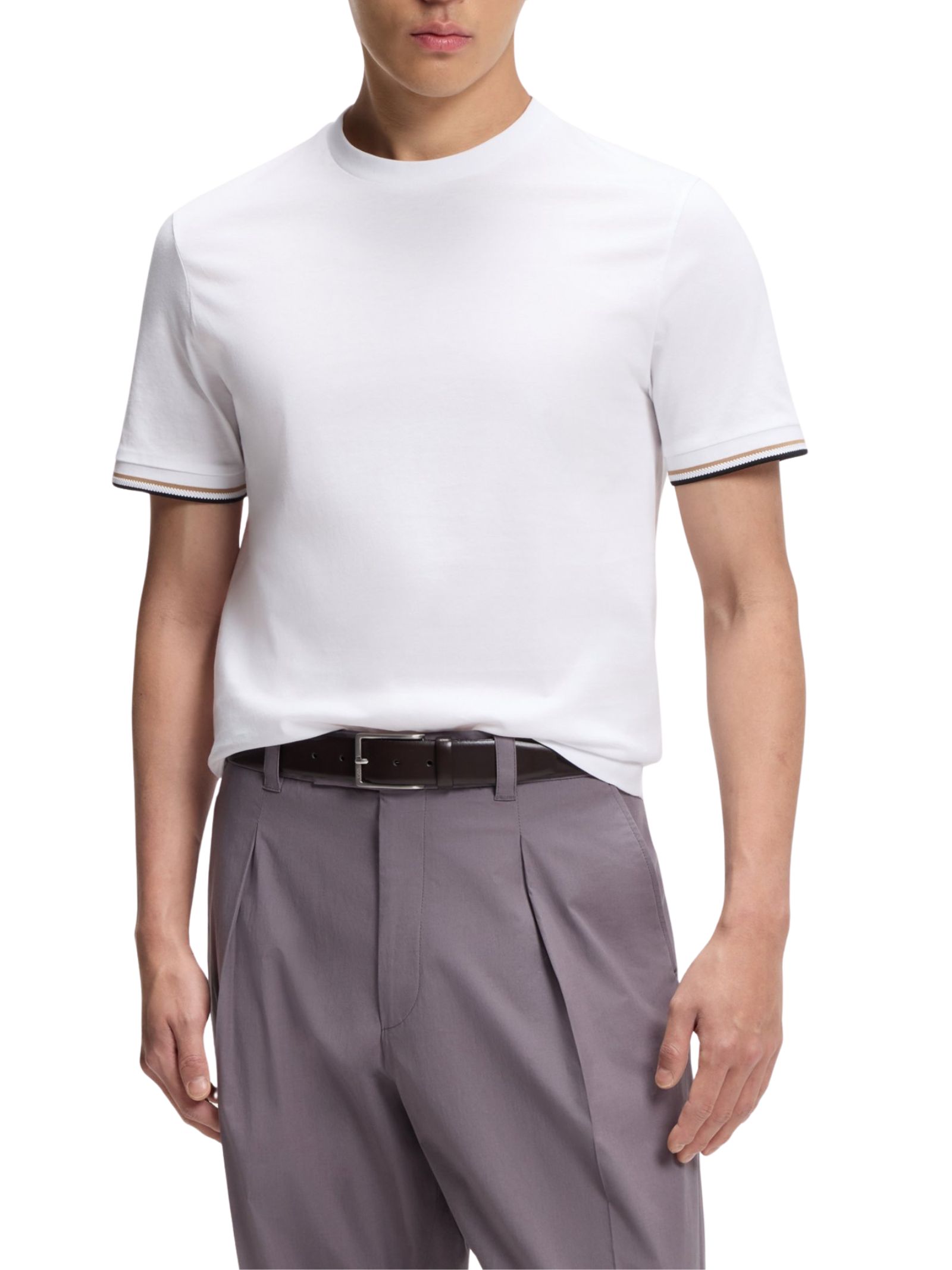 T-shirt in cotone, morbido e traspirante, impreziosita da polsini rigati con colori a contrasto, per un tocco distintivo. Il design girocollo con maniche corte e lunghezza standard la rende un capo versatile e facile da abbinare in ogni occasione; la vestibilità regolare assicura comfort e libertà di movimento, ideale per un uso quotidiano. Composizione: 100% cotone.