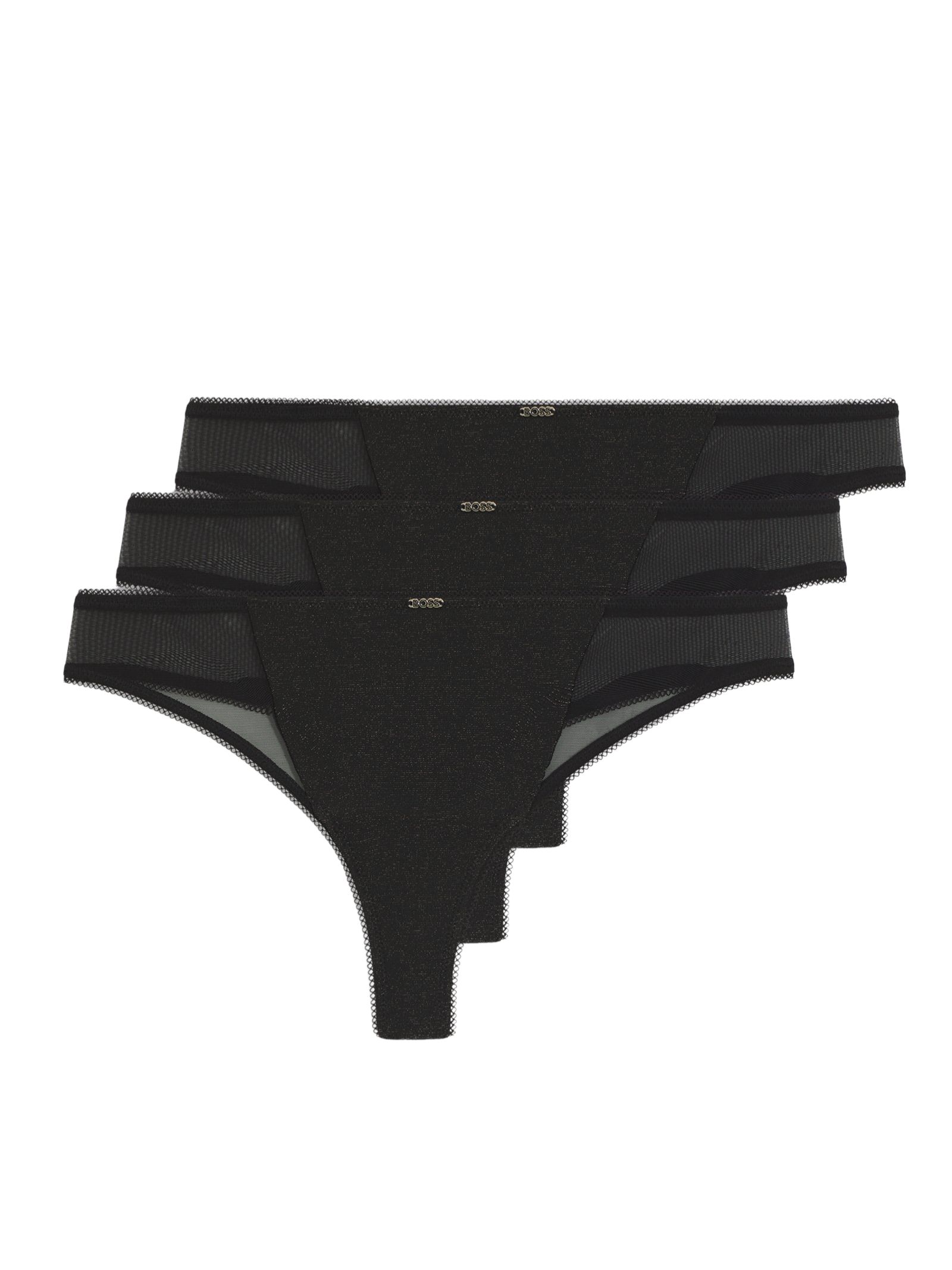 Tanga gift box BOSS 3 pezzi neri in morbido jersey luccicante con picot e dettagli in mesh, confezionati elegantemente; realizzati in 79% poliammide, 13% metallizzato e 8% elastan, con fodera inferiore 100% cotone.