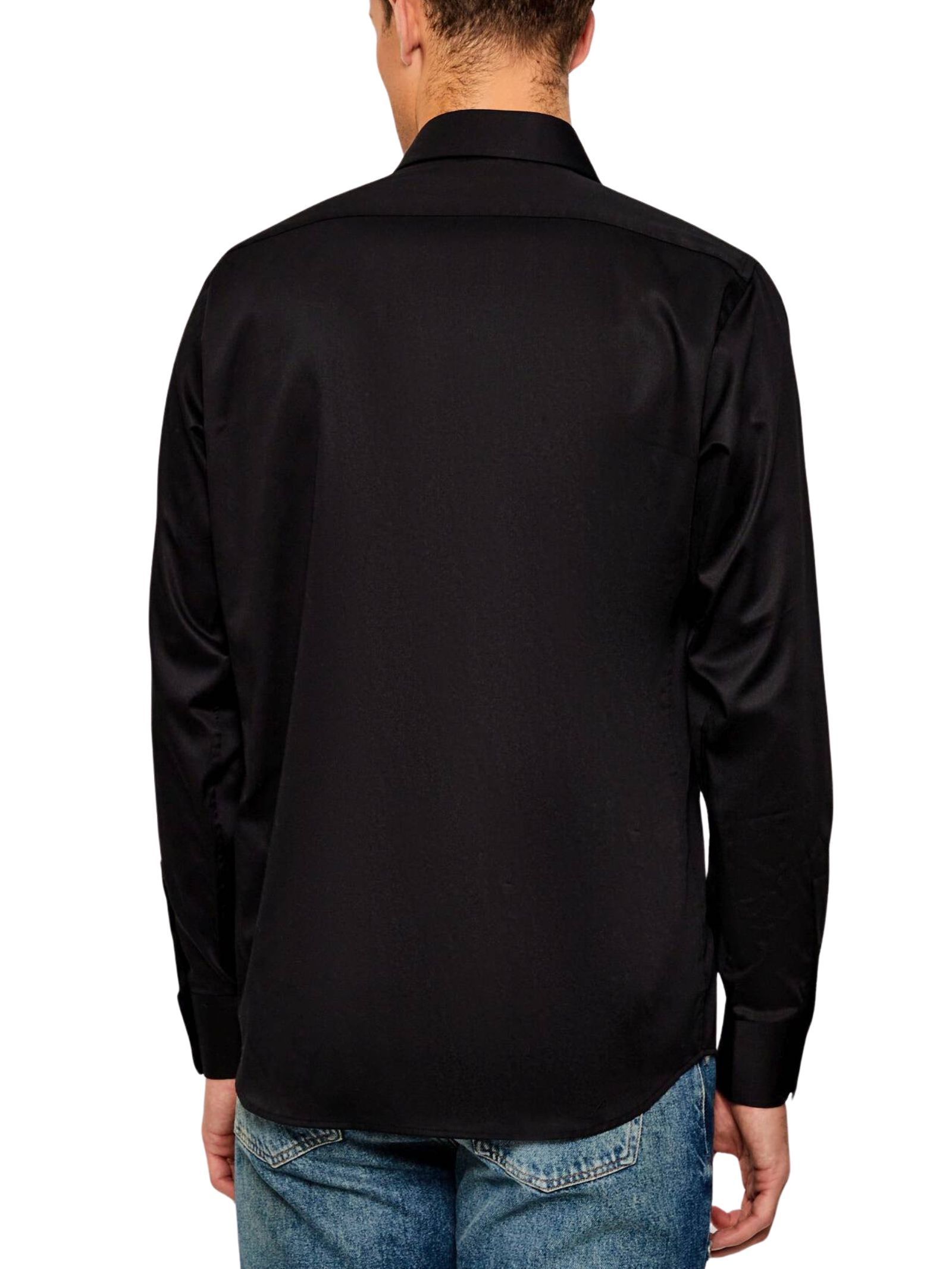 Camicia Karl Lagerfeld nera in modern fit con logo iconico ricamato sul petto tono su tono. Composizione 98% cotone, 2% spandex