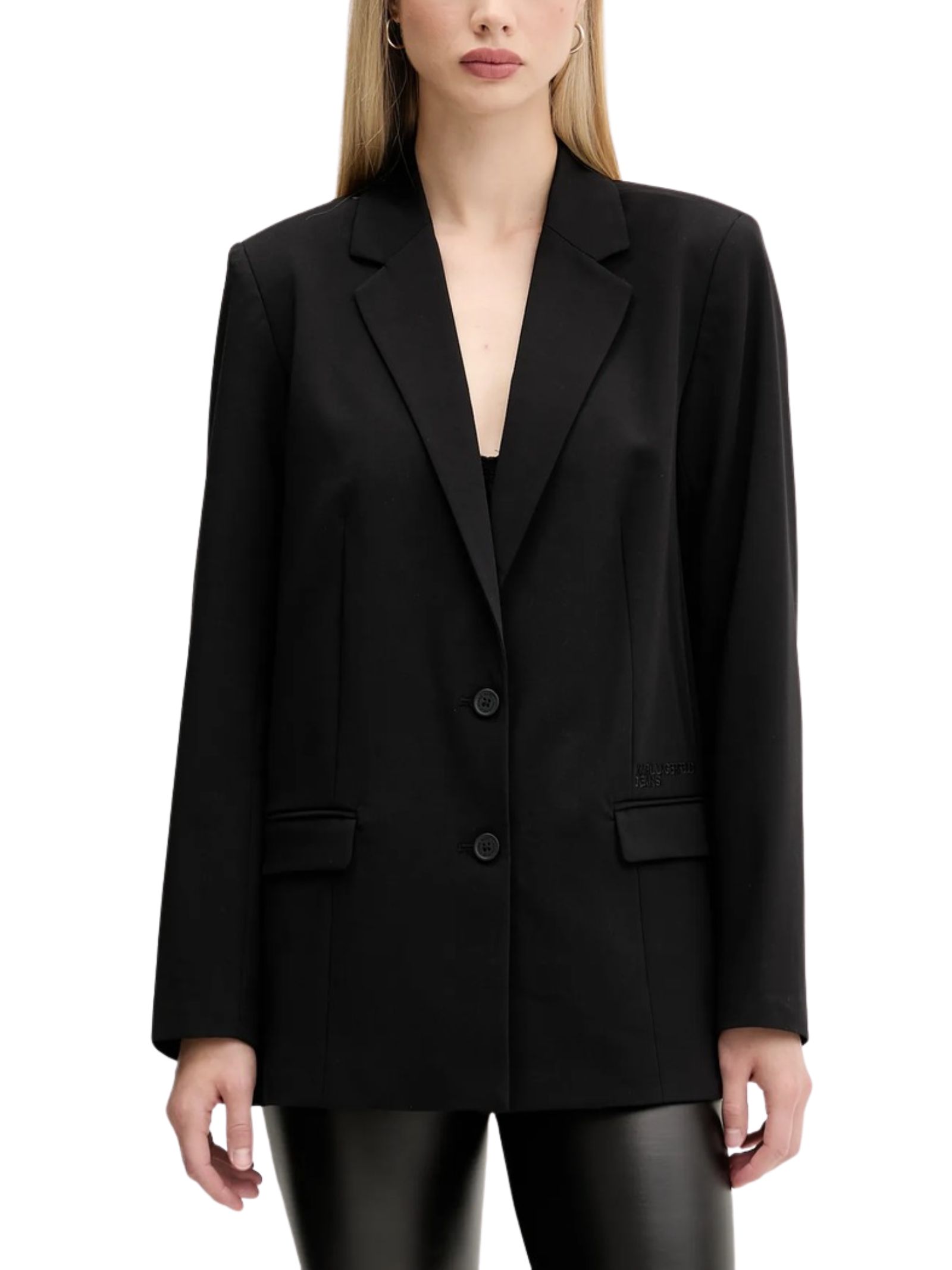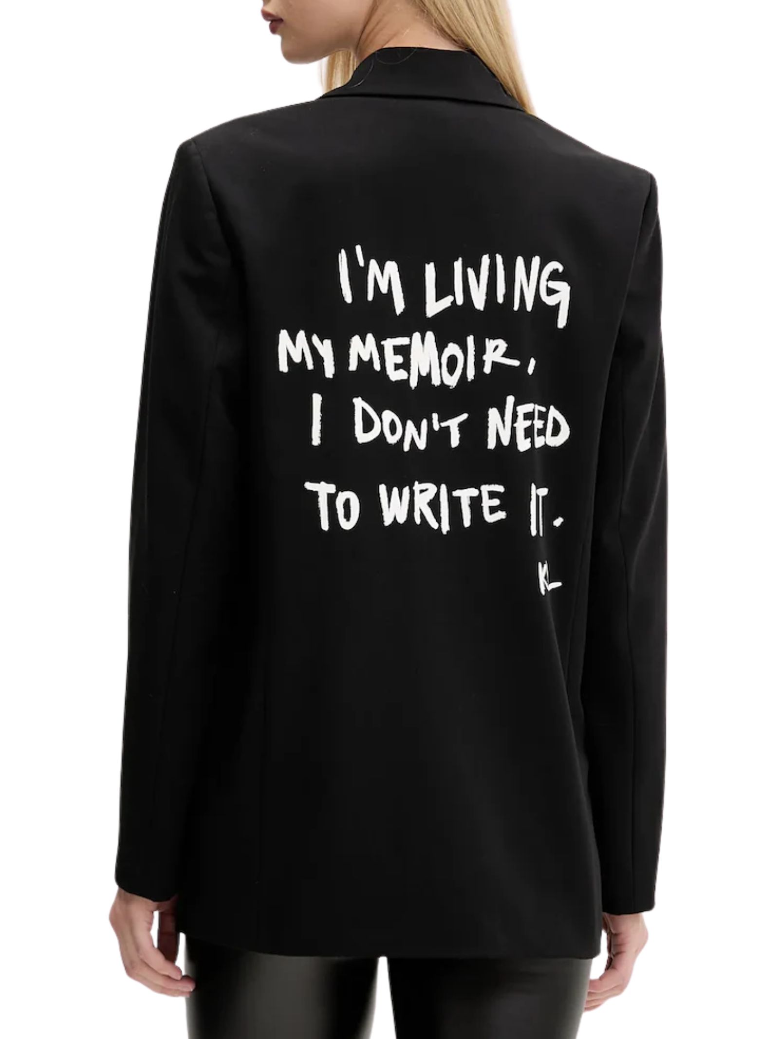 Blazer Karl Lagerfeld con collo a revers, maniche lunghe e chiusura frontale con bottoni; dotato di tasche con patta, ricamo del logo sul davanti e stampa sul pannello posteriore; completamente foderato e realizzato in un tessuto composto da 64% poliestere, 31% viscosa e 5% elastan.