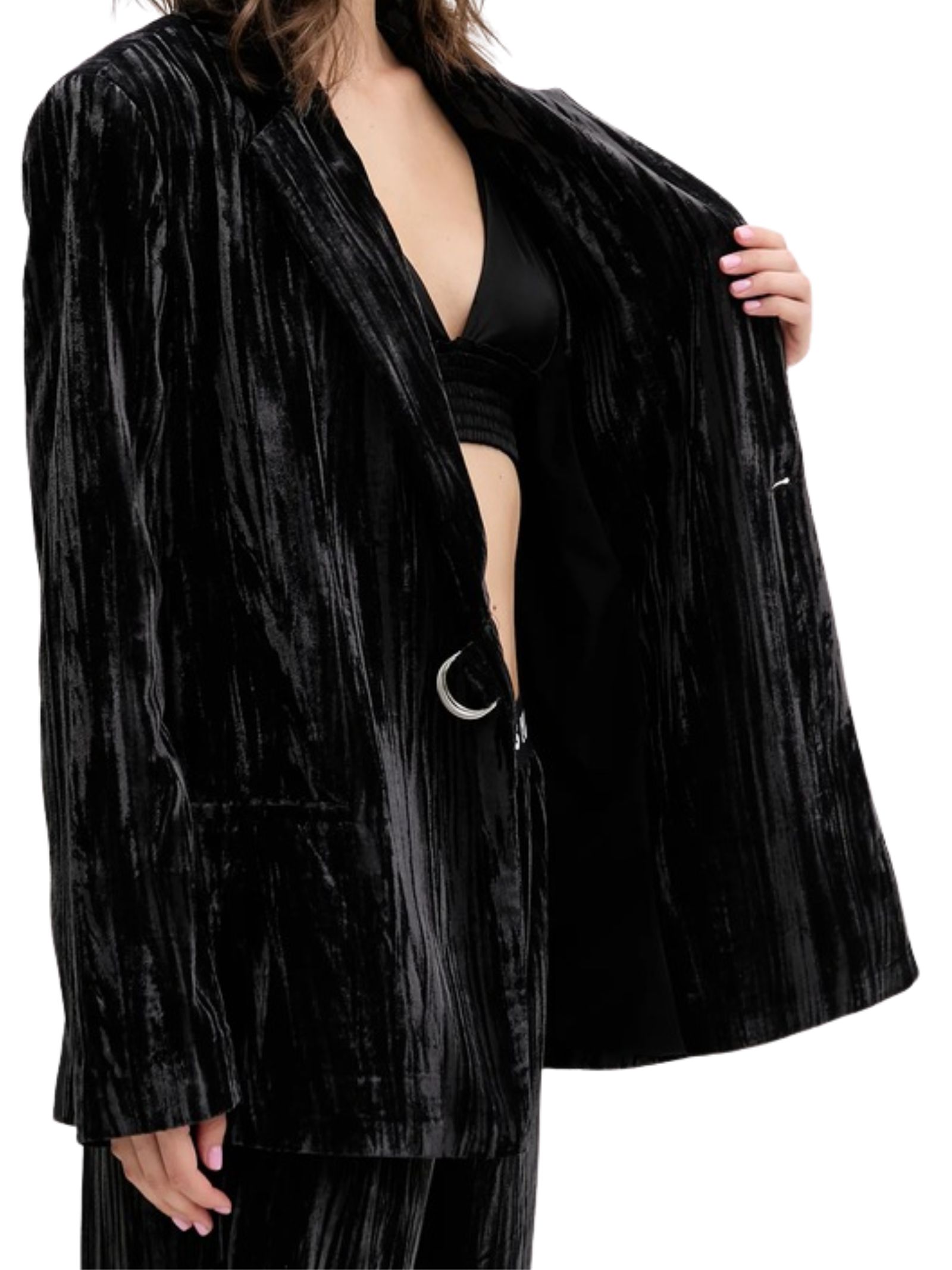Giacca Karl Lagerfeld Jeans realizzata in velluto, con poliestere che assicura resistenza alle sgualciture e un taglio dritto che offre ottima libertà di movimento; presenta fodera interna aggiuntiva, revers a punta, spalline imbottite, chiusura doppiopetto e cinghia integrata per una vestibilità più definita. Dotata di due tasche frontali per piccoli oggetti, uno spacco posteriore che migliora la libertà di movimento e un tessuto sottile e leggermente flessibile. Rivestimento: 94% poliestere, 6% elastan; materiale principale: 100% poliestere.