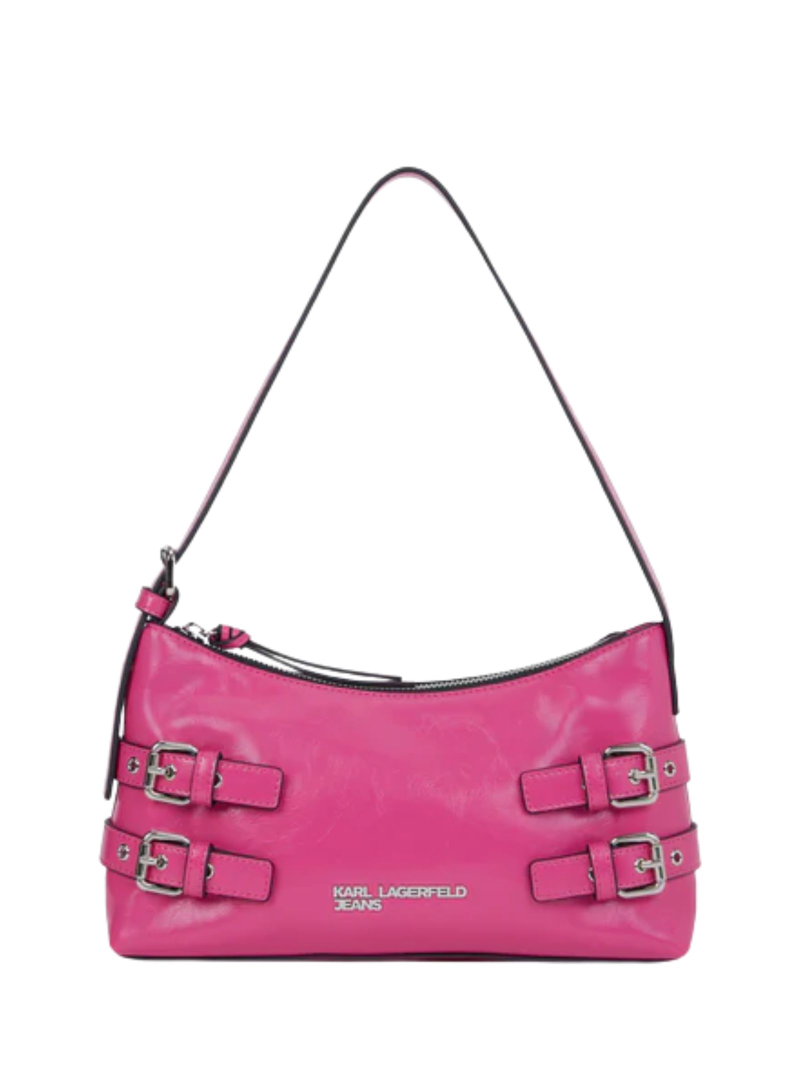 Borsa a spalla dal design deciso, caratterizzata da finitura lucida e dettagli con fibbie contemporanee che valorizzano il logo metallico KARL LAGERFELD JEANS, completata da tracolla regolabile e chiusura superiore con zip per custodire gli essenziali. Composizione: 65% poliuretano, 35% poliestere.