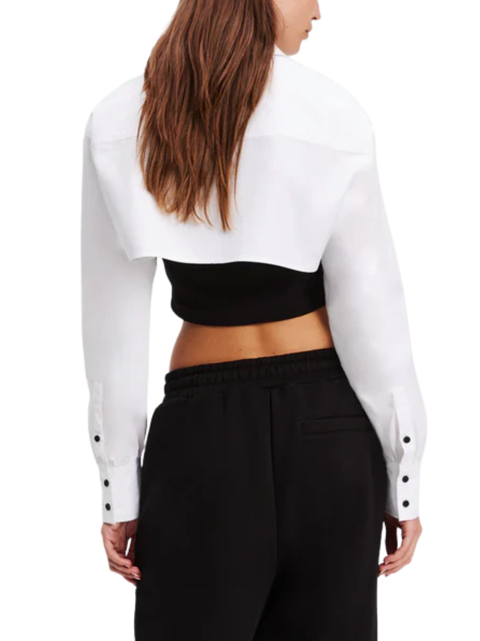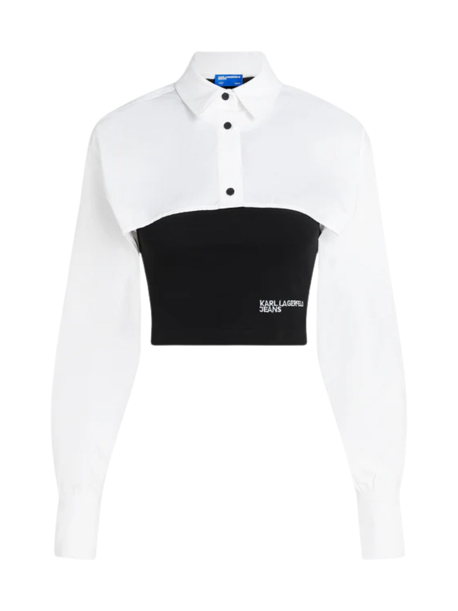 Camicia a blocchi di colore dal design audace, proposta in bianco e nero, con top corto interno staccabile che offre versatilità e possibilità di styling personalizzato. Dotata di chiusura frontale con bottoni e stampa KARL LAGERFELD JEANS con ricamo sul lato sinistro. Composizione: 100% cotone.