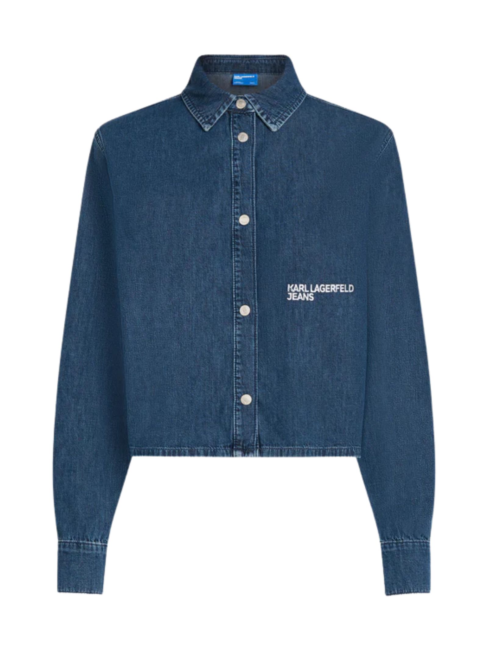 Camicia in denim dal design moderno, caratterizzata da un modello squadrato ampio che assicura comfort e versatilità per tutto lanno. Dotata di maniche lunghe e chiusura con bottoni automatici, presenta un grande ricamo KARL LAGERFELD JEANS sul lato sinistro. Composizione: 100% cotone.