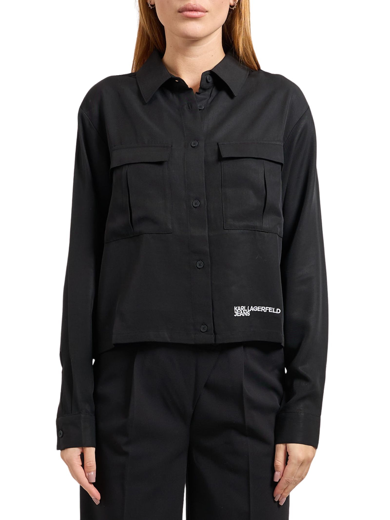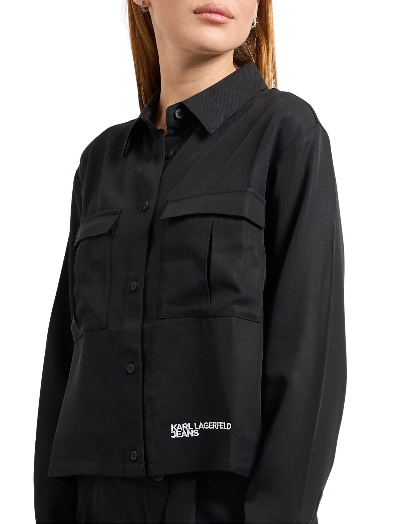 Camicia a maniche lunghe Karl Lagerfeld donna in cotone con tasconi in petto, logo sull'orlo e dal taglio corto.