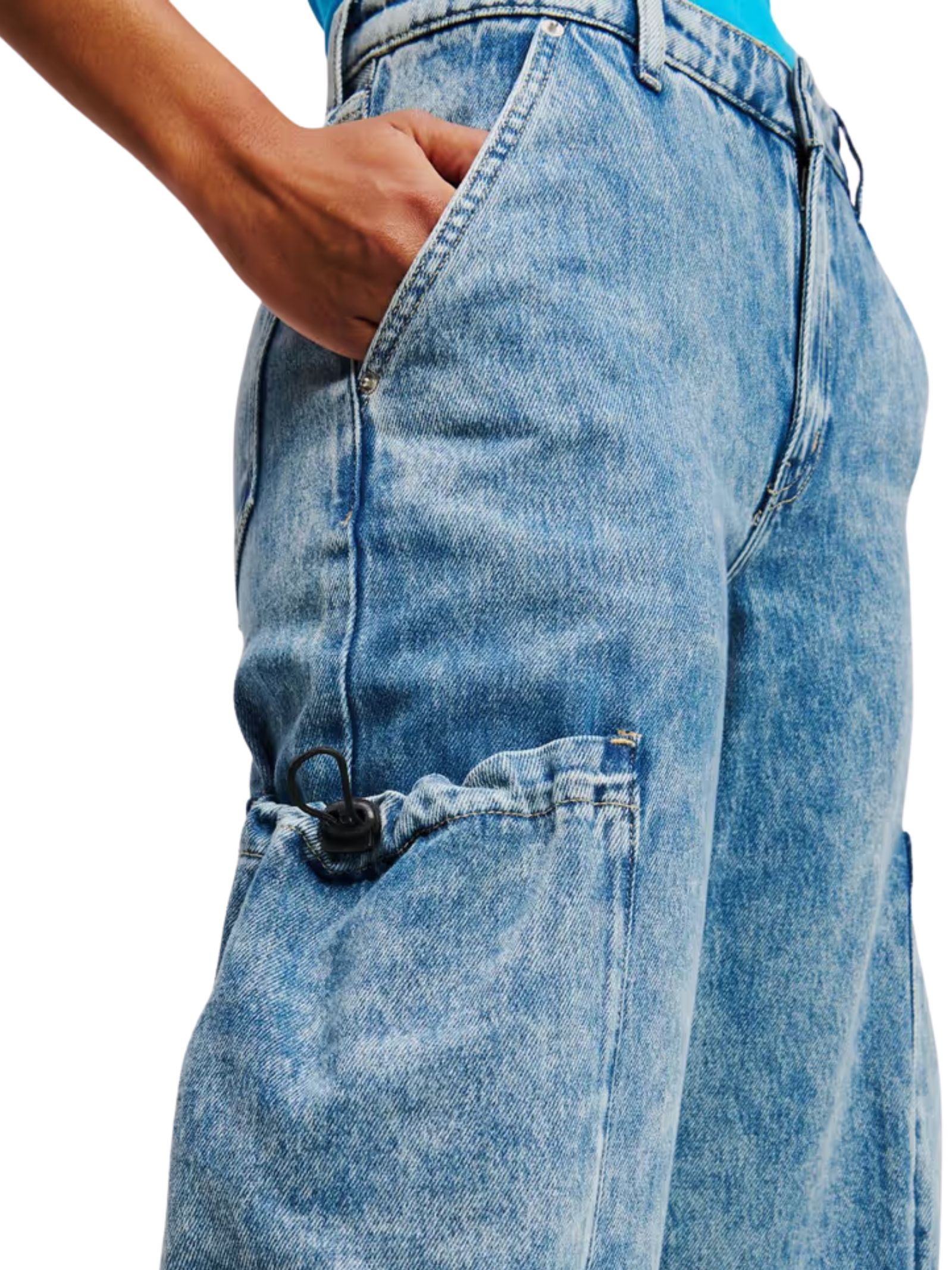 Jeans cargo relaxed fit a vita alta in denim rigido, modello Karl Cares realizzato con materiali sostenibili, chiusura con bottone e zip, due tasche laterali anteriori e due tasche posteriori a filetto, lavaggio stone washed, in 62% cotone biologico e 38% lyocell riciclato con fodera tasche in poliestere e cotone.
