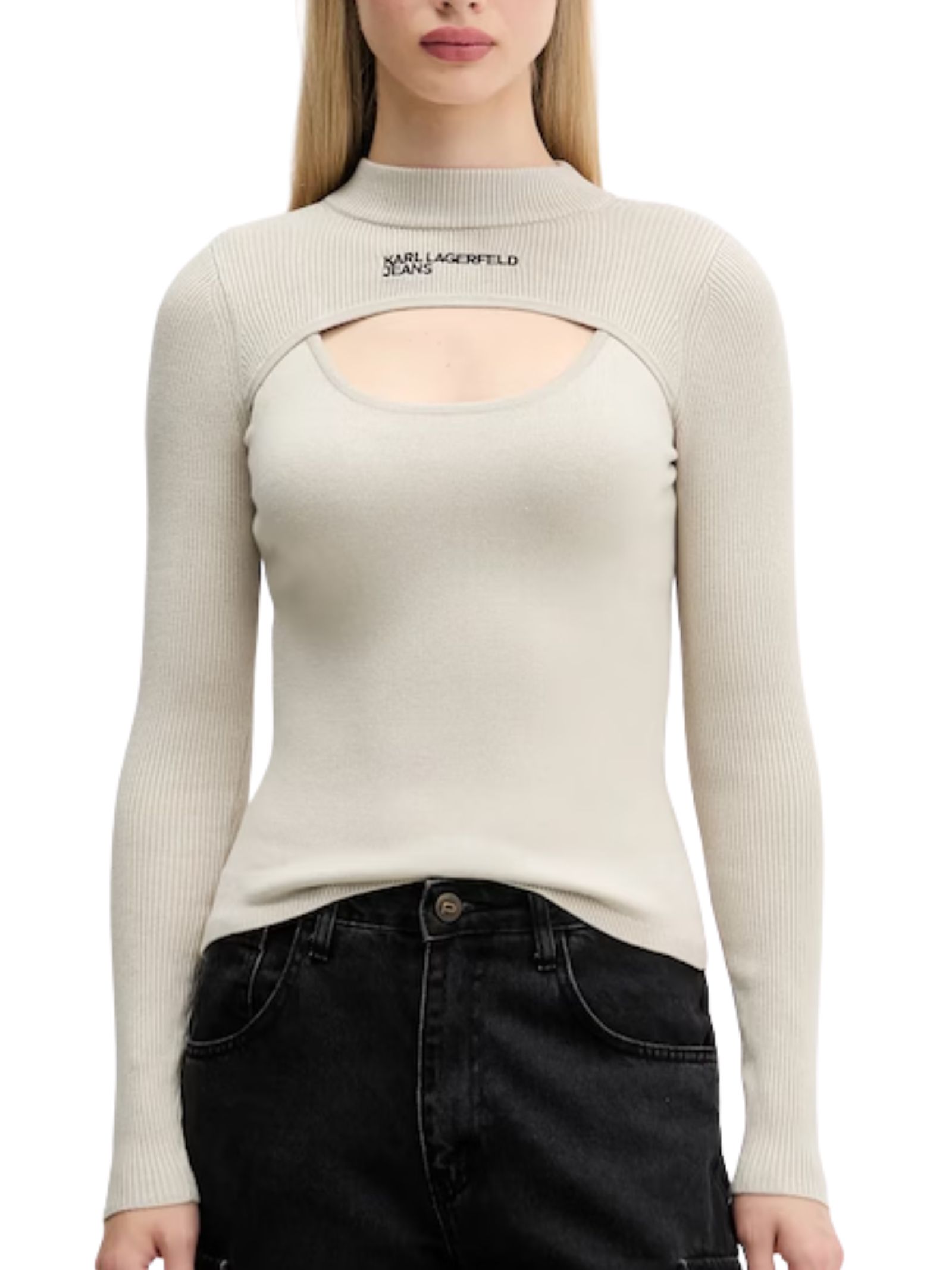 Maglia color perla con apertura sul petto Karl Lagerfeld Jeans in tessuto leggero, traspirante ed elasticizzato con alta percentuale di viscosa; presenta un taglio aderente al corpo, collo alto, un taglio decorativo sulla scollatura, maniche lunghe e aderenti, oltre al logo ricamato sul davanti. Realizzato in maglia fine elasticizzata. Composizione: 41% acrilico, 41% viscosa, 18% poliammide.