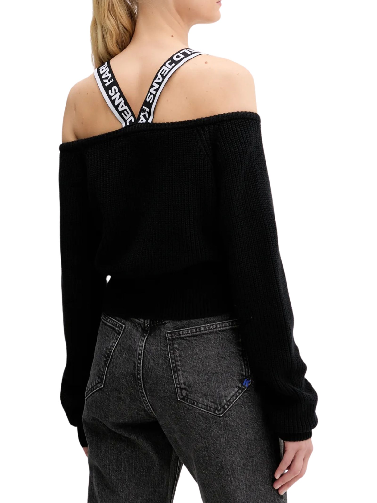Karl Lagerfeld Jeans maglione realizzato in maglia in misto lana. Il modello realizzato in un tessuto estremamente confortevole ad alta percentuale di cotone. Vestibilità comoda e scollo a V. Presenta delle bretelle con scritta iconica del brand. Composizione 82% Cotone, 18% Lana