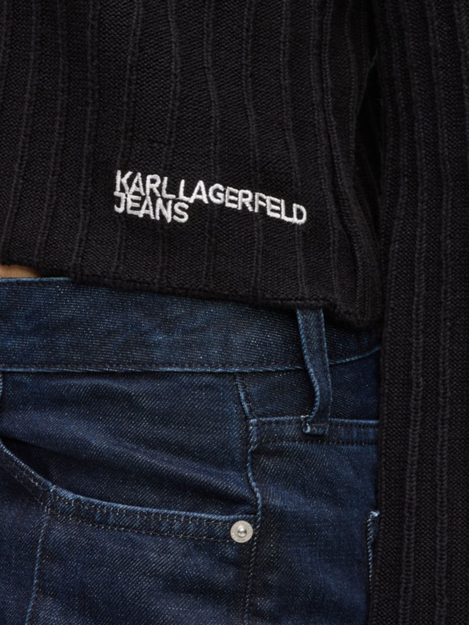 Maglione nero in maglia con tessuto plissé testurizzato, caratterizzato da un collo alto e da una leggera svasatura delle maniche che dona una silhouette moderna e raffinata. Il ricamo del logo in contrasto, posizionato sopra lorlo sinistro, aggiunge un dettaglio distintivo. Composizione: 55% acrilico, 45% cotone.