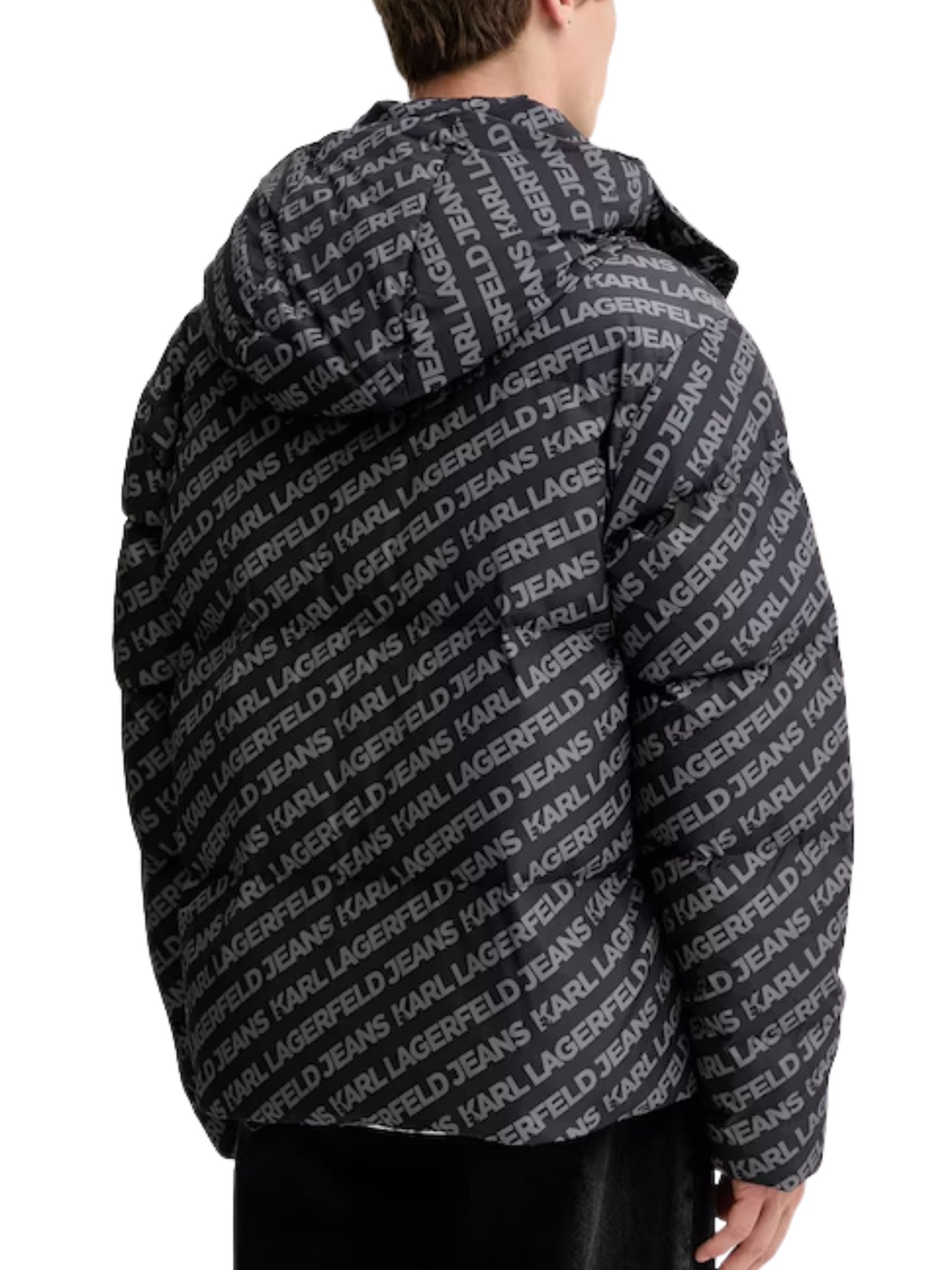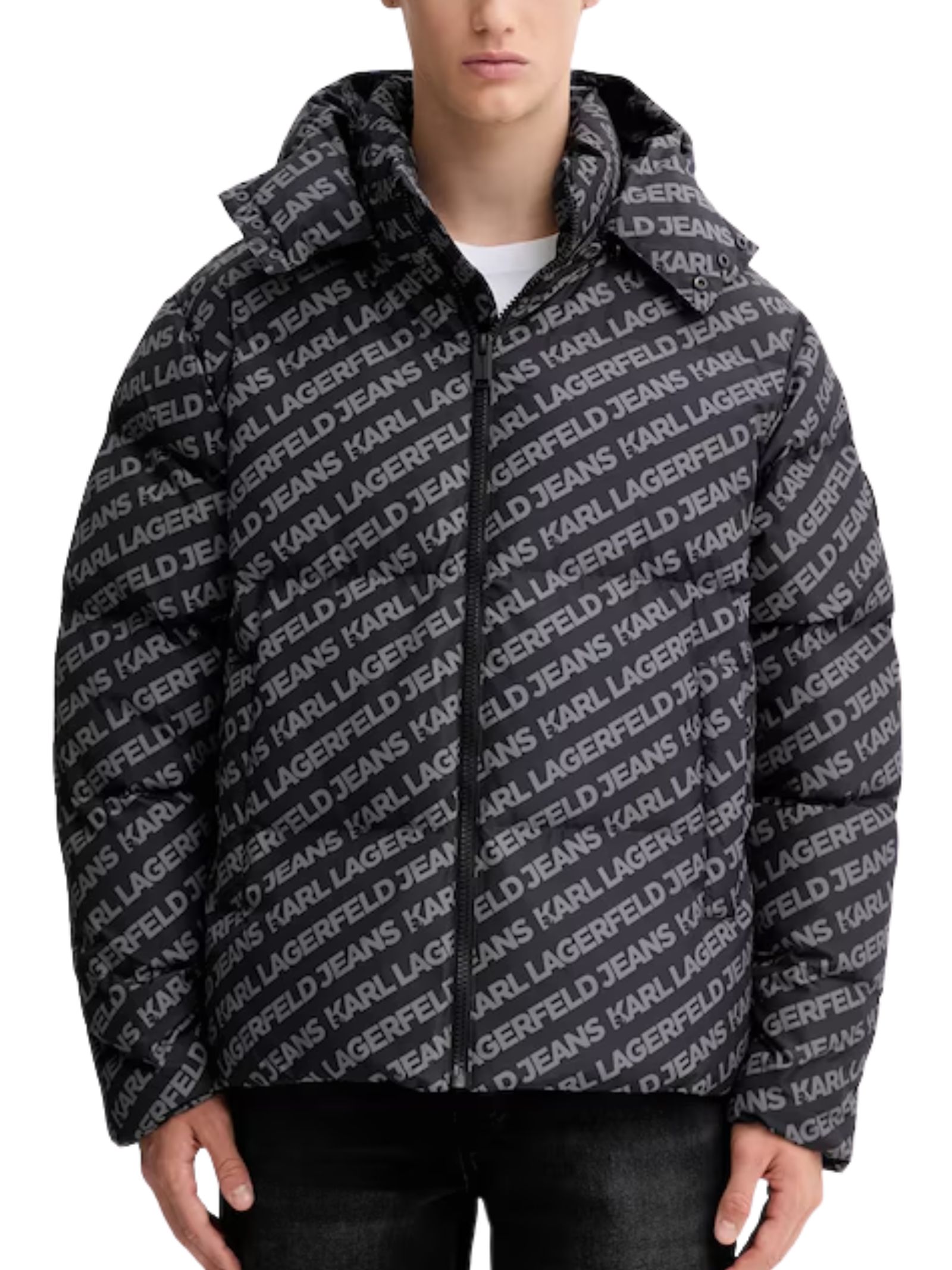 Giacca Karl Lagerfeld Jeans a fantasia con logo all over, trapuntato con imbottitura isolante, ideale per le giornate fresche. Realizzata in parte con poliestere riciclato, presenta vestibilità regular fit, chiusura a zip, tasche laterali con cerniera, polsini elastici e laccetti regolabili sullorlo. Colletto alto e cappuccio staccabile offrono maggiore protezione dal freddo.