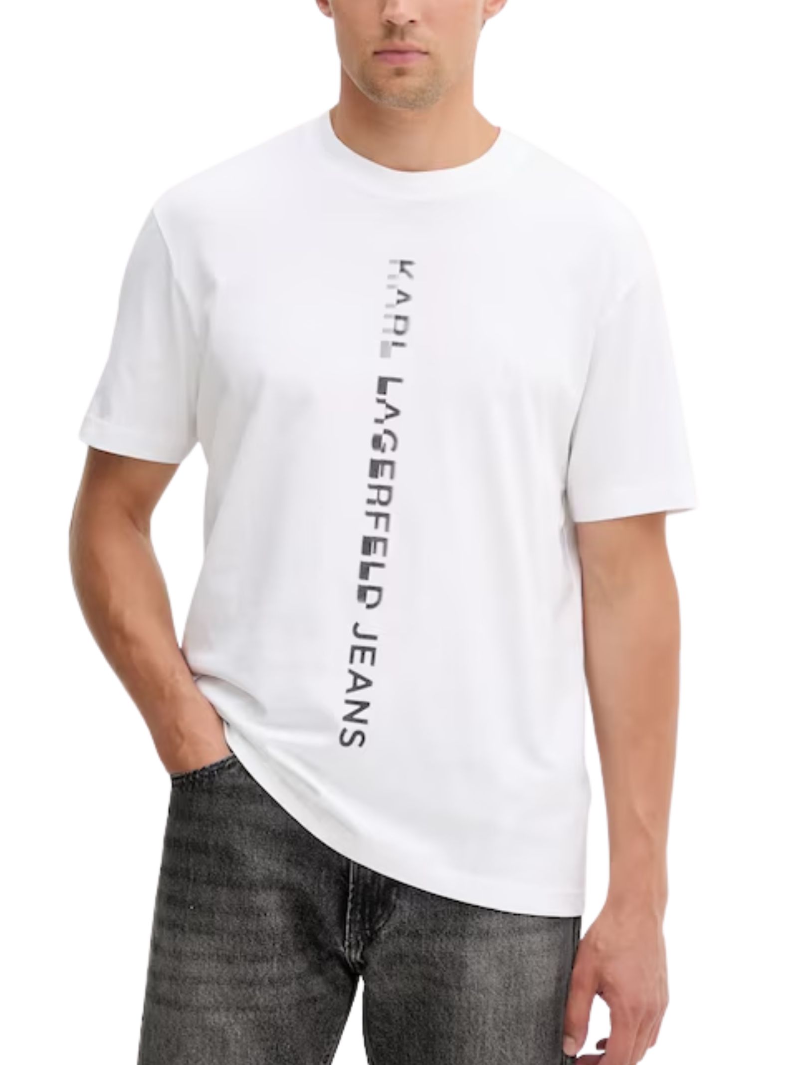 T-shirt Karl Lagerfeld Jeans bianca in maglia fine elasticizzata, realizzata in cotone biologico estremamente confortevole. Caratterizzata da regular fit, classico girocollo rotondo e motivo stampato. Composizione: 100% cotone biologico.