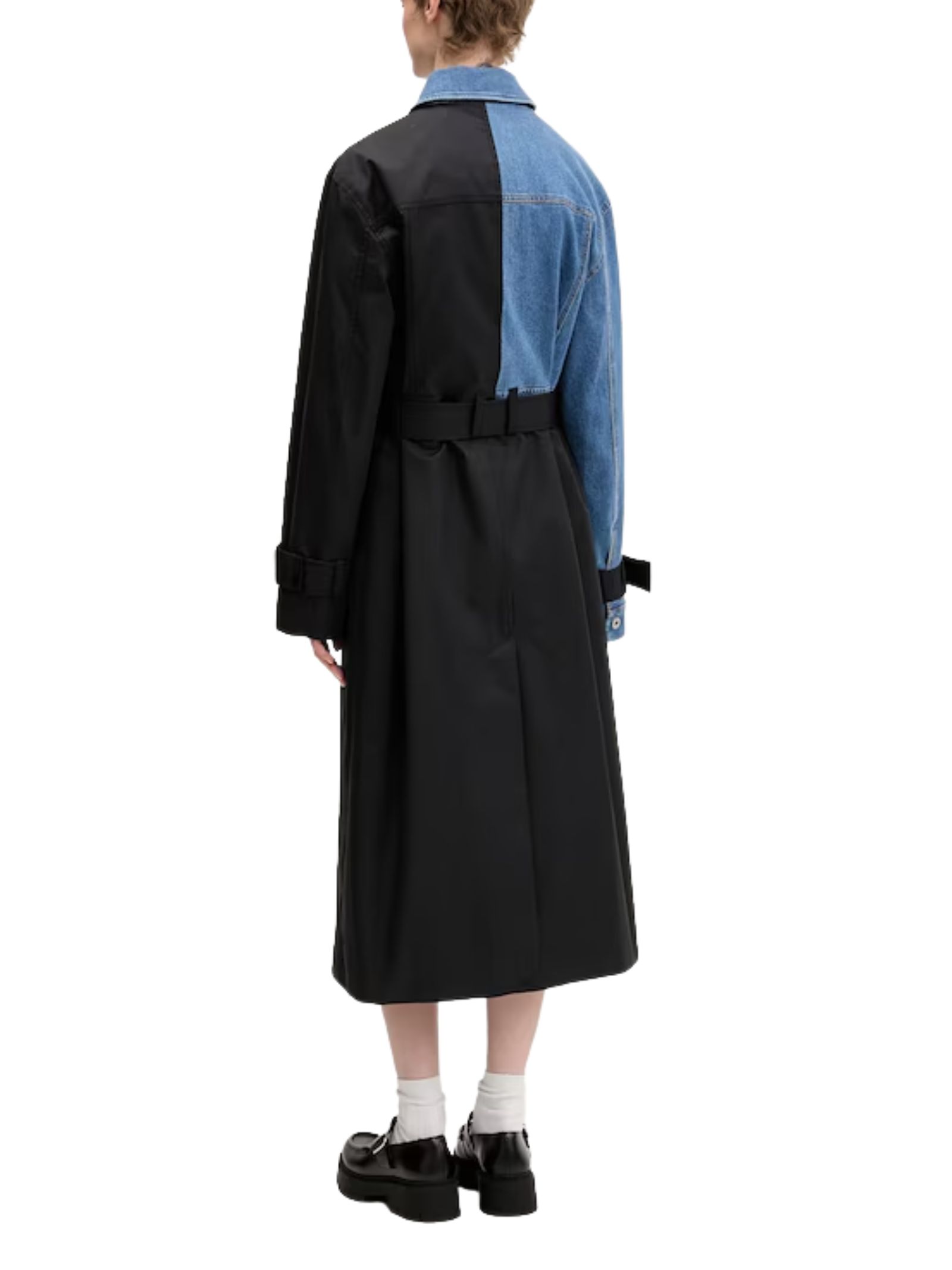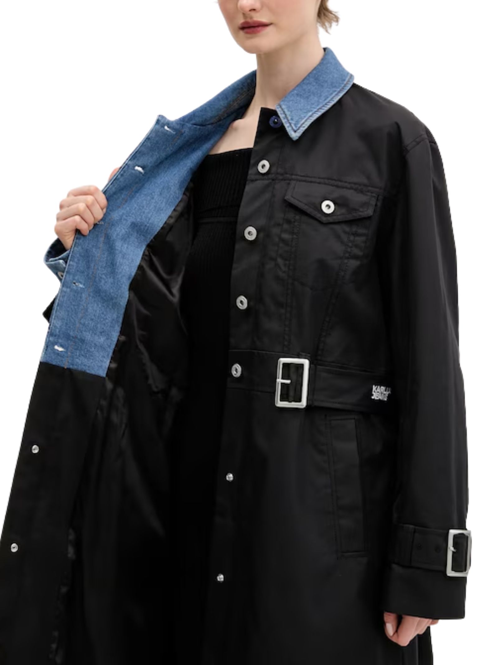 Trench Karl Lagerfeld Jeans dal design contemporaneo realizzato in combinazione di materiali, con vestibilità ampia, chiusura monopetto con bottoni, cintura in vita per definire la silhouette, interno foderato, tasche laterali a taglio, tasche sul petto con bottone e spacco posteriore per maggiore comfort e libertà di movimento, composizione rivestimento 55% poliestere 45% viscosa, materiale principale 82% cotone 18% poliestere, materiale aggiuntivo 67% cotone 33% poliestere, materiale aggiuntivo 100% cotone.