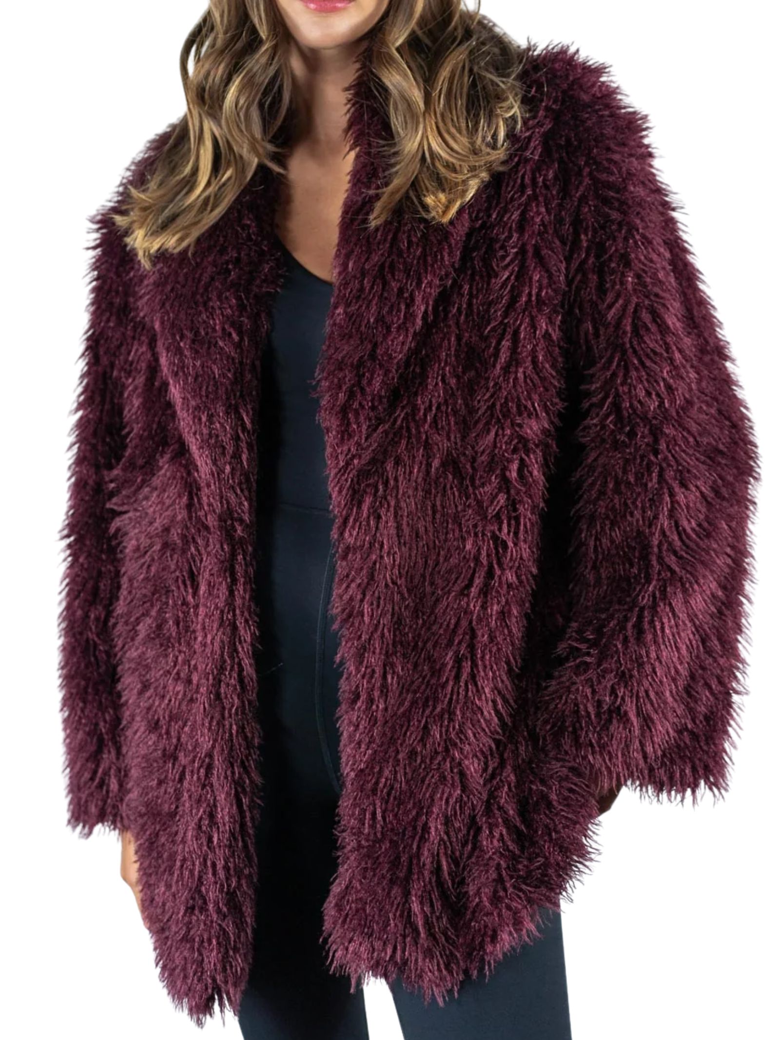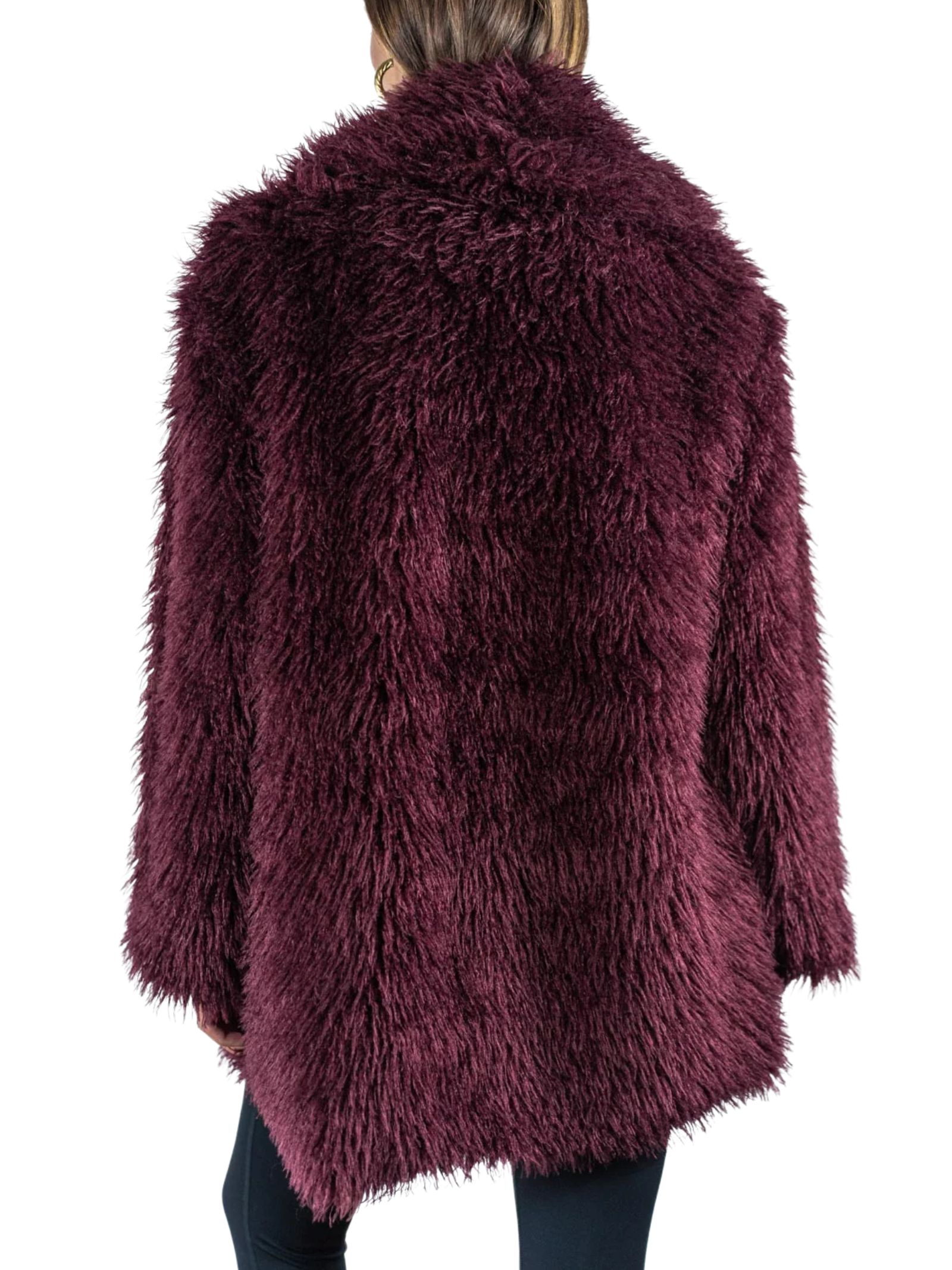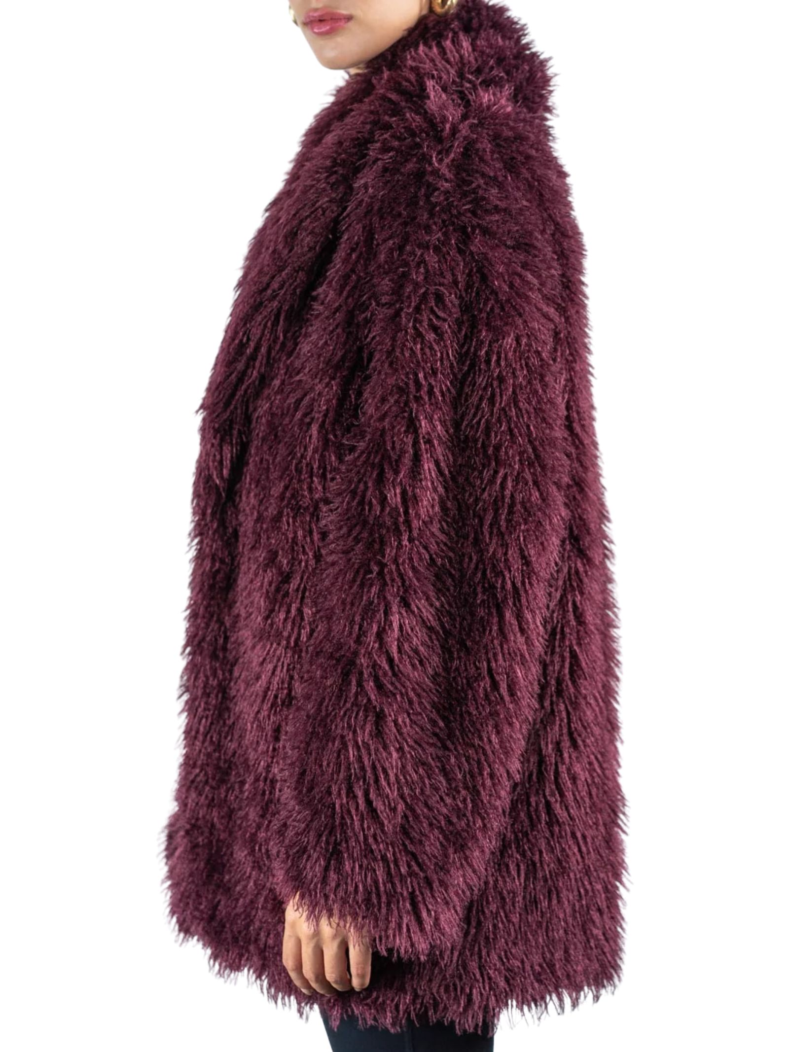 Eco-pelliccia frisè "Le Volière" bordeaux con chiusura con ganci. Lunghezza media, con vestibilità oversize, che dona un look avvolgente e casual.