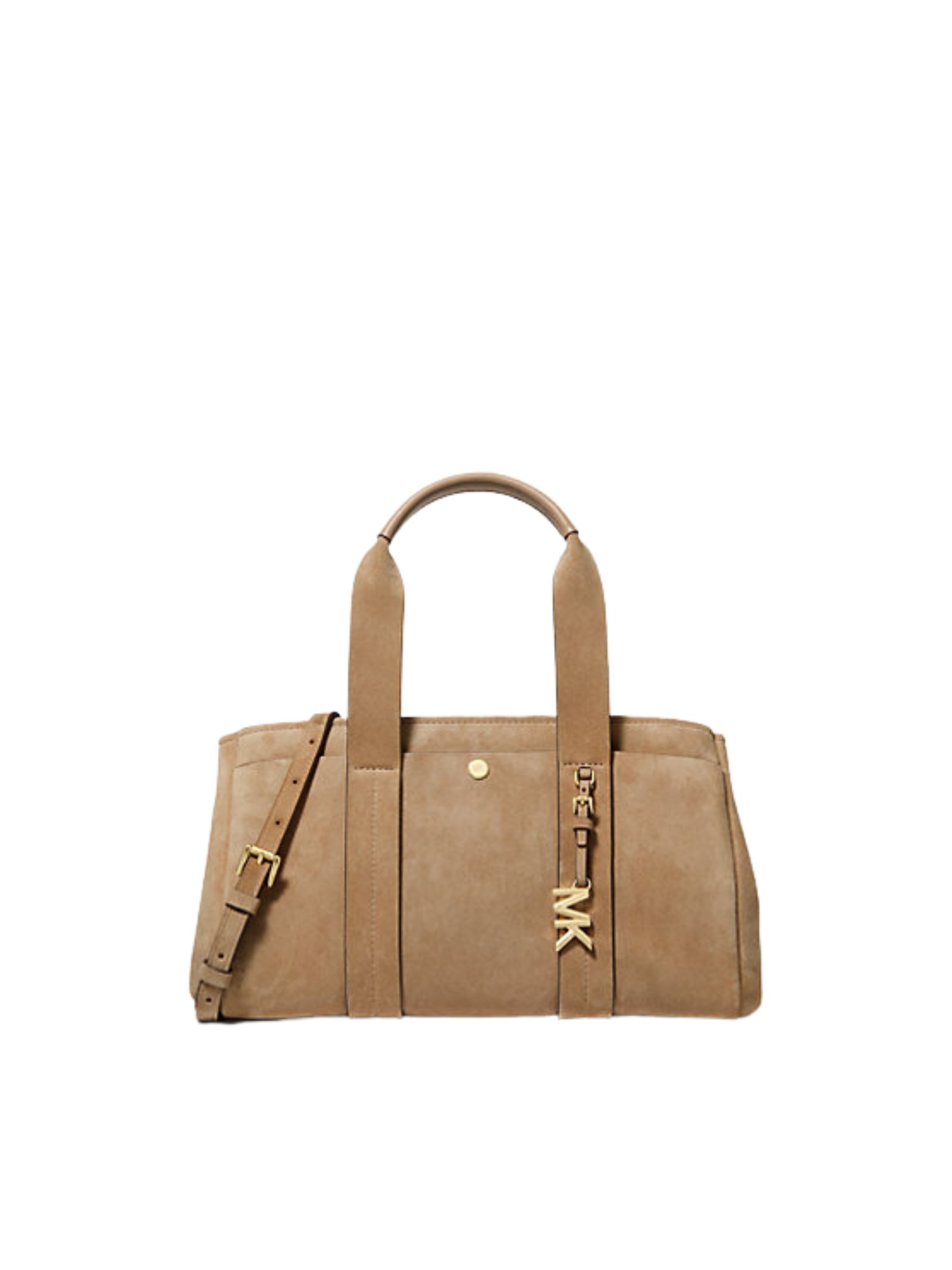La borsa a mano Romee è un modello dal fascino moderno e sofisticato, realizzato in morbida pelle scamosciata e impreziosito da un ciondolo con logo MK in metallo dorato. Dotata di robusti manici superiori e tracolla regolabile per un uso versatile, presenta una tasca anteriore con chiusura a scatto e una tasca interna a bustina. Completano il design la chiusura con zip e la fodera in misto tessuti pregiati. Dimensioni: 18,4 × 19 × 31,1 cm; altezza manico 15,2 cm; tracolla 48,354,6 cm.