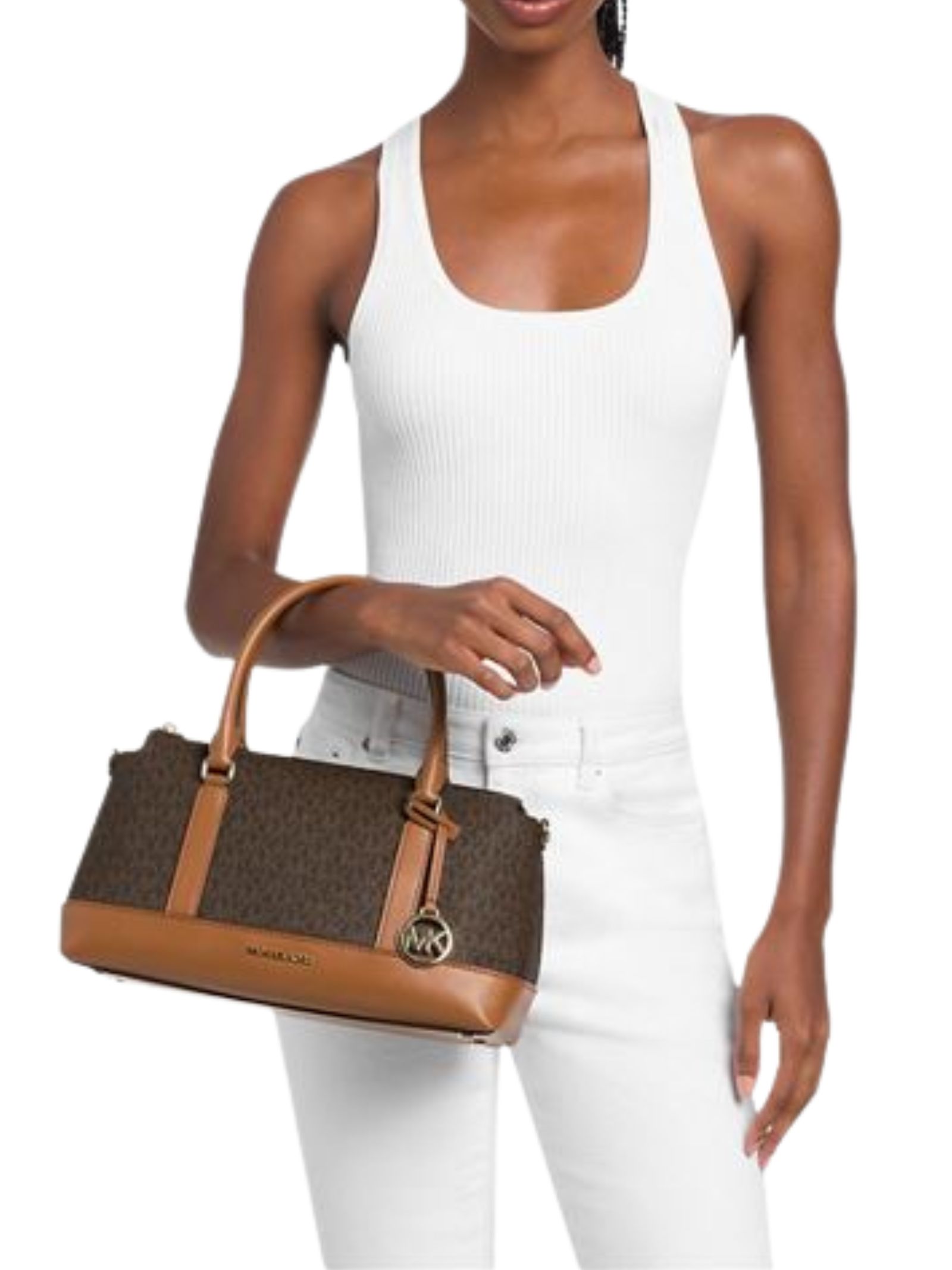 Borsa a mano Andie, intramontabile e alla moda, che unisce glamour e praticità. Realizzata in tela con stampa logo e finitura liscia, dotata di eleganti manici e tracolla regolabile e staccabile, perfetta per viaggi e spostamenti con stile. Misure: 34,3x19x16,5 cm, altezza manico 11,4 cm e tracolla regolabile. Composizione: tela con stampa logo.