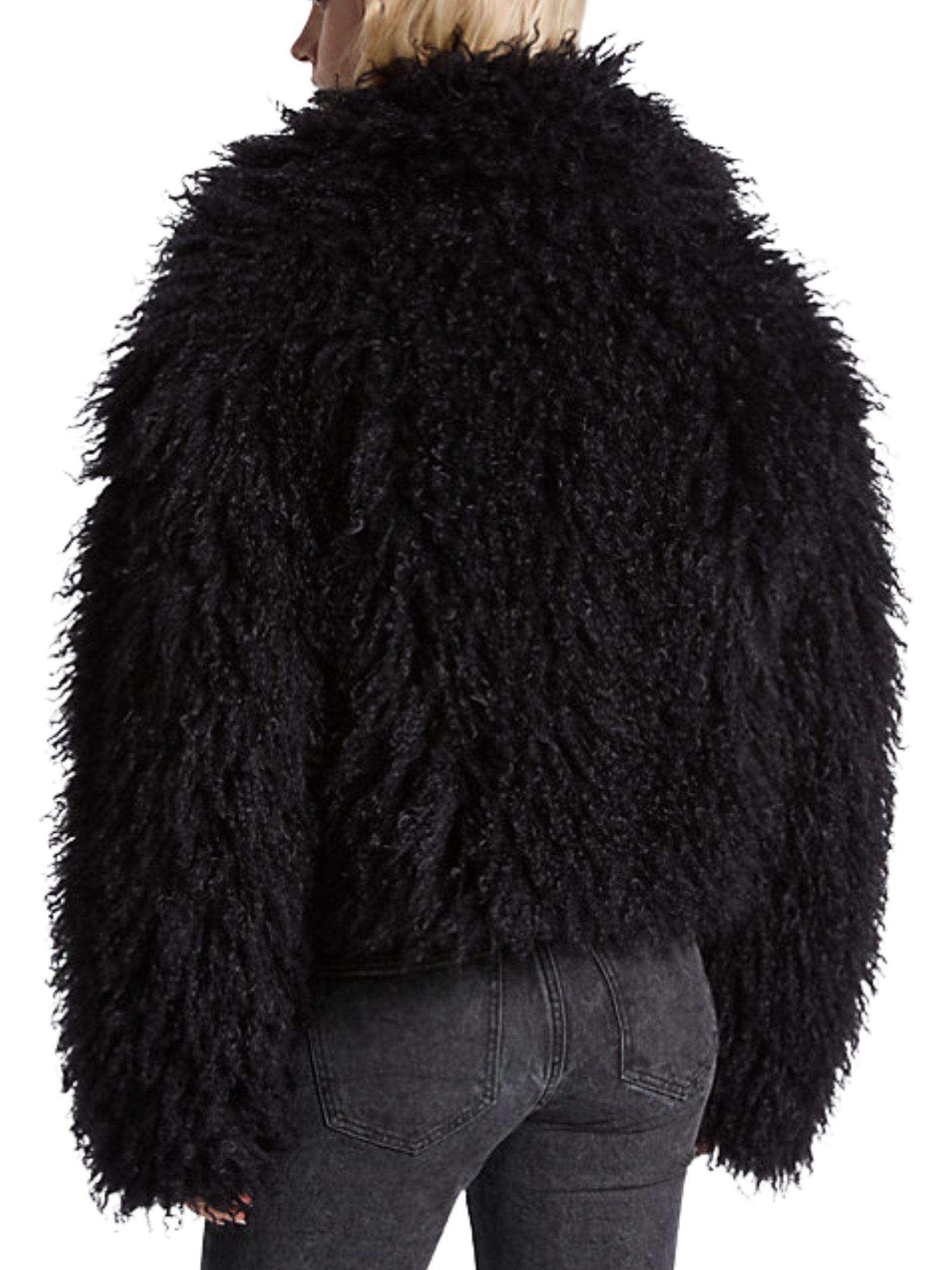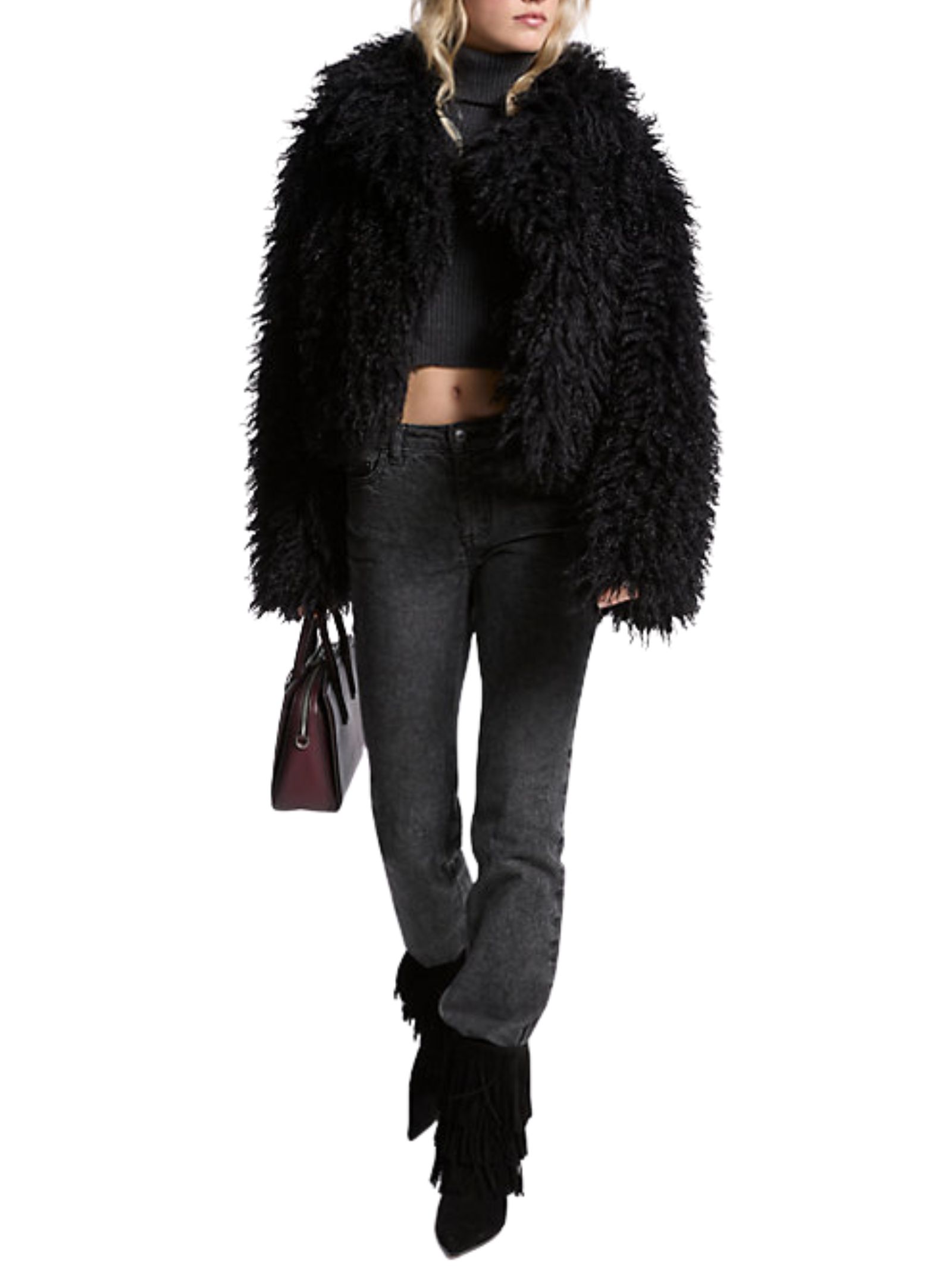Giacca in pelliccia sintetica con silhouette ispirata a un caban aggiunge un fascino senza tempo. Taglio cropped con look moderno. Composizione 100% poliestere