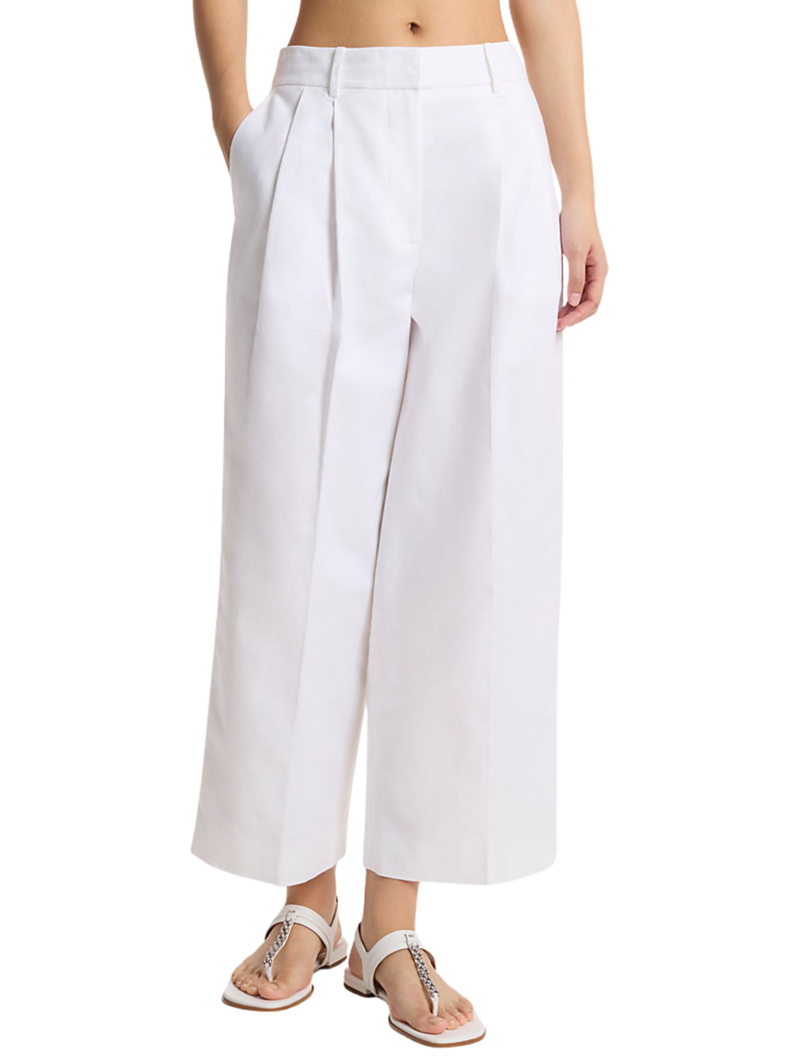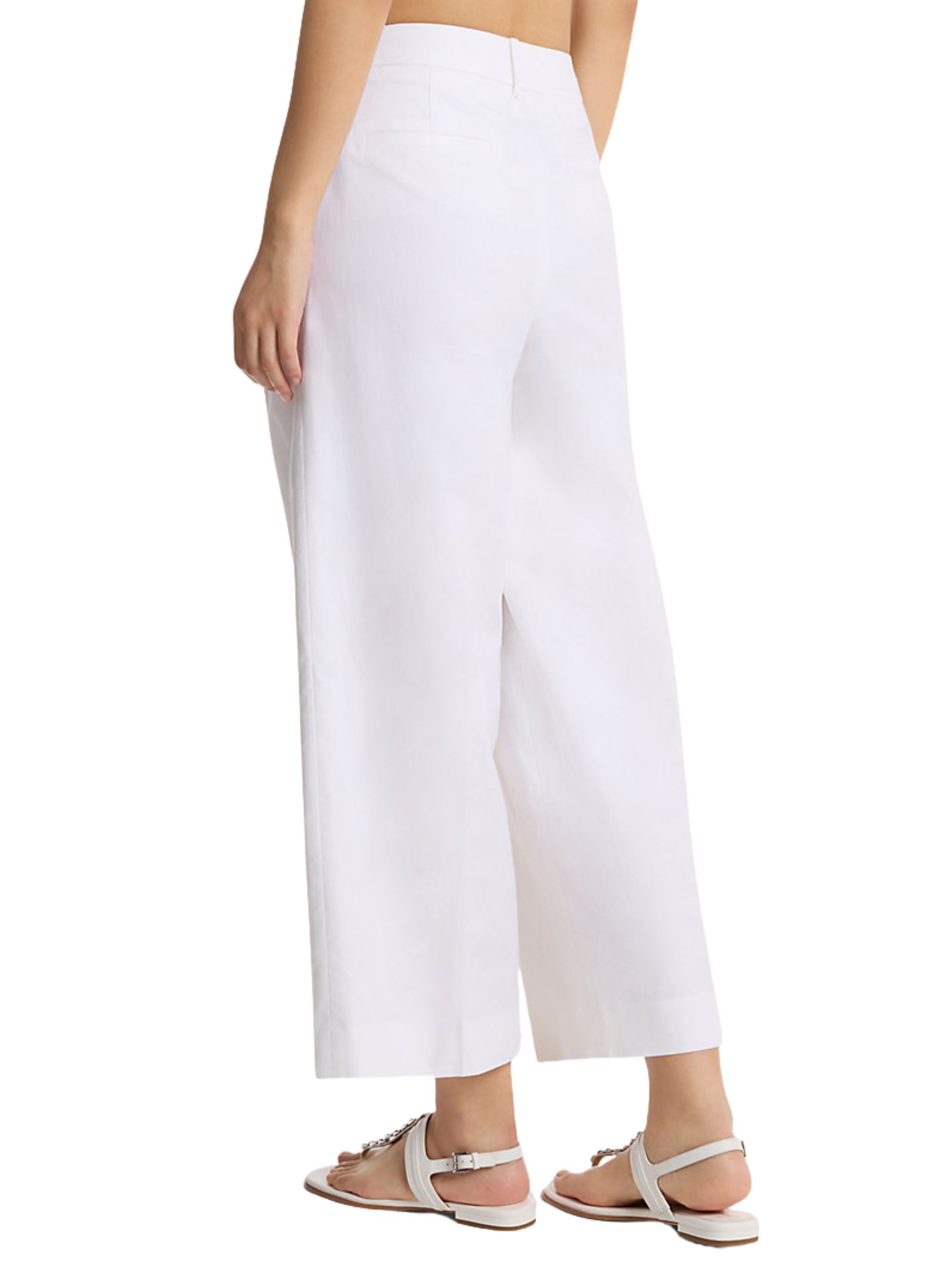 Pantaloni con pinces realizzati in confortevole tessuto traspirante di misto cotone e lino. Il taglio a gamba ampia è valorizzato da pieghe stirate e morbida plissettatura, creando una silhouette raffinata ma comoda.Chiusura con gancio e zip, sono ideali da abbinare a una canotta cropped e sandali per un look estivo sofisticato e versatile. Composizione: 52% lino, 48% cotone.