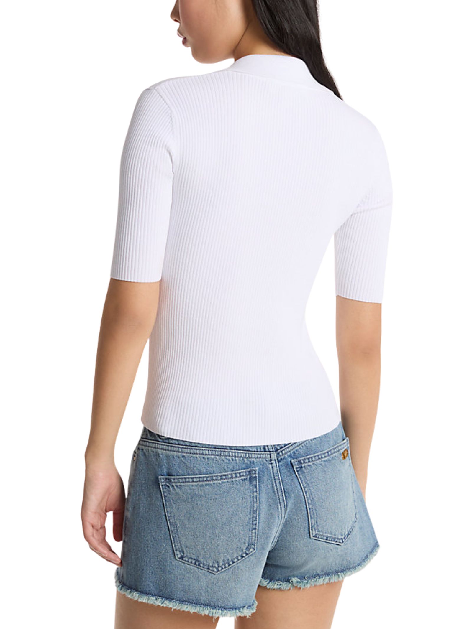 Polo in viscosa stretch a coste con dettagli in pizzo, raffinata e versatile, combina eleganza e comfort; vestibilità aderente e delicati inserti in pizzo sul davanti aggiungono un tocco sofisticato e femminile; perfetta da abbinare a un paio di jeans e sabot bassi per un look chic e informale.Un capo elegante e contemporaneo, ideale per cene informali o look casual chic. Composizione: 53% viscosa, 45% nylon, 2% elastan.