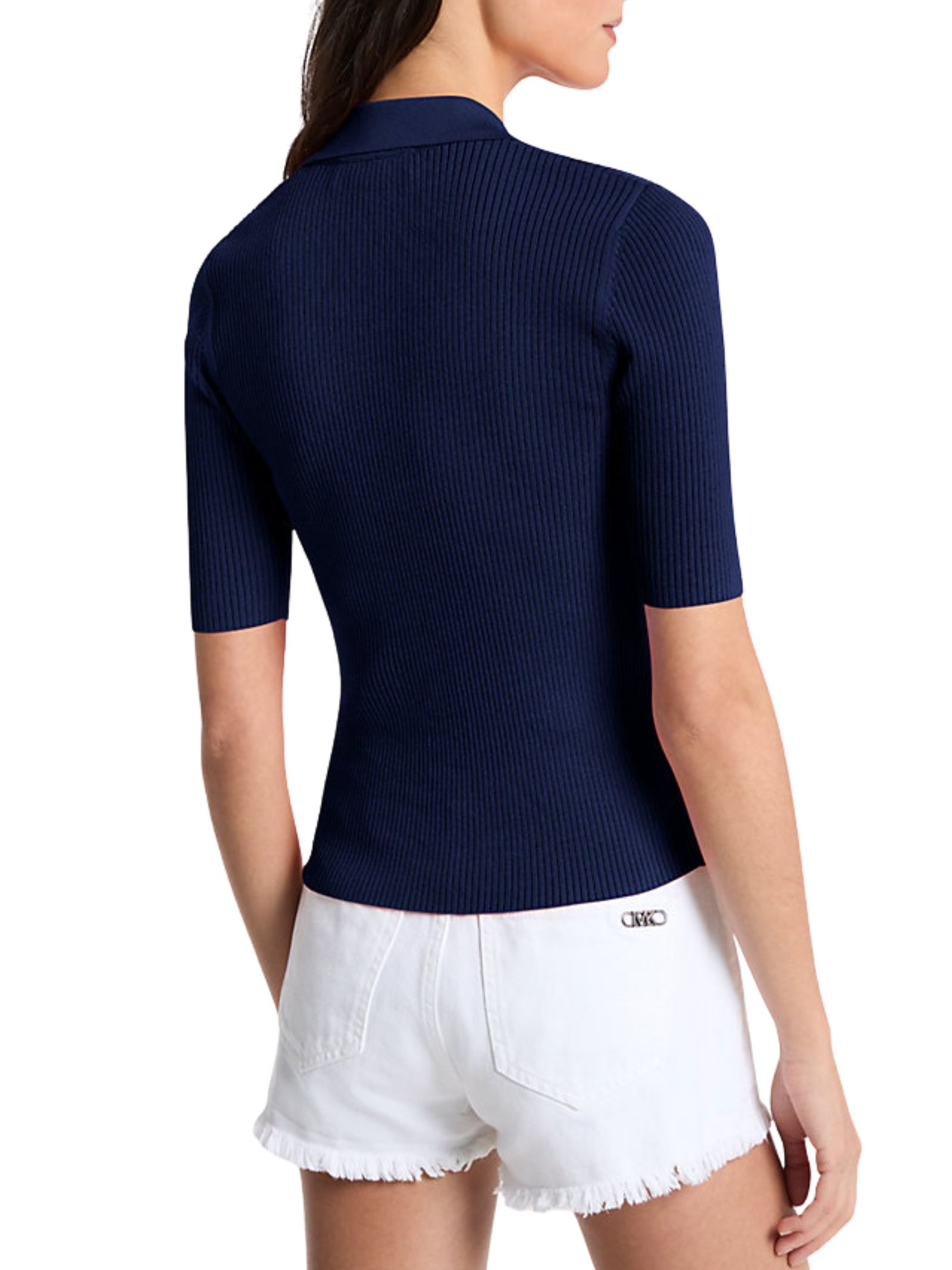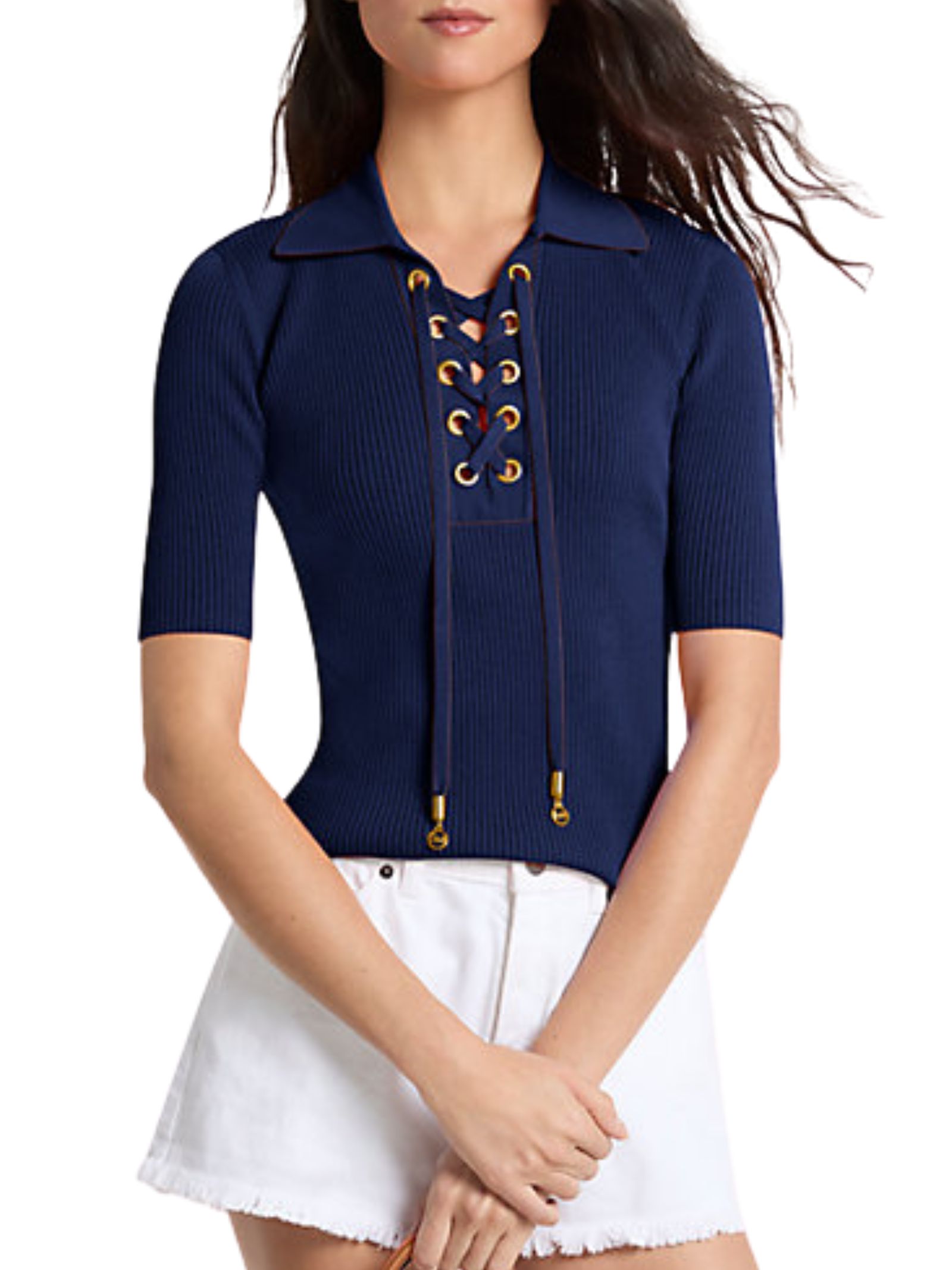 Polo in viscosa stretch a coste con dettagli in pizzo, raffinata e versatile, combina eleganza e comfort; vestibilità aderente e delicati inserti in pizzo sul davanti aggiungono un tocco sofisticato e femminile; perfetta da abbinare a un paio di jeans e sabot bassi per un look chic e informale.Un capo elegante e contemporaneo, ideale per cene informali o look casual chic. Composizione: 53% viscosa, 45% nylon, 2% elastan.